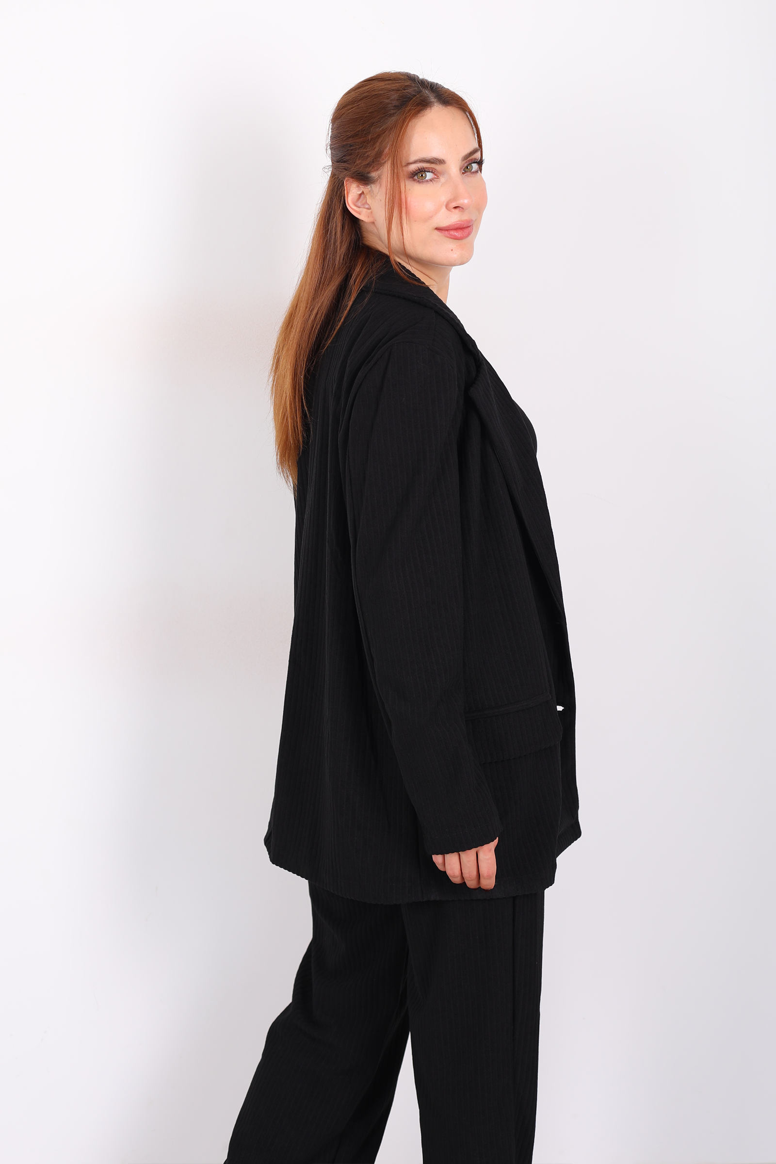Çift Cep Görünümlü Kadife Siyah Kadın Blazer Ceket