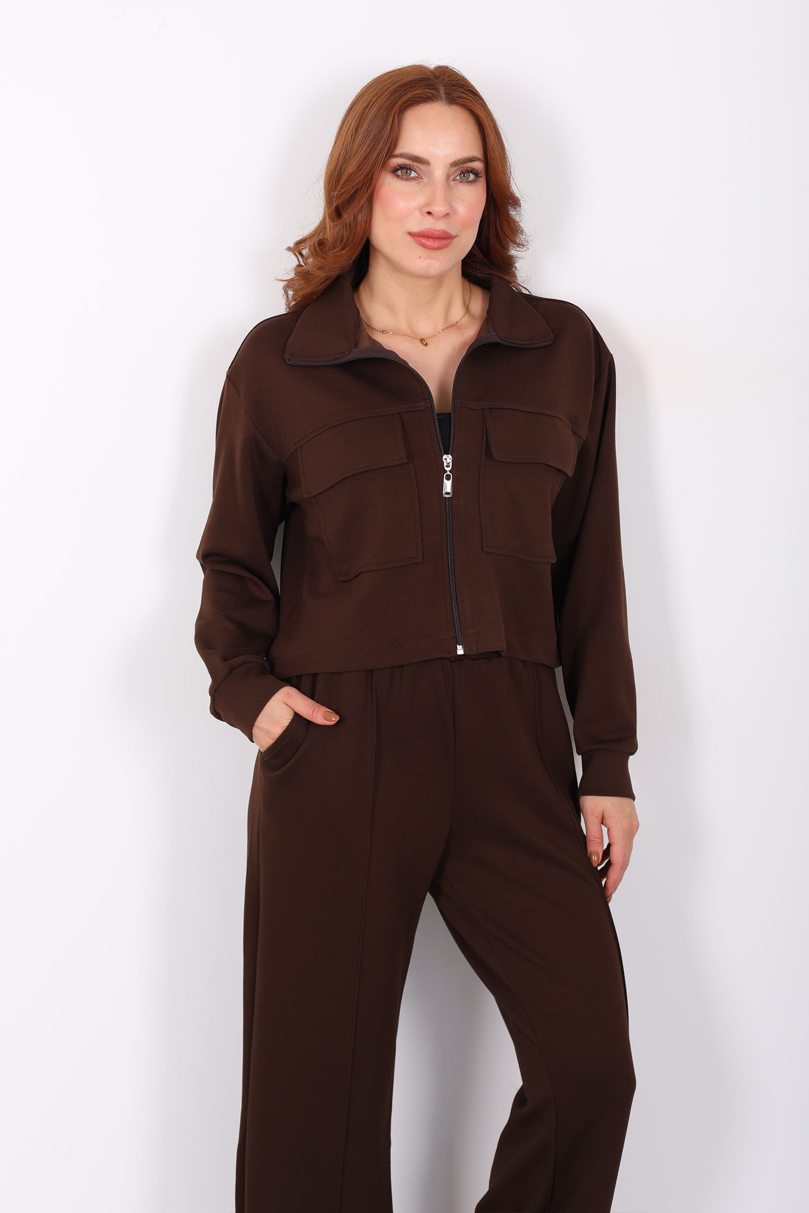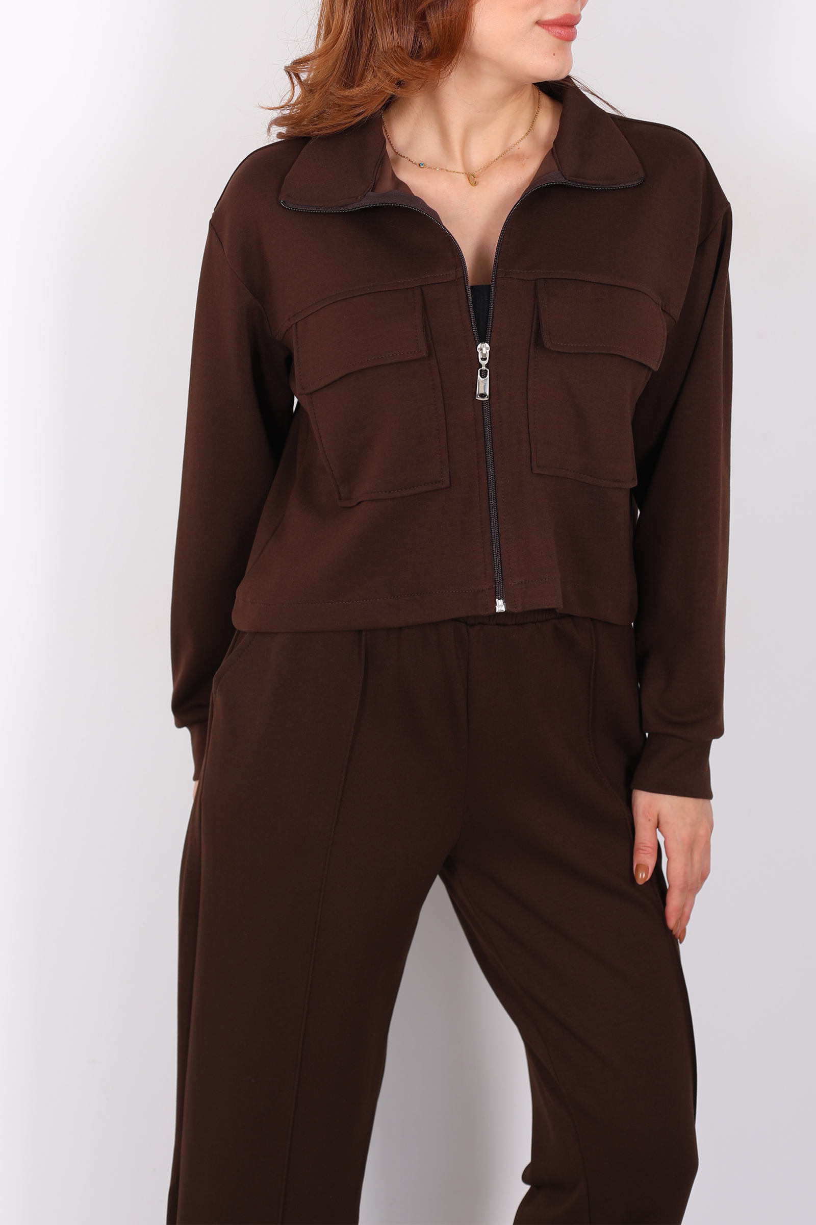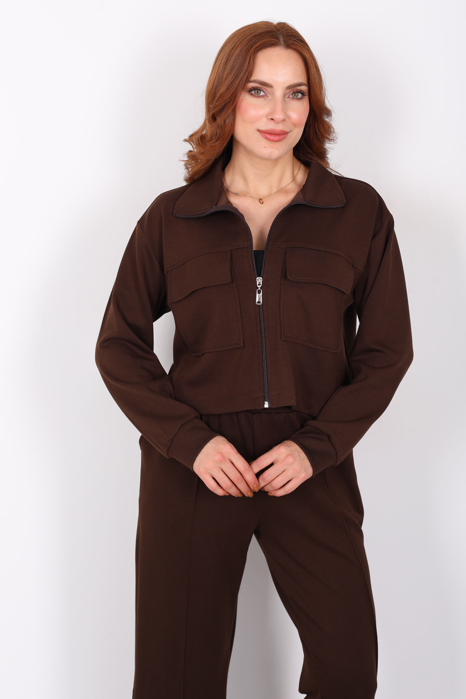Çift Cep Kapaklı Fermuarlı Kahverengi Kadın Takım