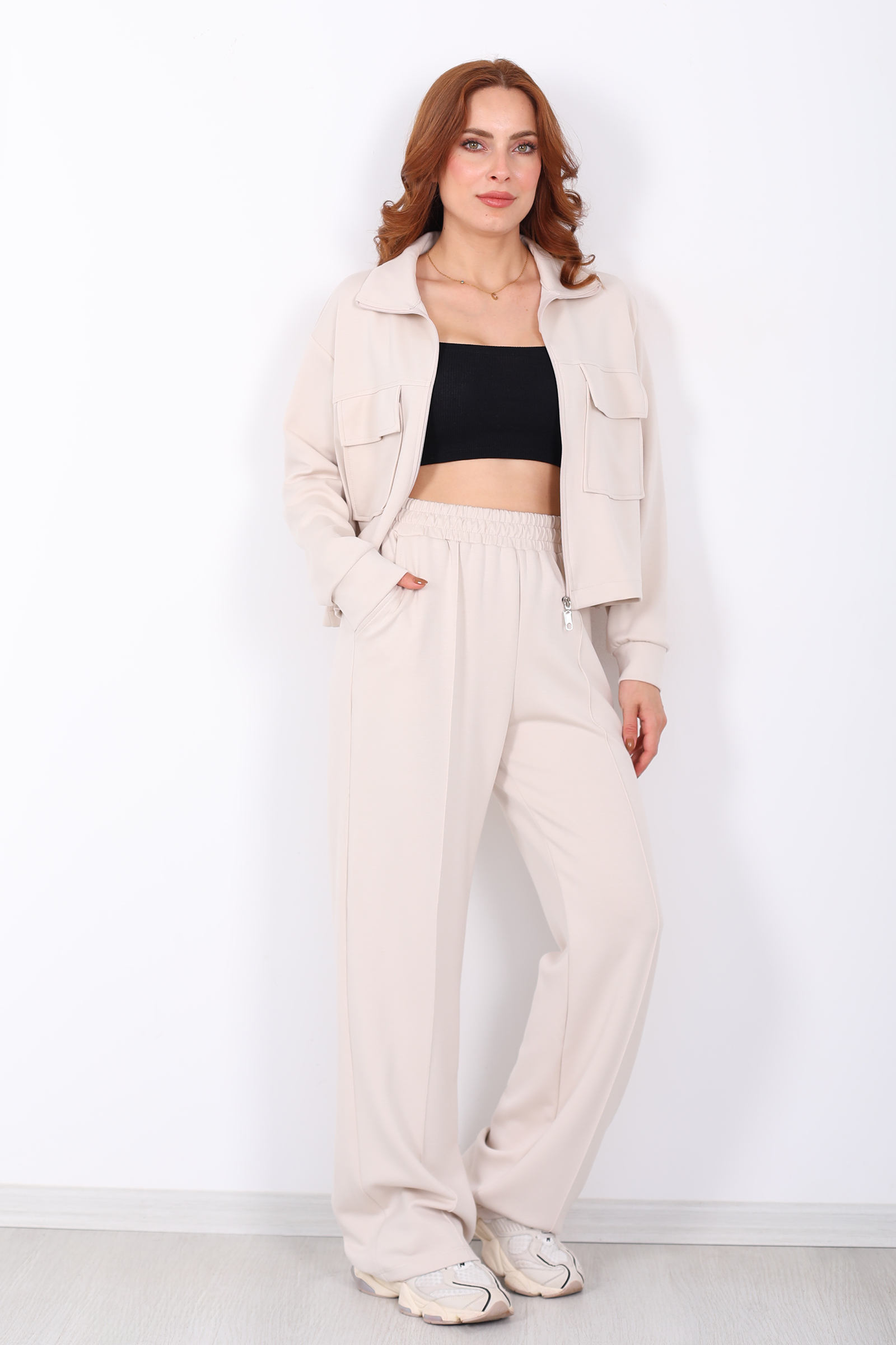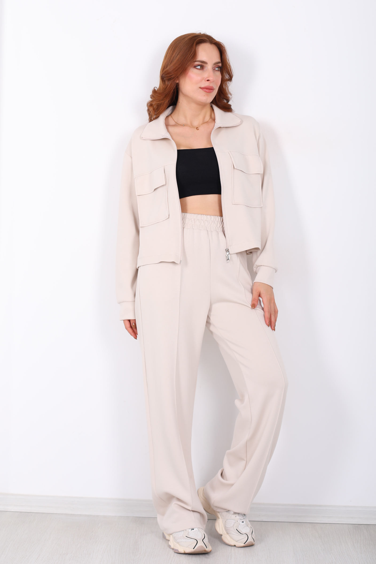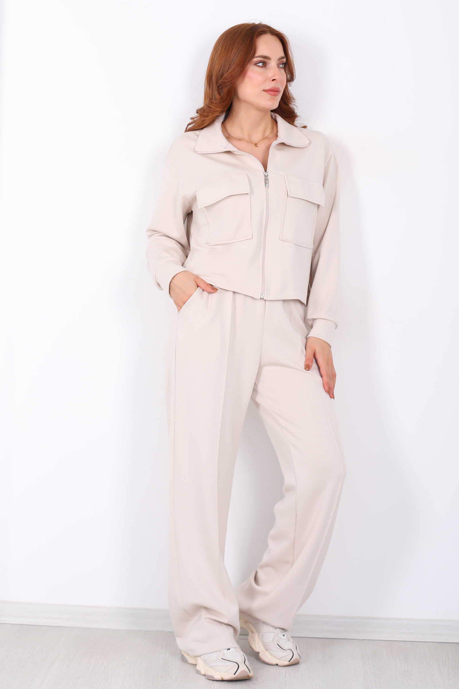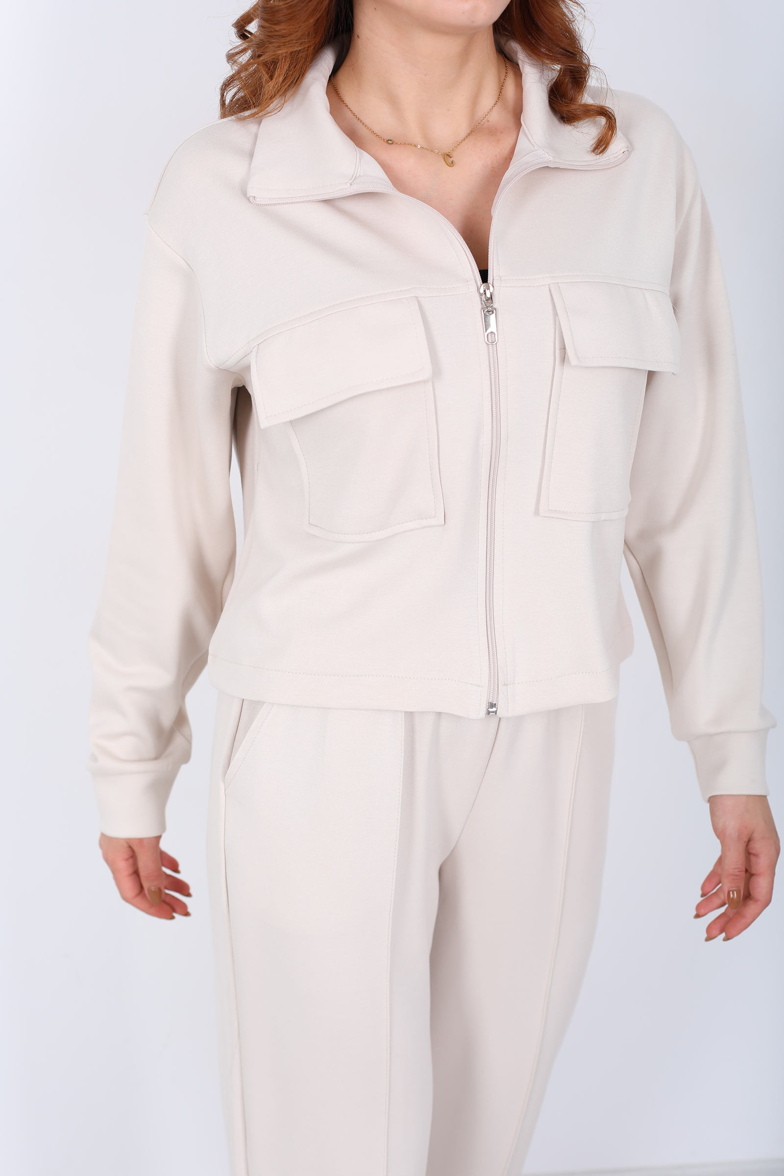 Çift Cep Kapaklı Fermuarlı Krem Kadın Takım