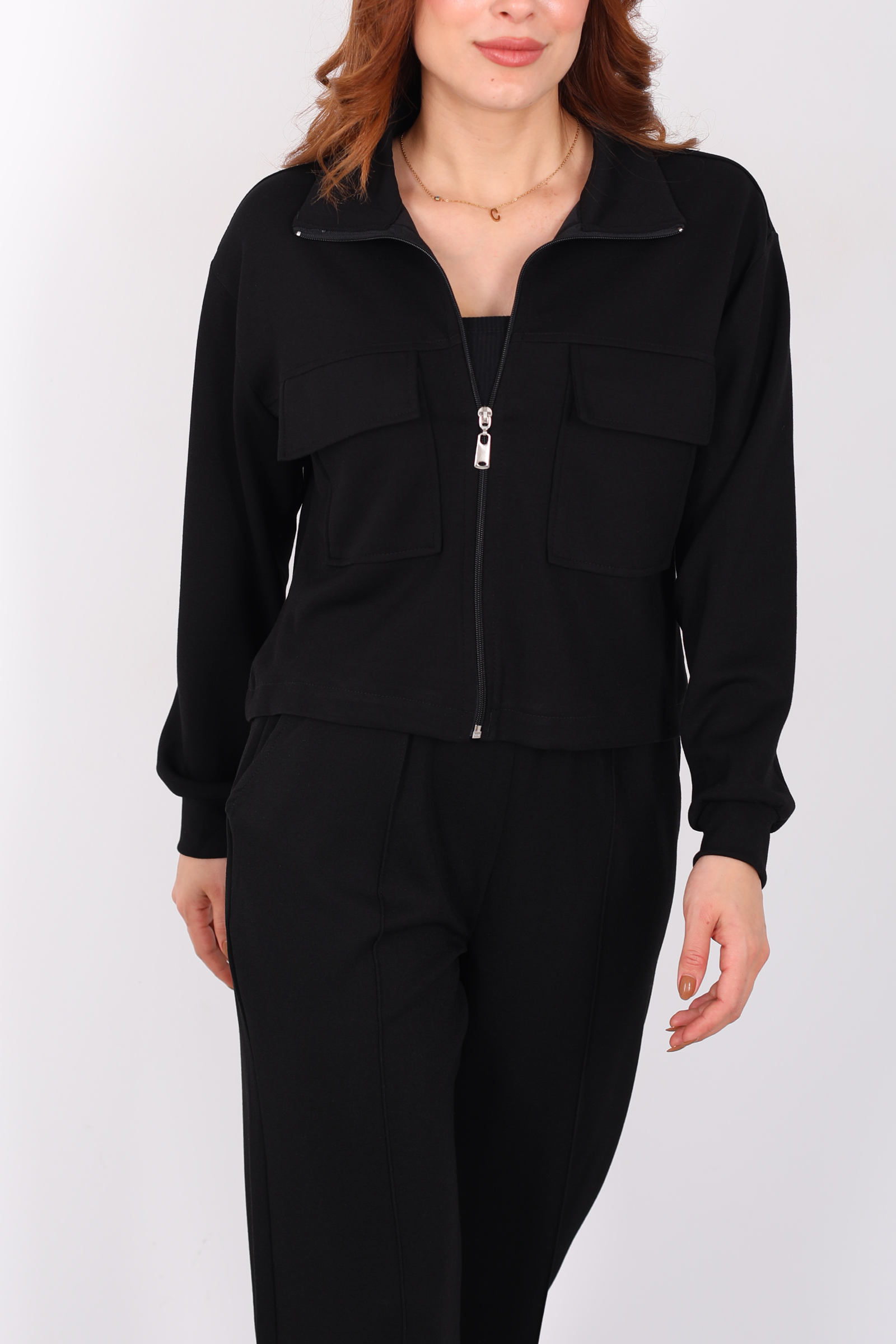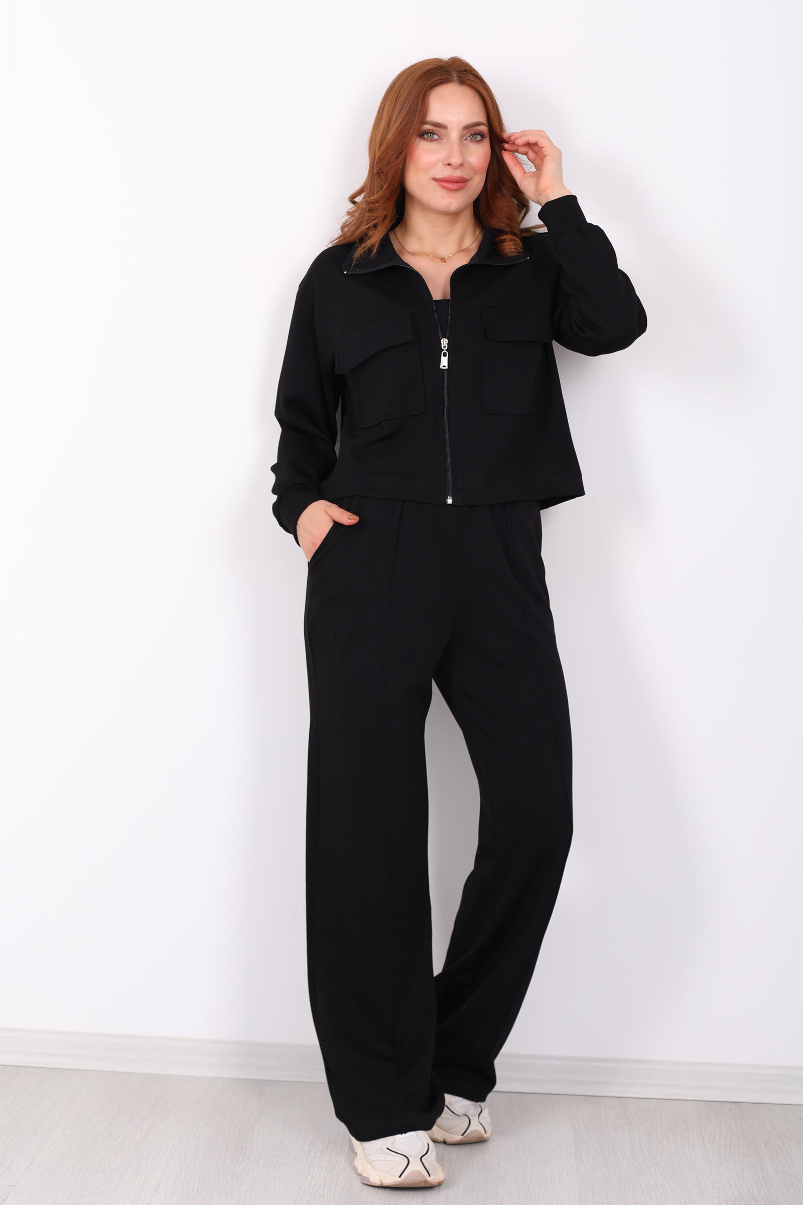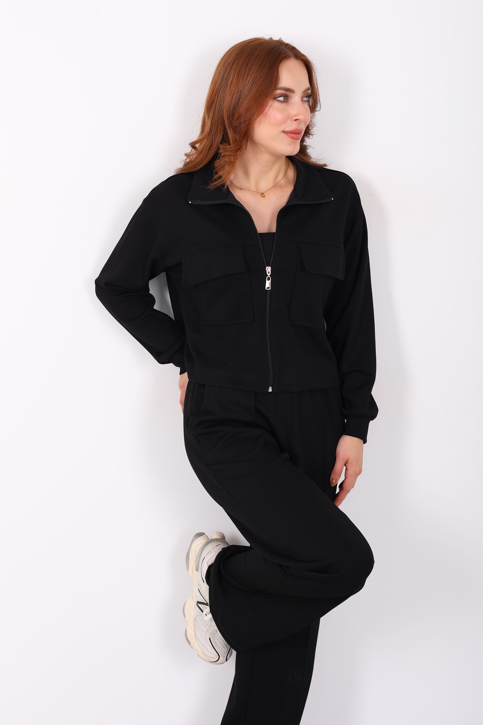 Çift Cep Kapaklı Fermuarlı Siyah Kadın Takım