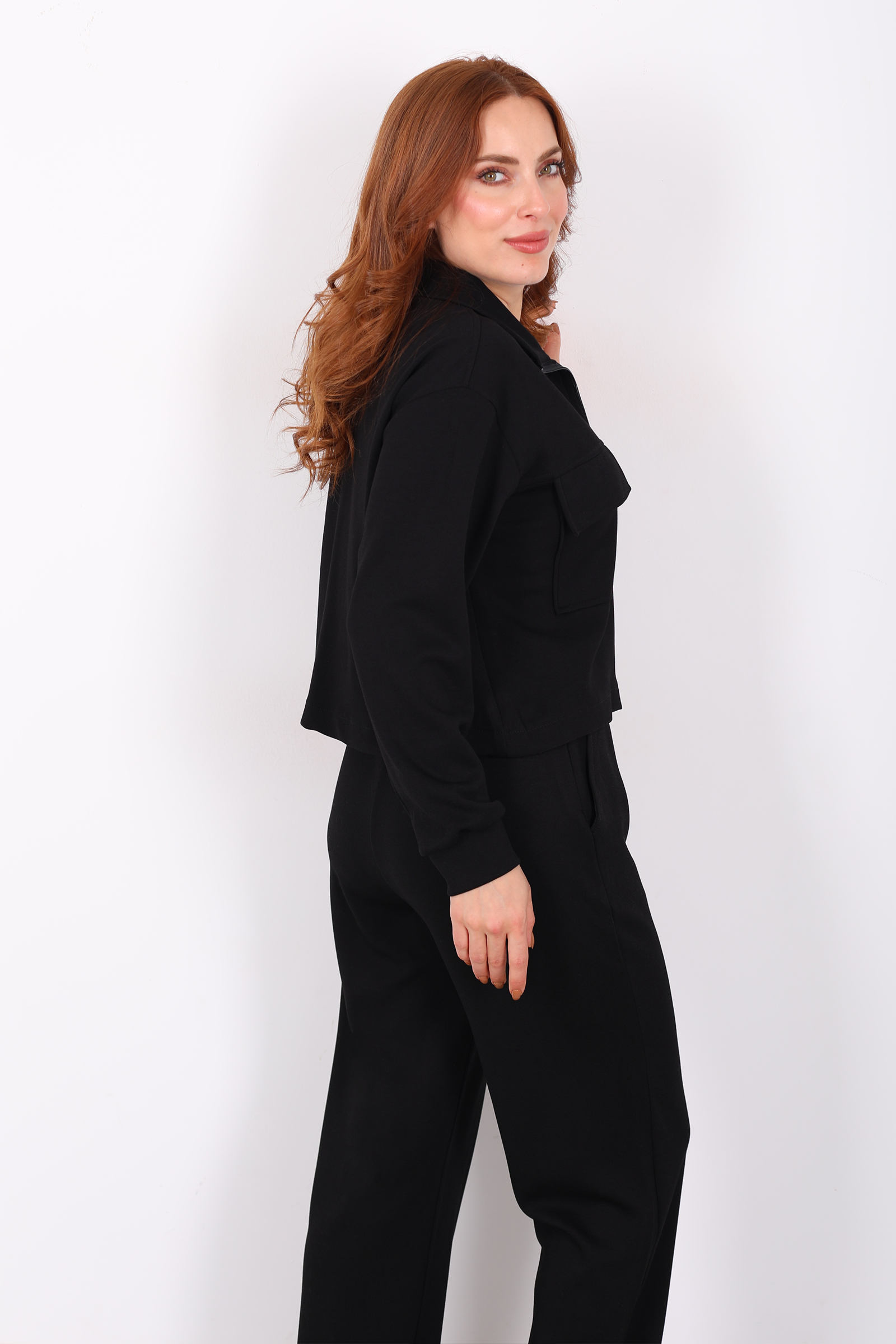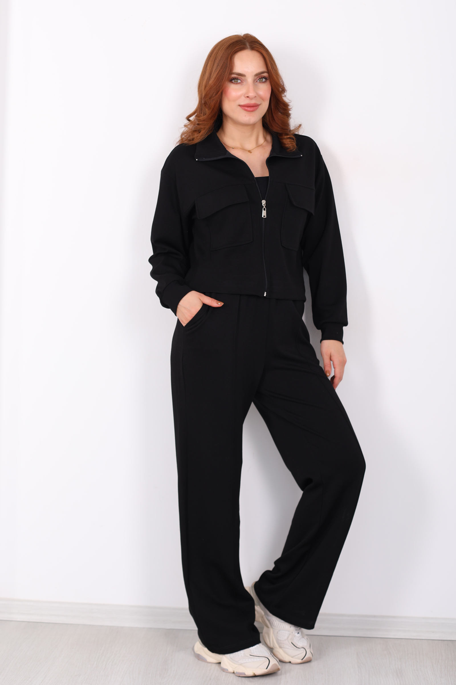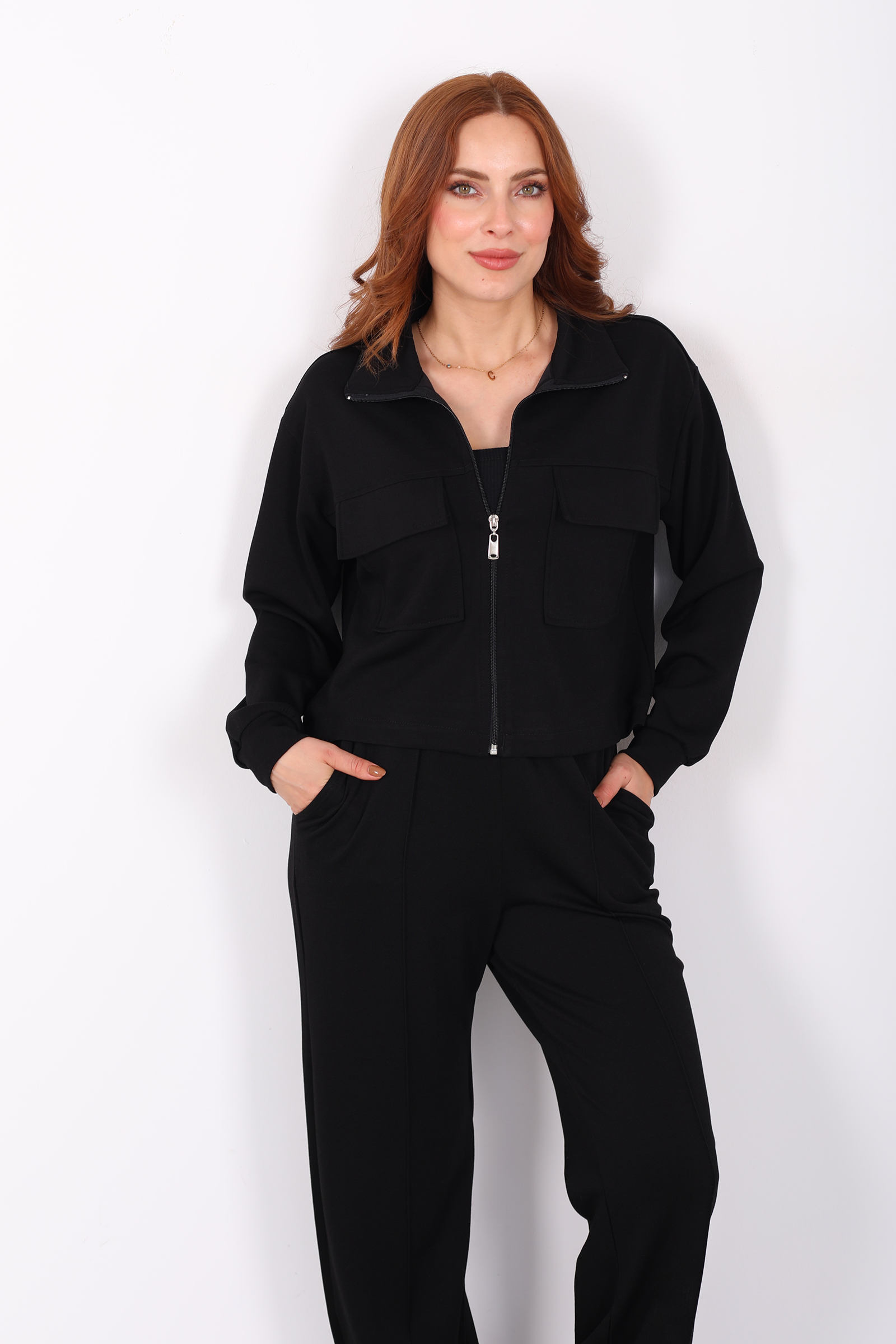 Çift Cep Kapaklı Fermuarlı Siyah Kadın Takım