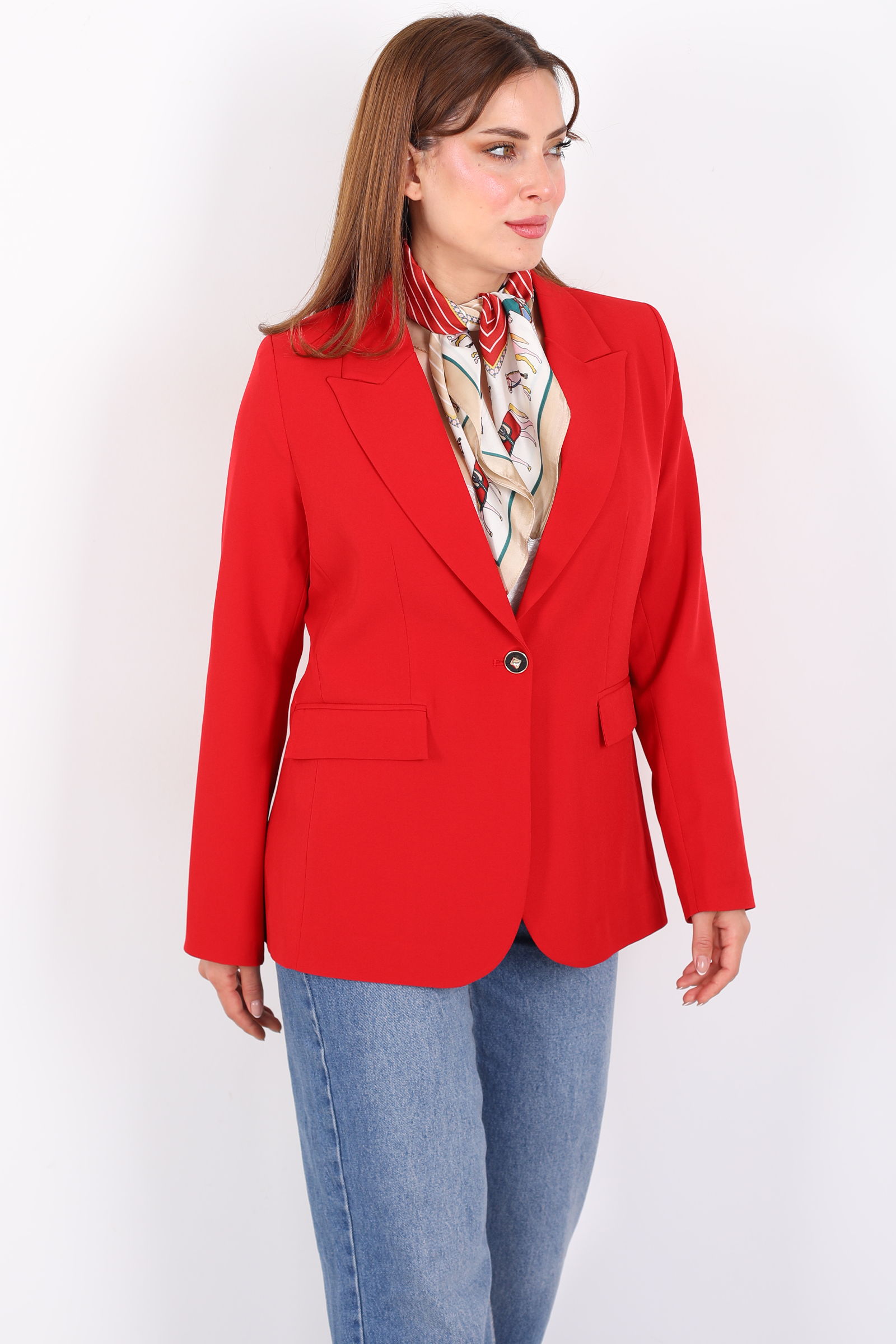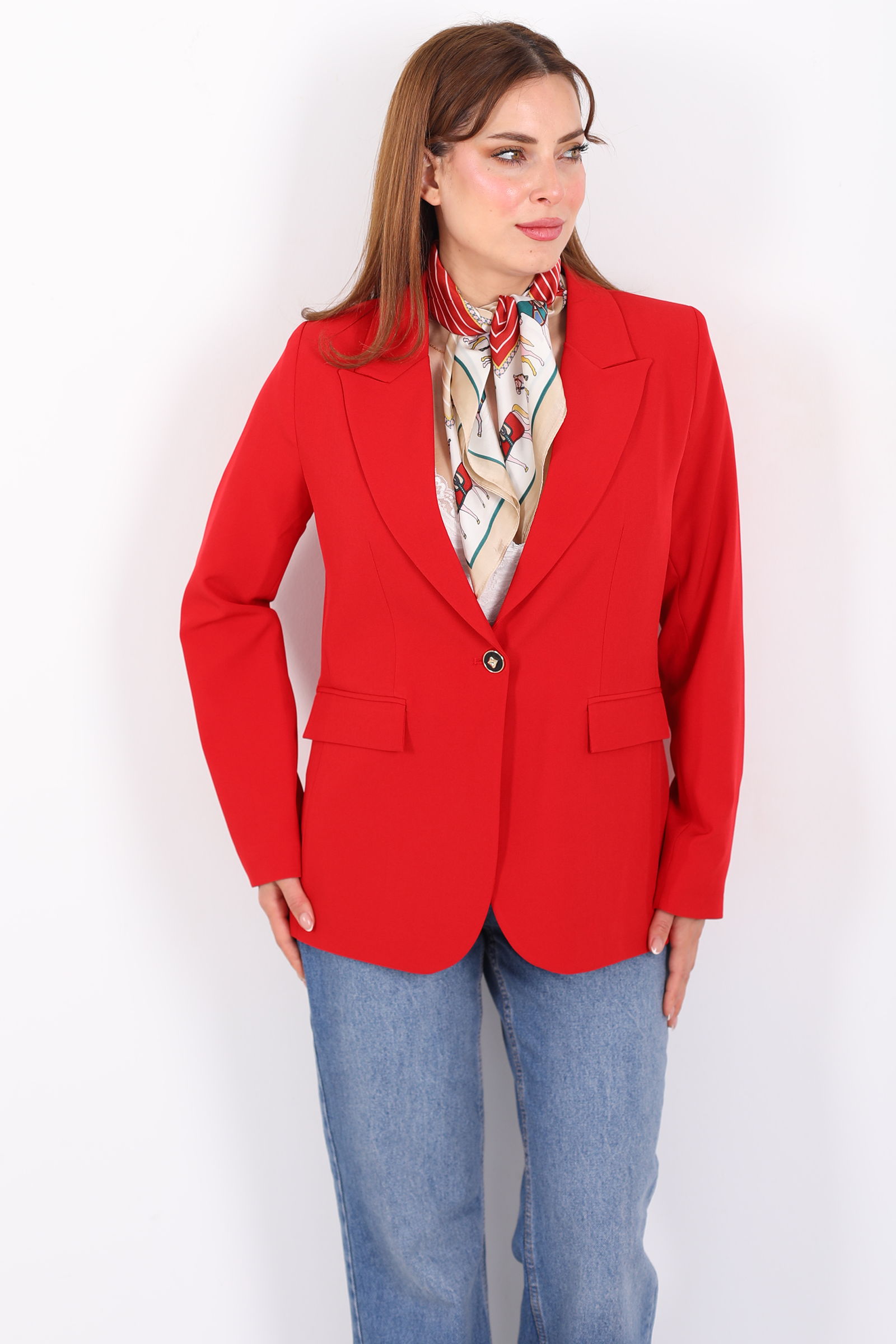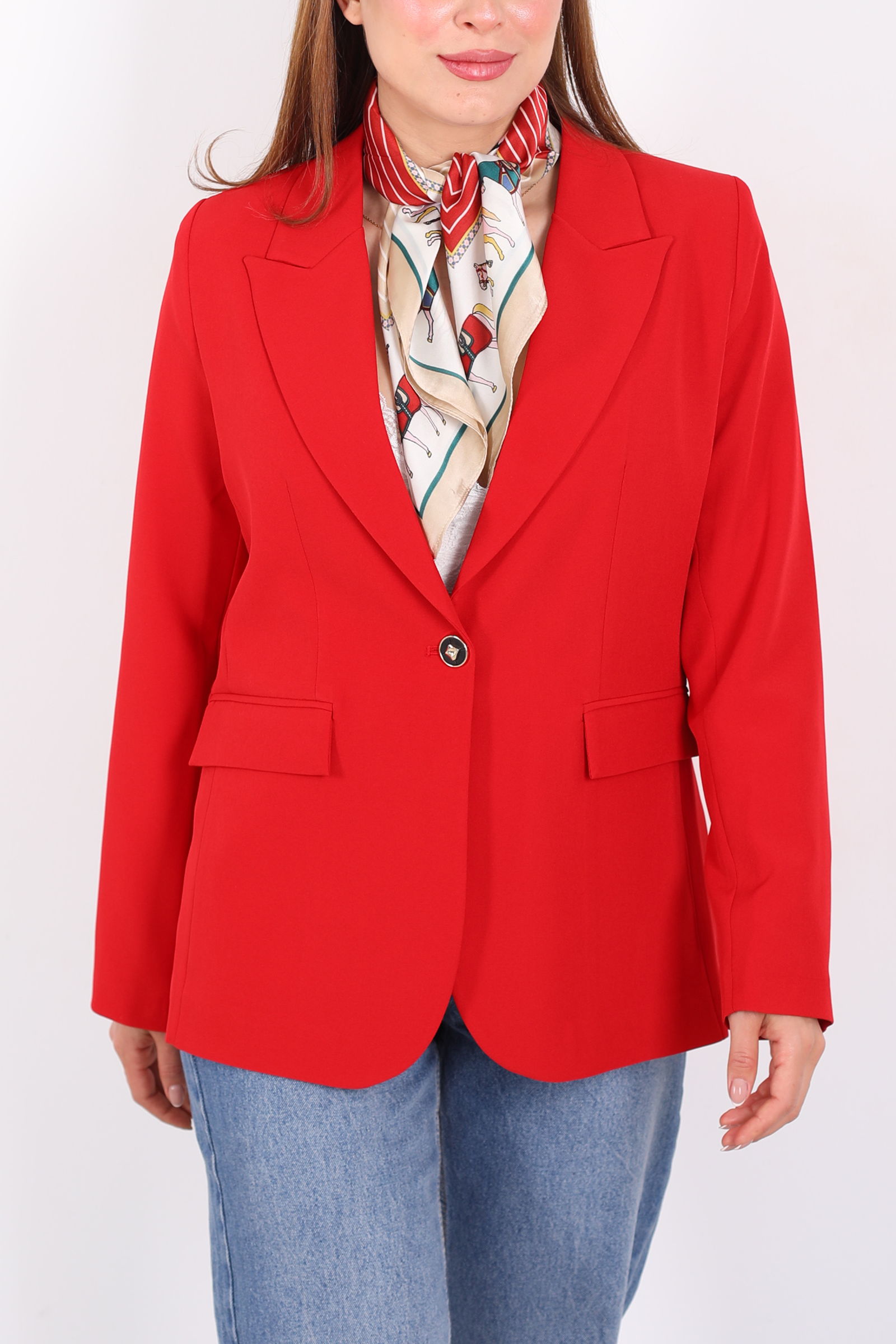 Çift Cep Kapaklı Gold Düğmeli Kırmızı Kadın Blazer Ceket