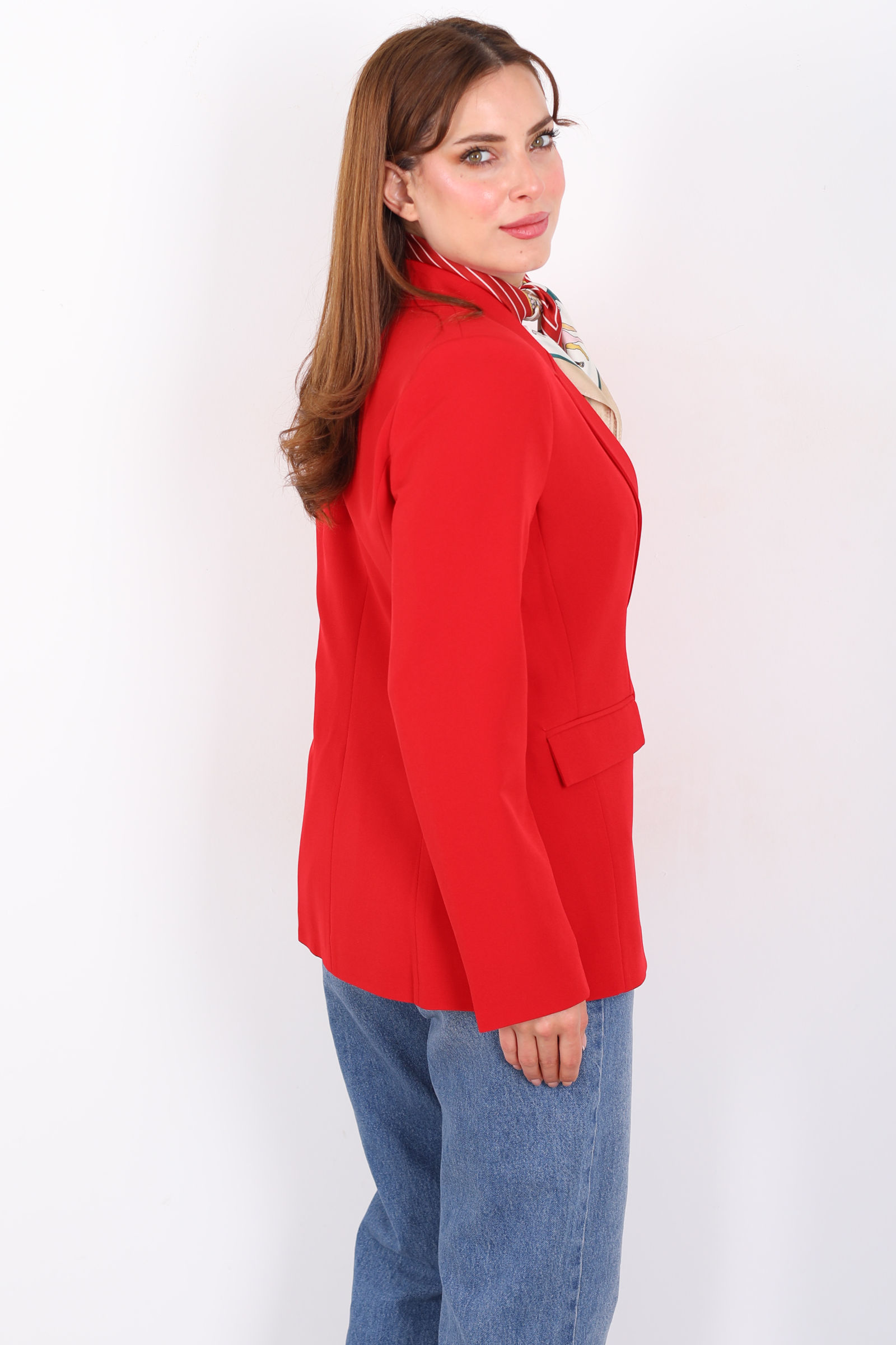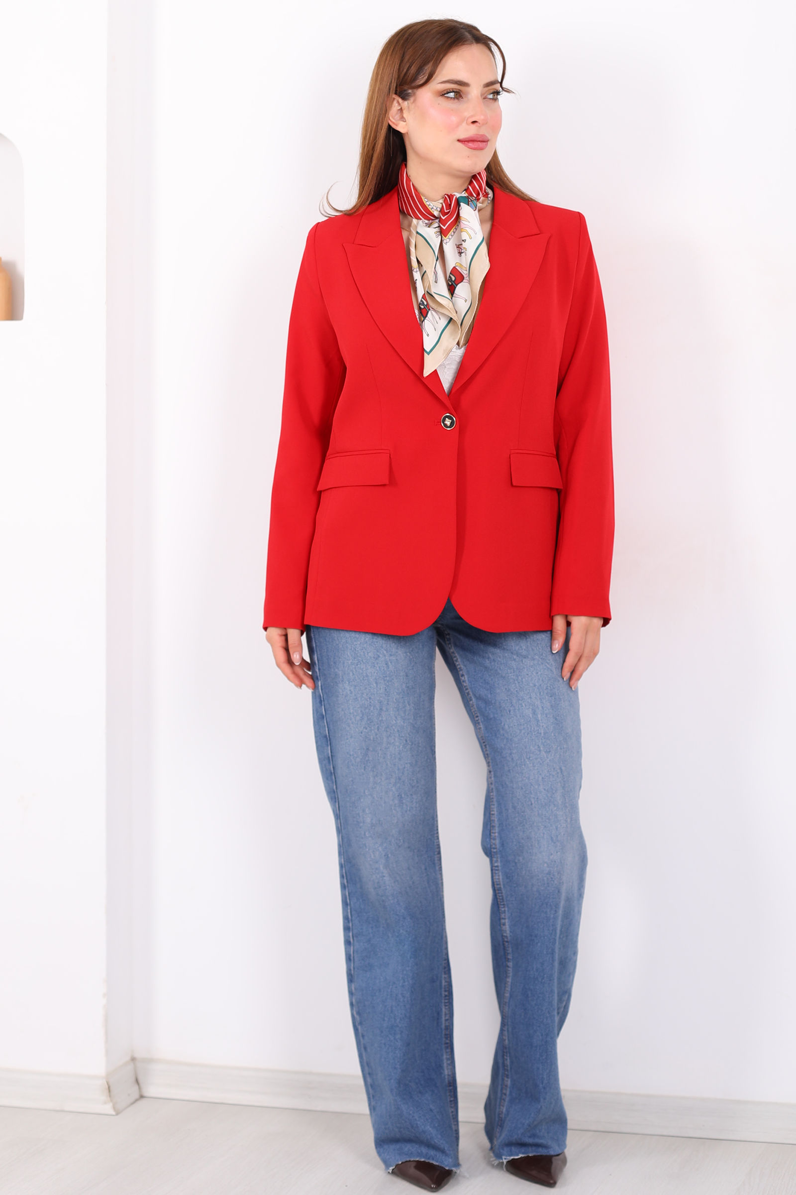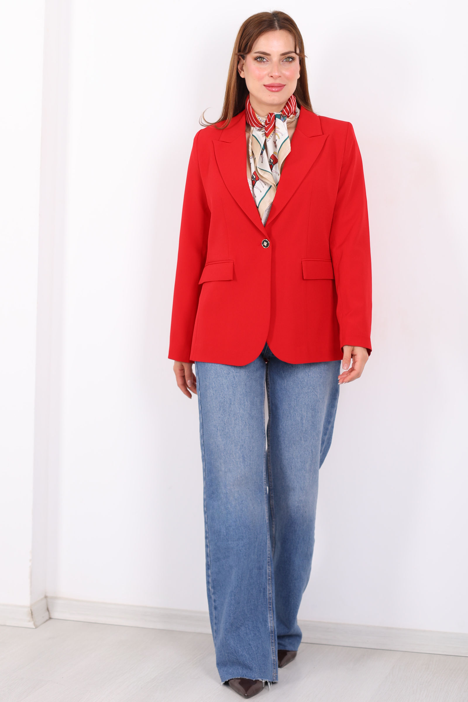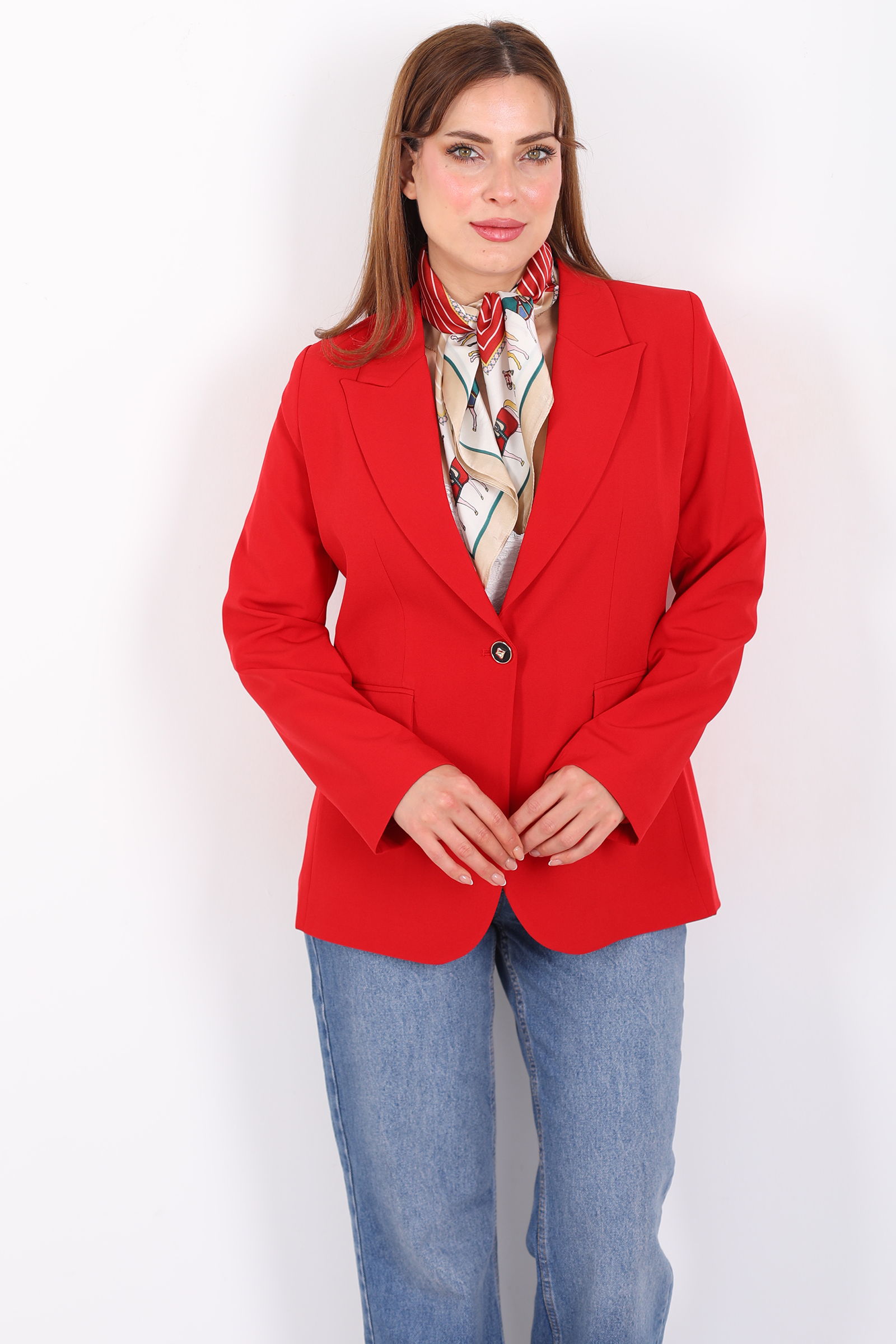Çift Cep Kapaklı Gold Düğmeli Kırmızı Kadın Blazer Ceket