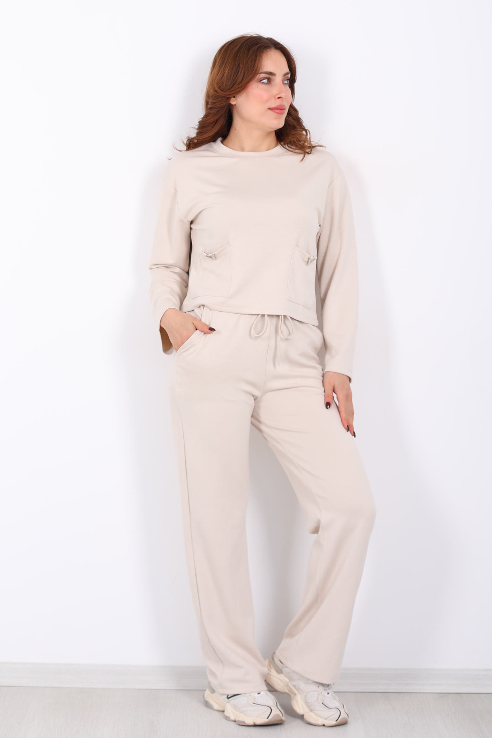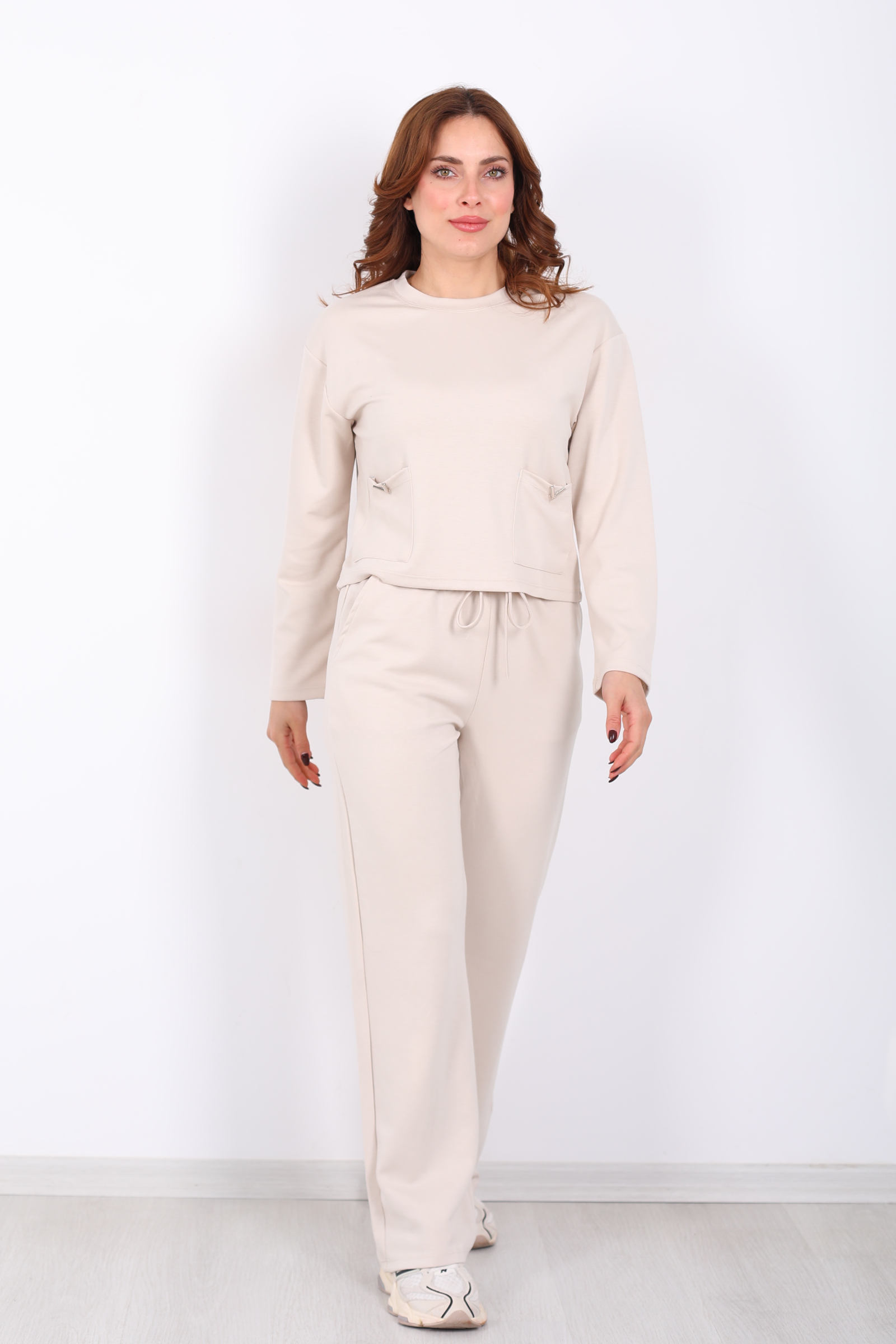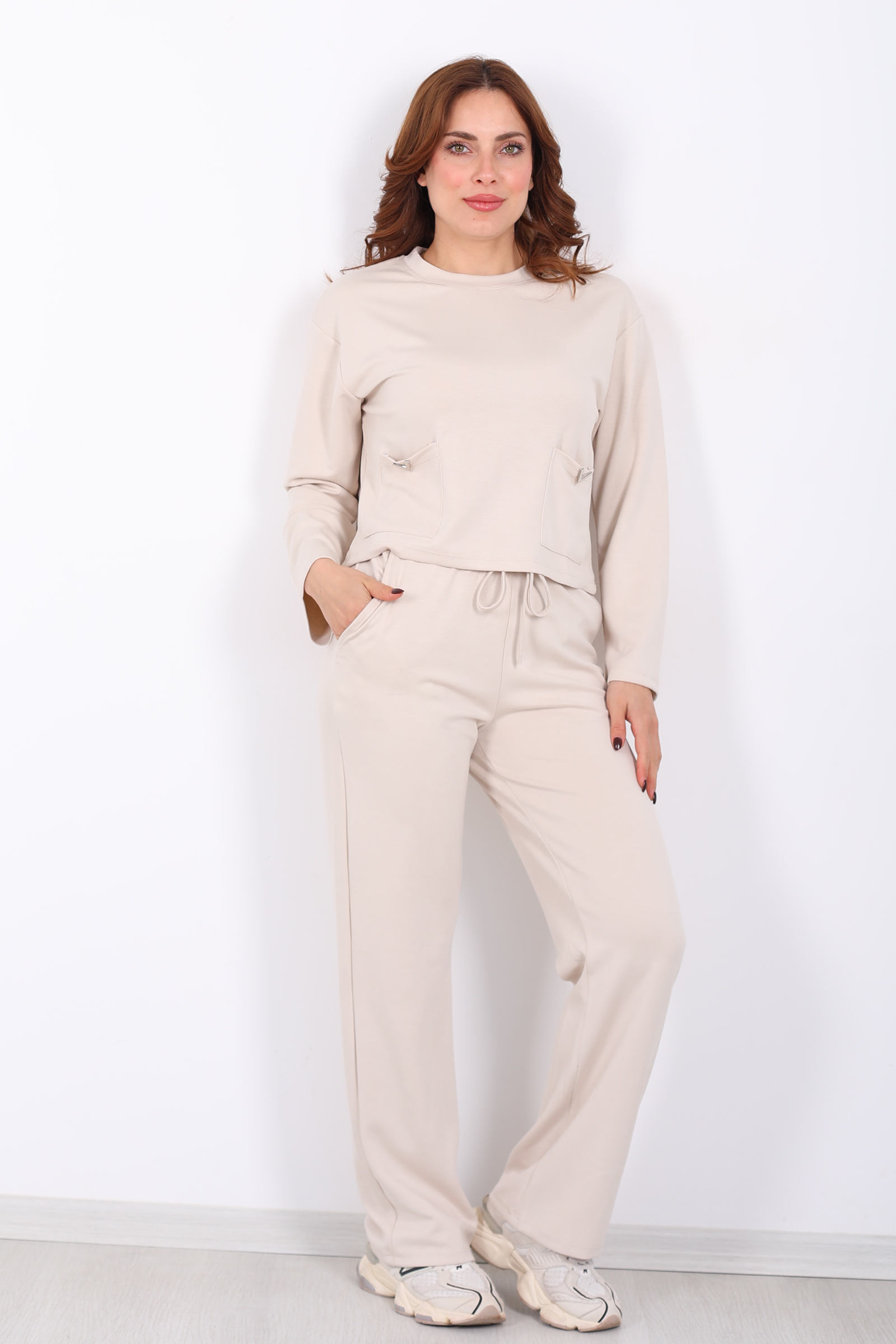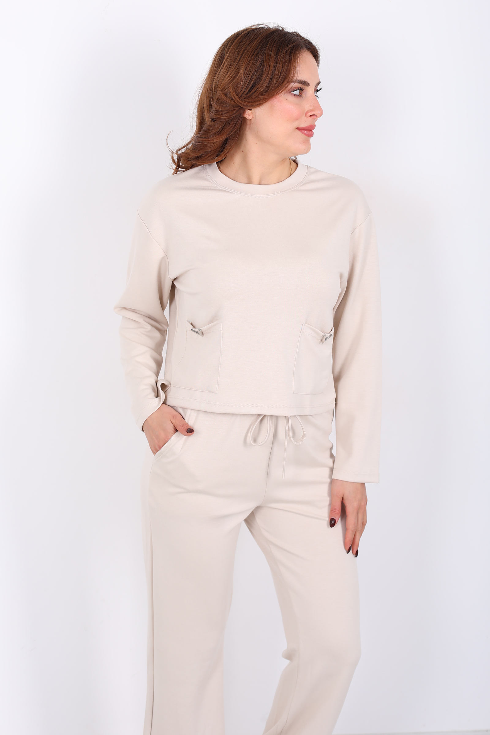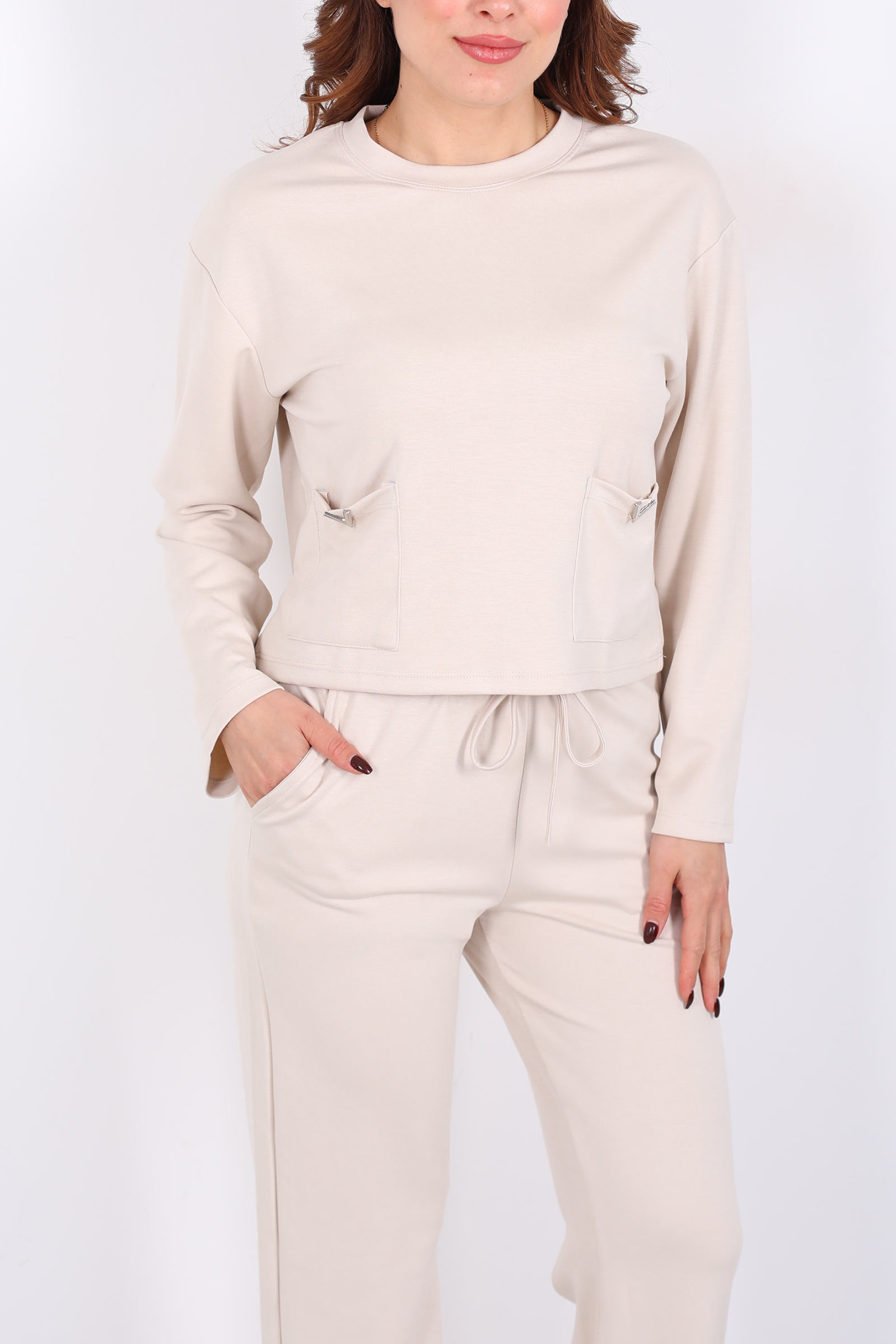 Çift Cepli Aksesuarli Detaylı Krem Kadın Pantolon Takım, sıcak krem tonunun sade zarafetini çağdaş tasarım detaylarıyla birleştirir. Çift cepli yapısı, pratikliği stil ile buluştururken, şık aksesuar detayları kombine modern bir dokunuş ekler. Takımın uyumlu üst ve pantolon parçaları, günlük gardırobunuzda hem konforlu hem de stil sahibi bir duruş yaratır. Krem rengi, jean’den kumaş pantolona kadar pek çok alt parçayla kolay kombinlenirken sade ama etkileyici bir görünüm sunar.