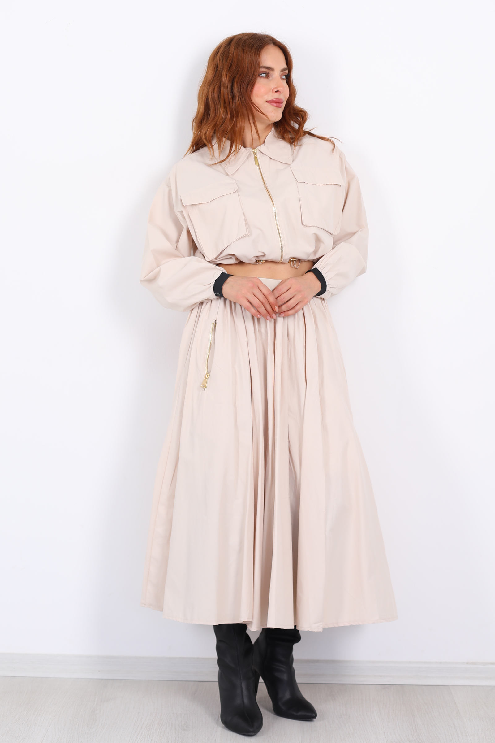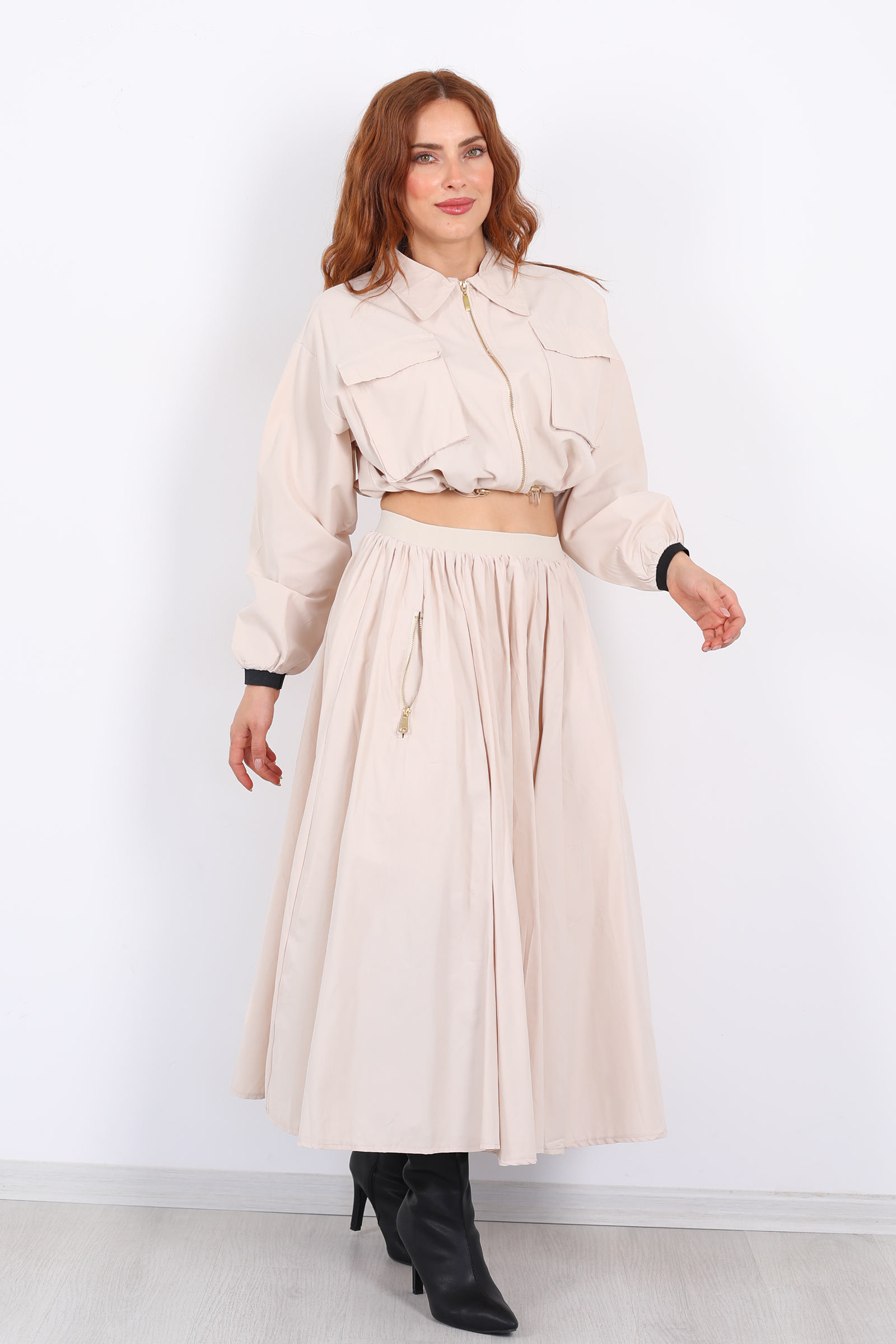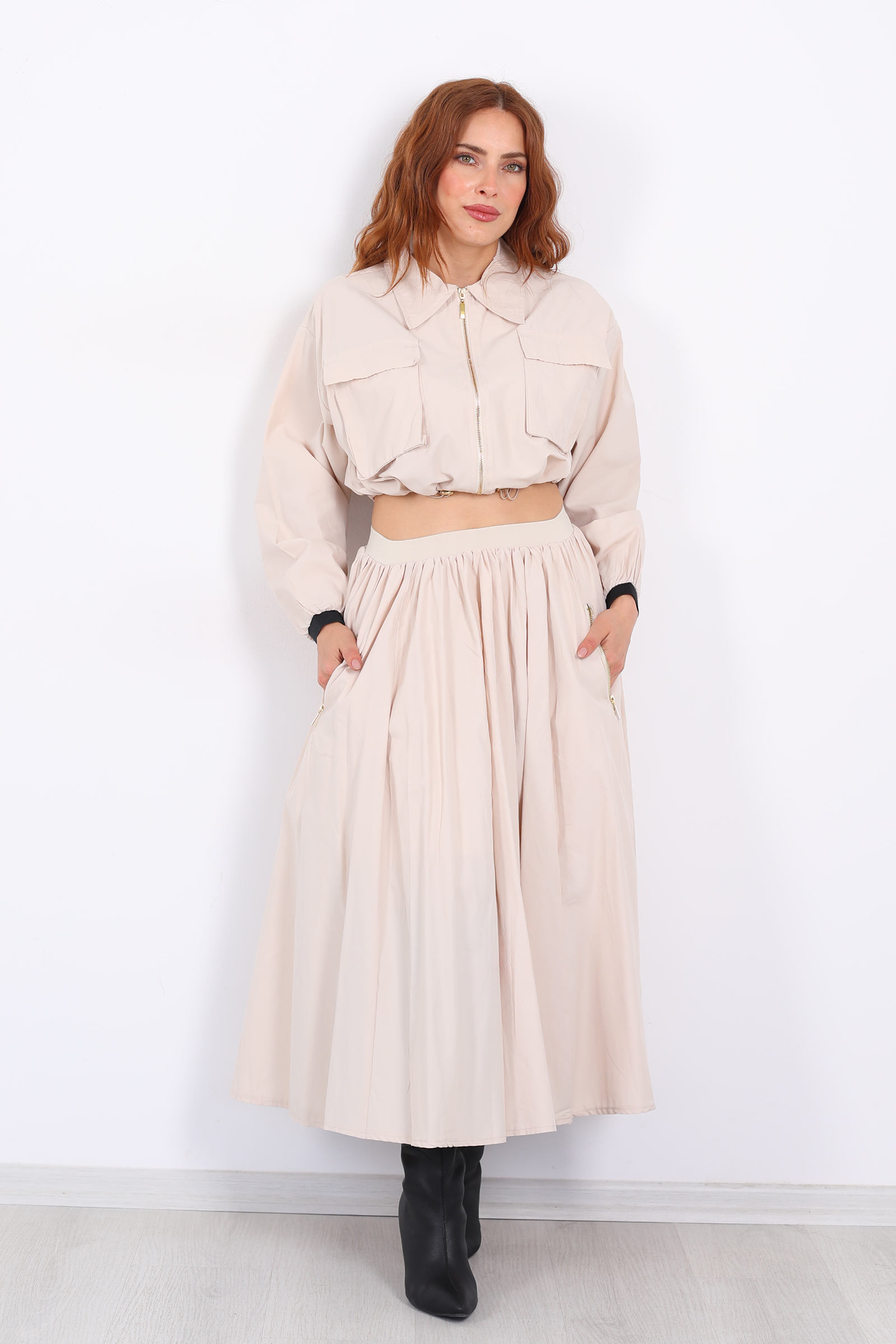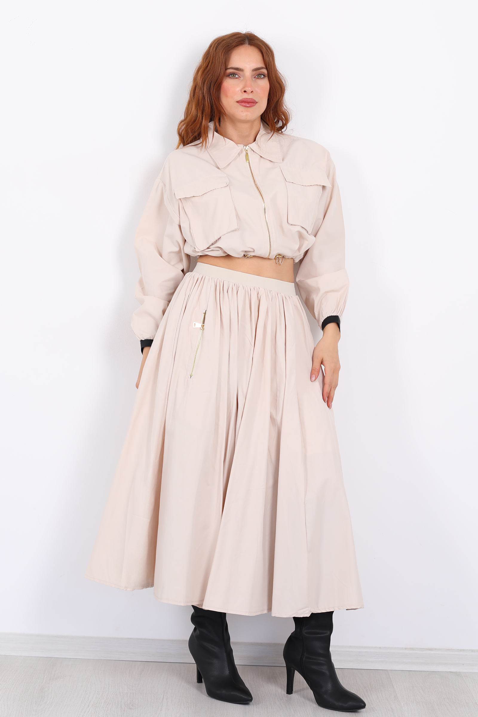 Bu krem rengi ikili takım; hem midi etek hem ceket parçasıyla zarafeti ve işlevselliği kusursuz şekilde birleştiriyor. Takımın kumaşı, yumuşak ama yapılandırılmış bir dokuya sahip ne çok ince ne çok kalın tam mevsimlik bir kullanım sunuyor. Ceket kısmı çift cepli tasarımı sayesinde hem şık bir duruş kazandırıyor hem de kullanışlı bir fonksiyonellik getiriyor.Eteğin midi boyu, klasik bir siluet sunarken hareket özgürlüğü de sağlıyor; bel bölgesindeki kesim ve kumaş gevşekliği, otururken ya da yürürken asimetrik ama dengeli bir döküm oluşturuyor.