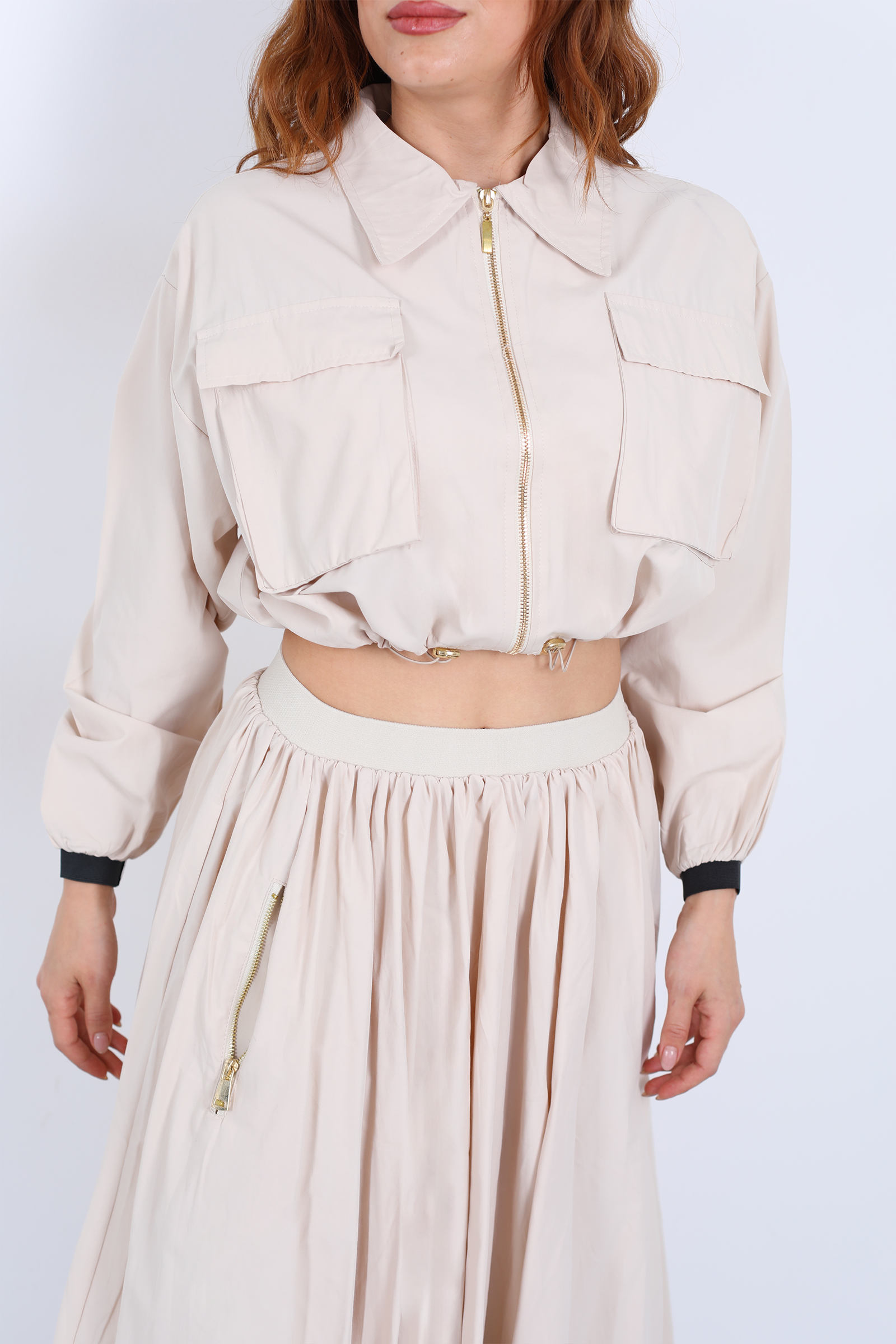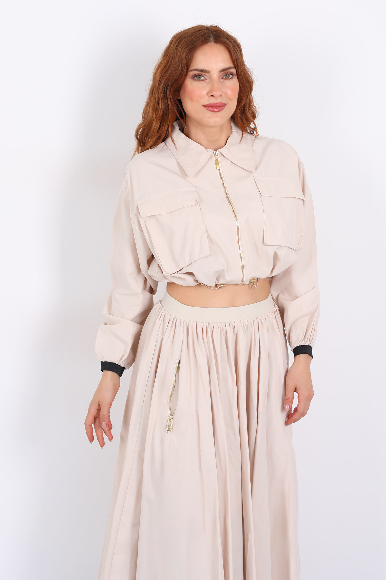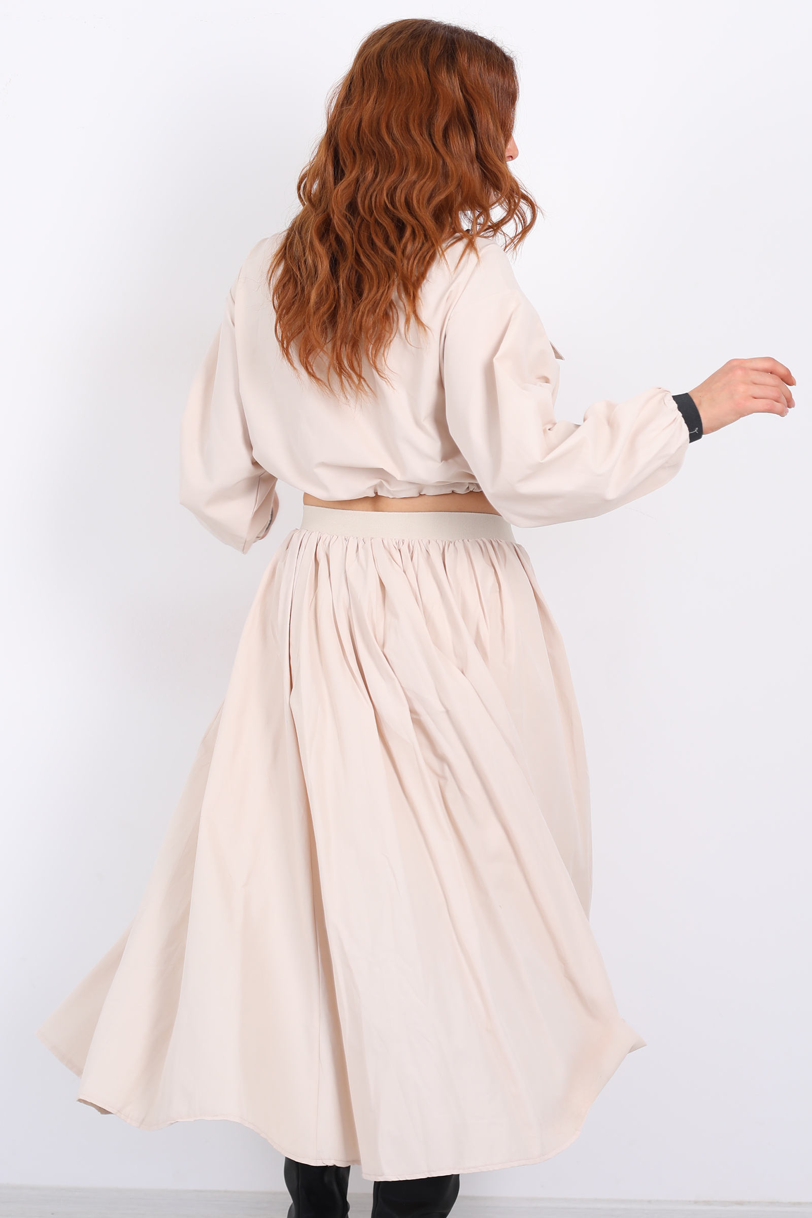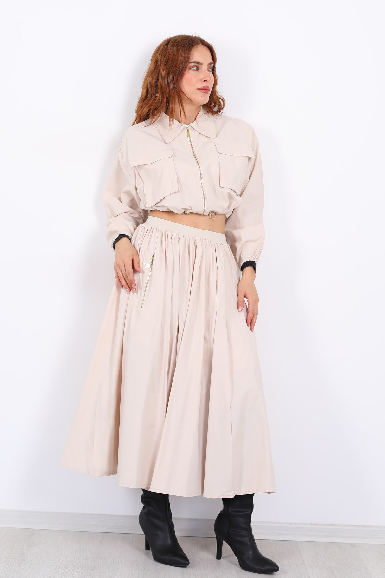 Bu krem rengi ikili takım; hem midi etek hem ceket parçasıyla zarafeti ve işlevselliği kusursuz şekilde birleştiriyor. Takımın kumaşı, yumuşak ama yapılandırılmış bir dokuya sahip ne çok ince ne çok kalın tam mevsimlik bir kullanım sunuyor. Ceket kısmı çift cepli tasarımı sayesinde hem şık bir duruş kazandırıyor hem de kullanışlı bir fonksiyonellik getiriyor.Eteğin midi boyu, klasik bir siluet sunarken hareket özgürlüğü de sağlıyor; bel bölgesindeki kesim ve kumaş gevşekliği, otururken ya da yürürken asimetrik ama dengeli bir döküm oluşturuyor.