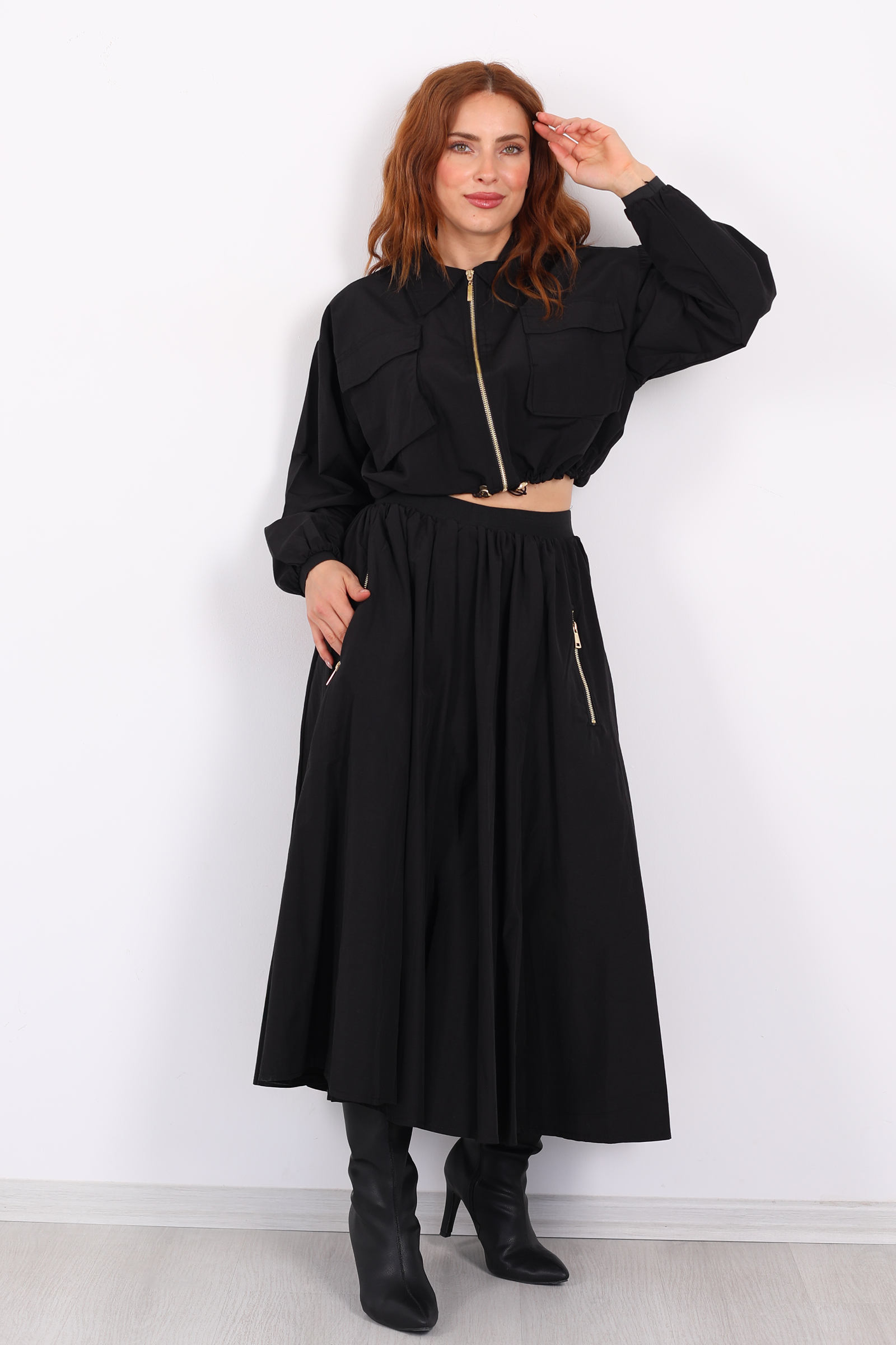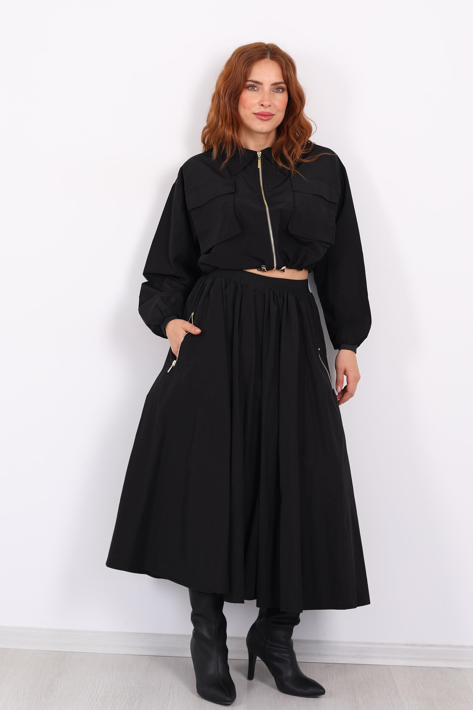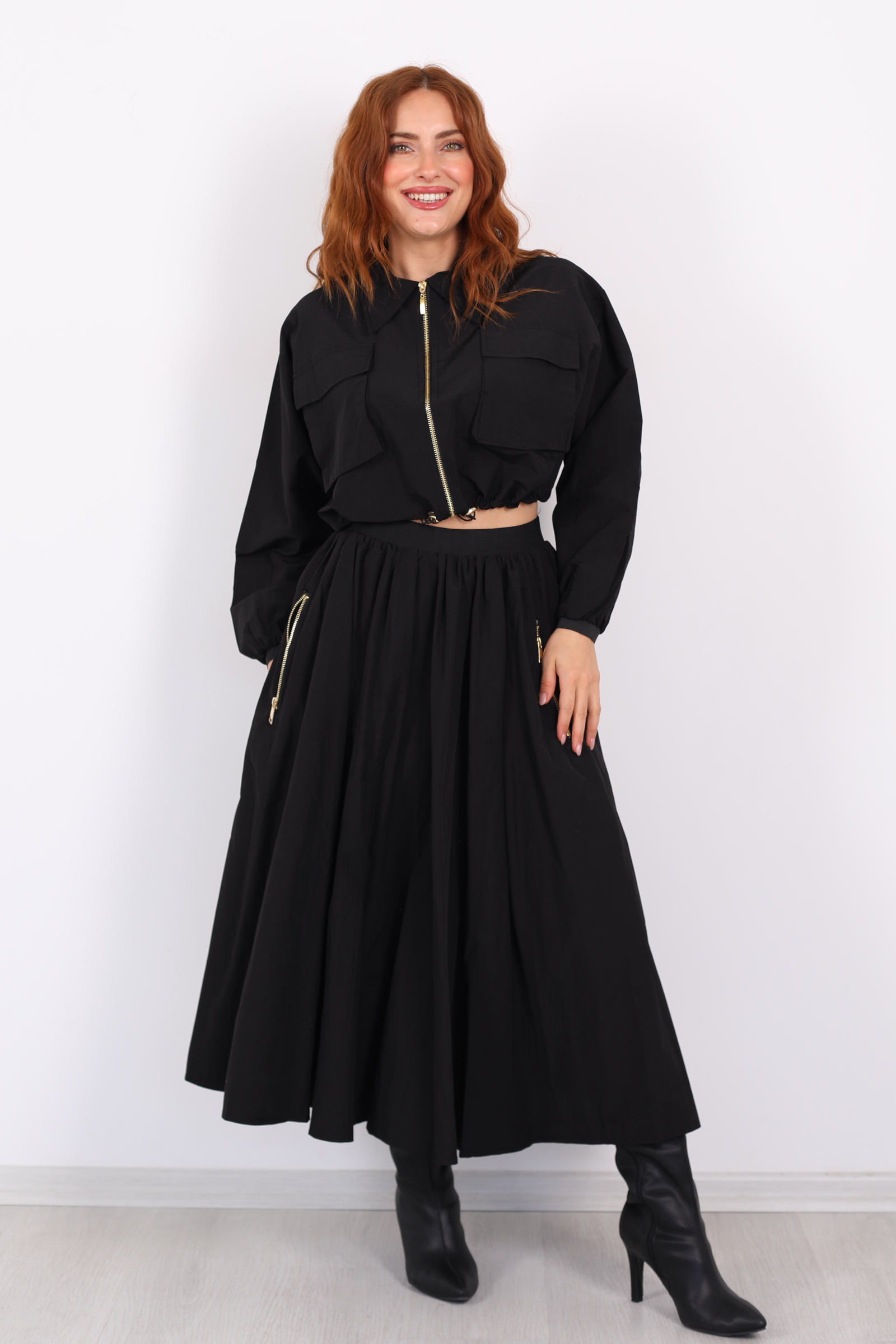Doğrudan sofistike bir duruş sunan bu siyah midi takım, hem etek hem ceket parçasıyla güçlü ve dengeli bir stil yaratıyor. Premium görünümlü kumaşı, muhtemelen yün‑karışımlı veya kalın dokulu polyester içerir; bu sayede hem ynapı kazandırır hem de komfort sağlar.Ceket tarafı, çift cepli tasarımıyla klasik takım ceketlerinden farksız bir işe yararlılık suarken, kesimi omuzları belirginleştirip bele doğru hafifçe daralarak dengeli bir siluet çıkarıyor.