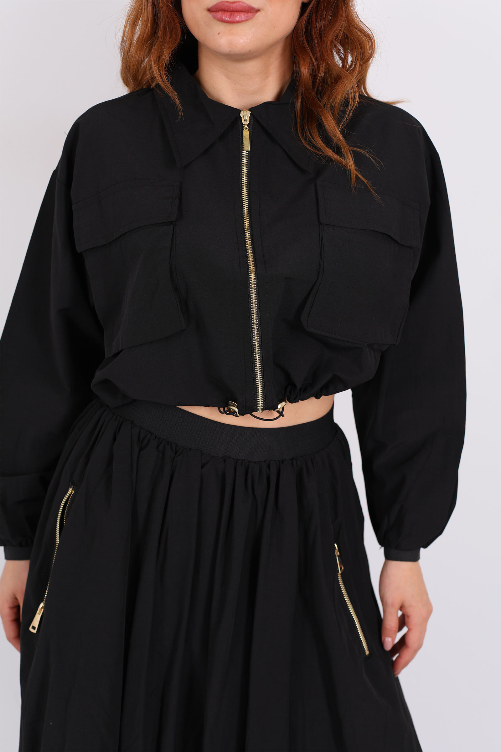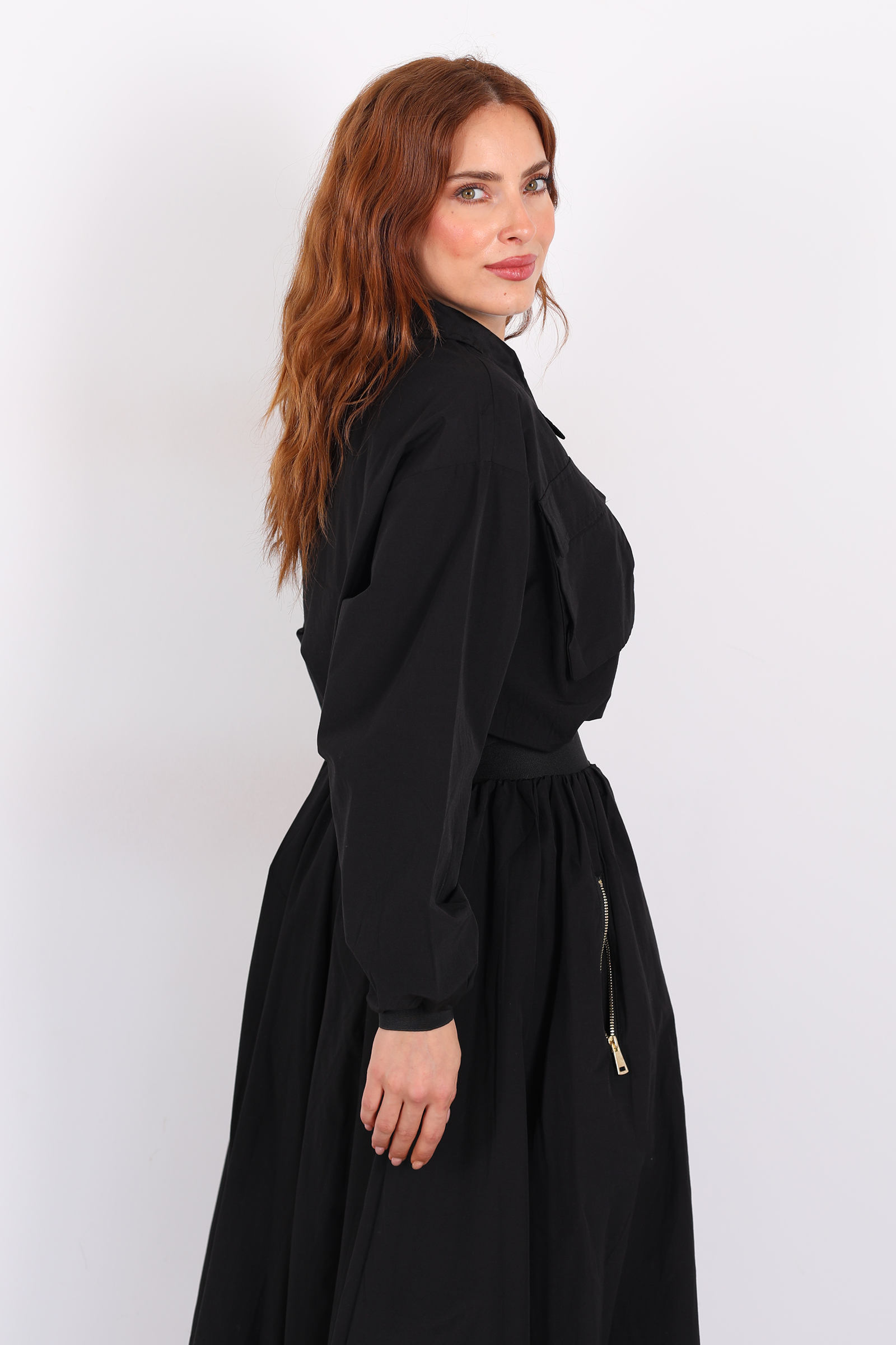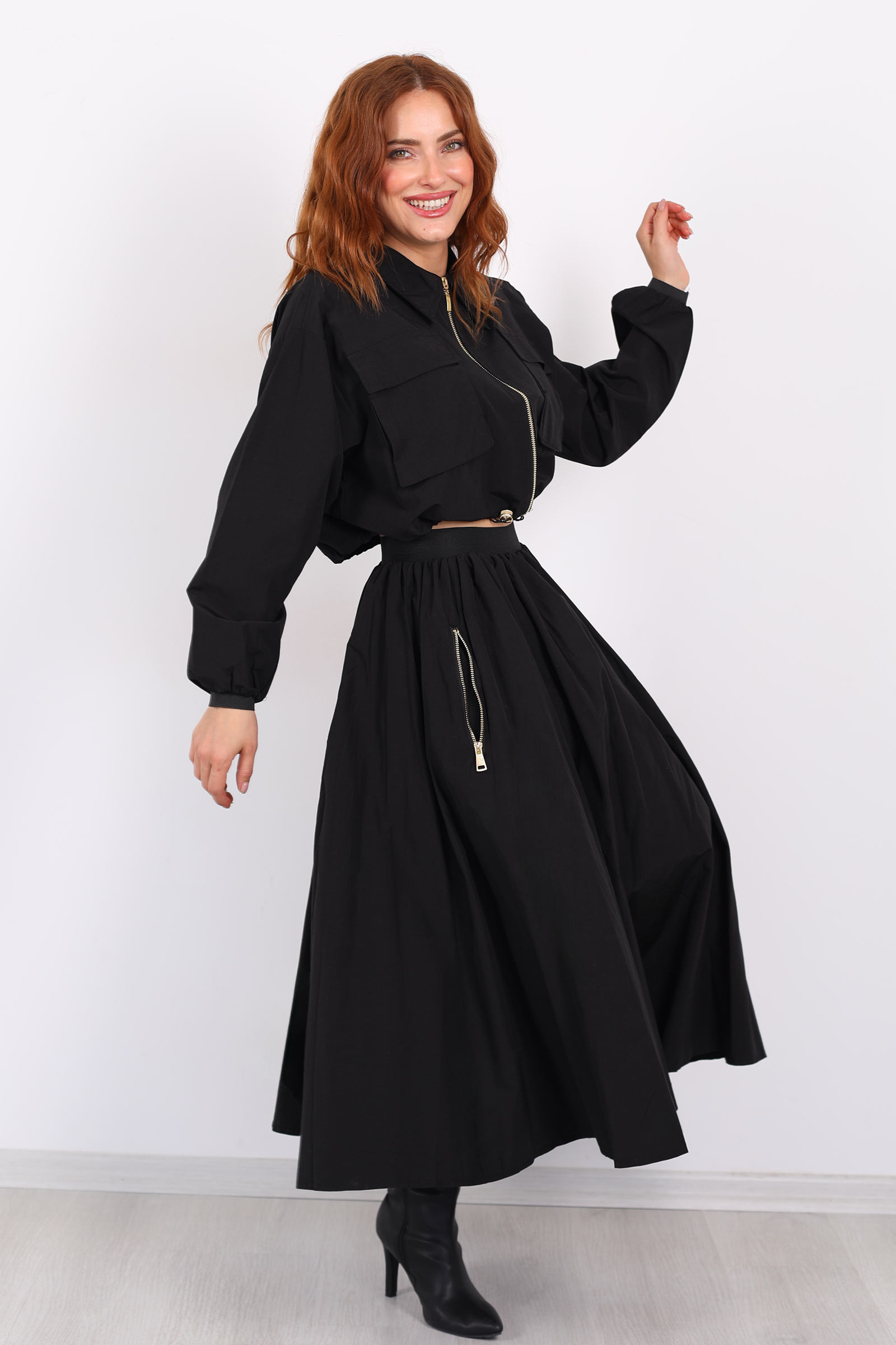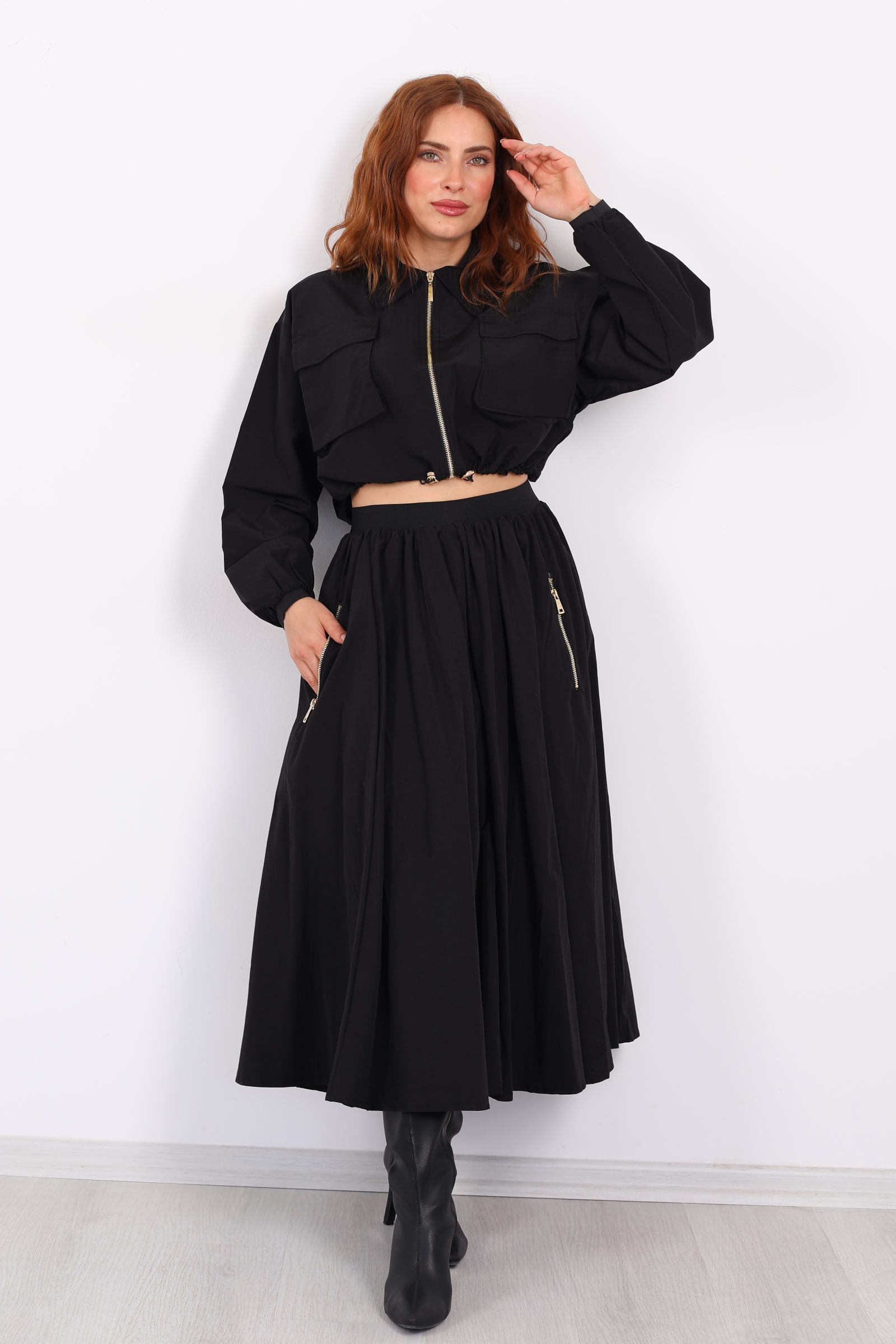 Doğrudan sofistike bir duruş sunan bu siyah midi takım, hem etek hem ceket parçasıyla güçlü ve dengeli bir stil yaratıyor. Premium görünümlü kumaşı, muhtemelen yün‑karışımlı veya kalın dokulu polyester içerir; bu sayede hem ynapı kazandırır hem de komfort sağlar.Ceket tarafı, çift cepli tasarımıyla klasik takım ceketlerinden farksız bir işe yararlılık suarken, kesimi omuzları belirginleştirip bele doğru hafifçe daralarak dengeli bir siluet çıkarıyor.