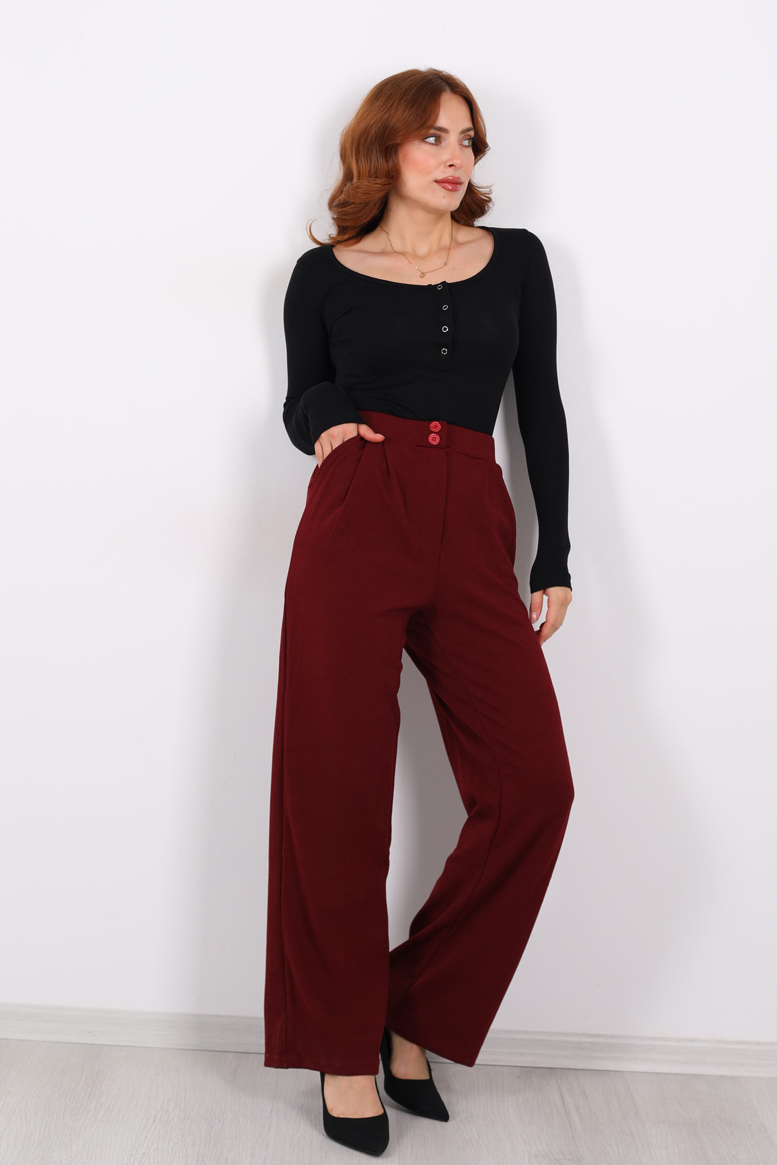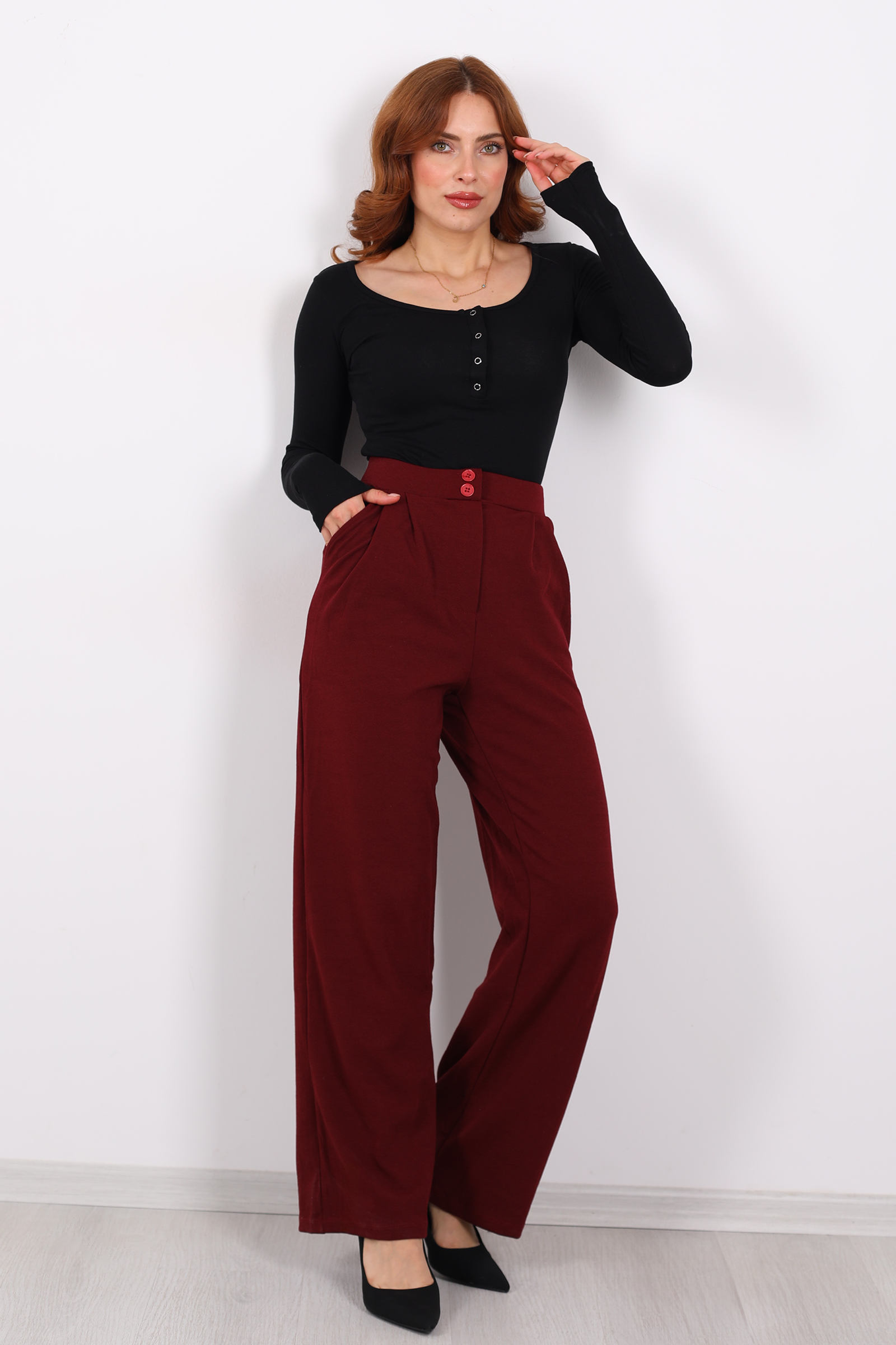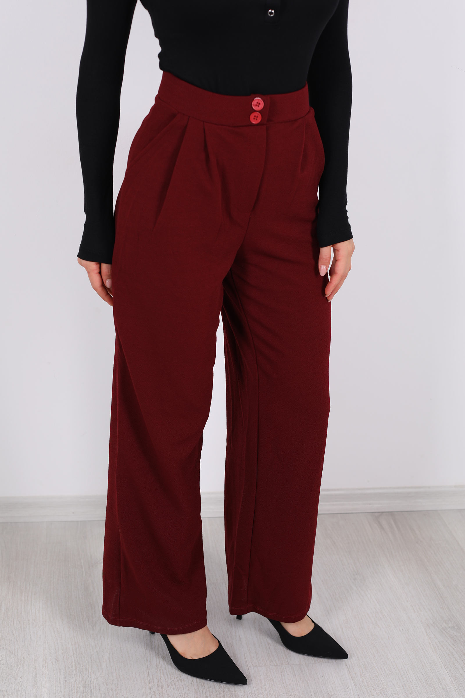 Çift Düğmeli Bol Paça Krep Bordo Kadın Pantolon