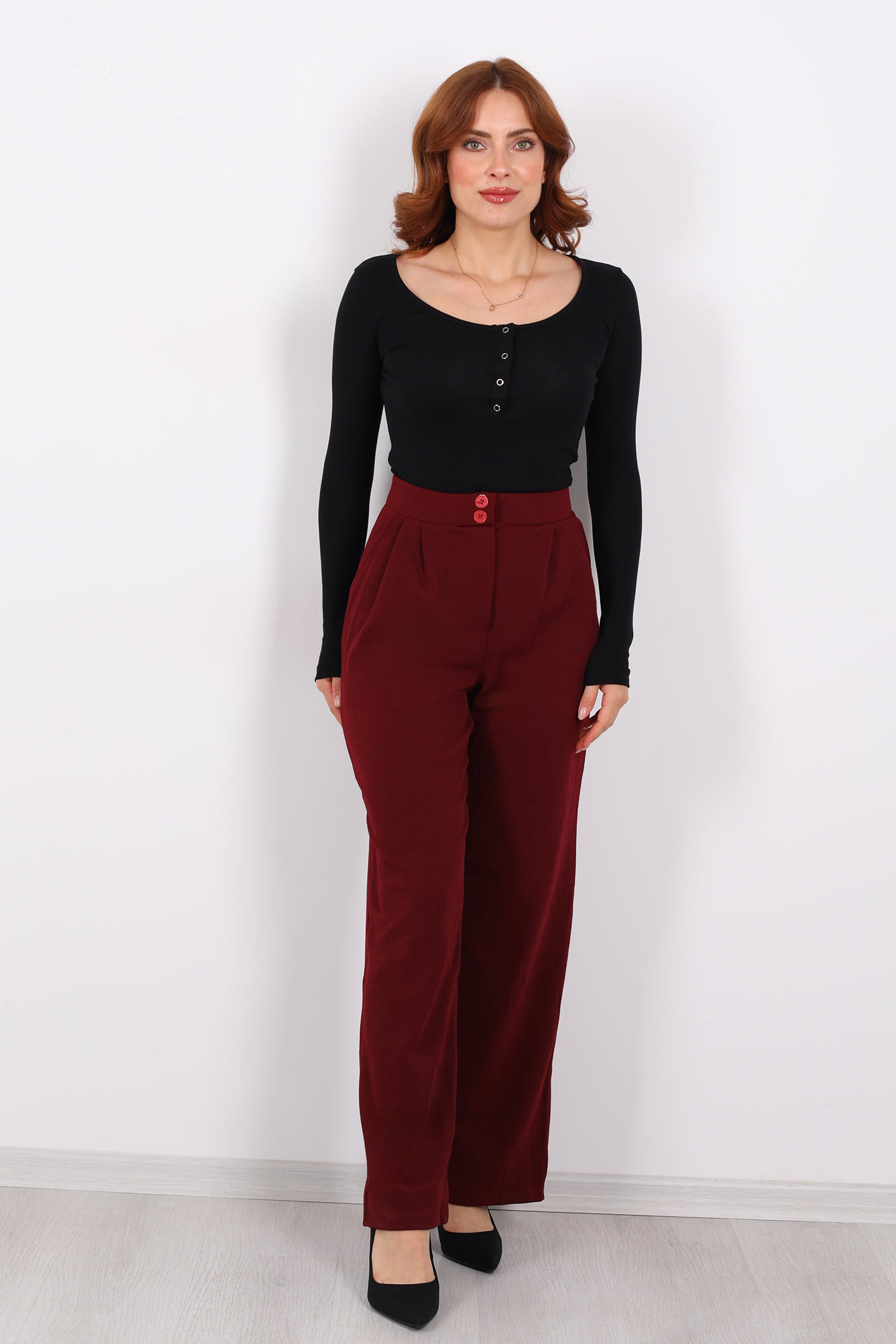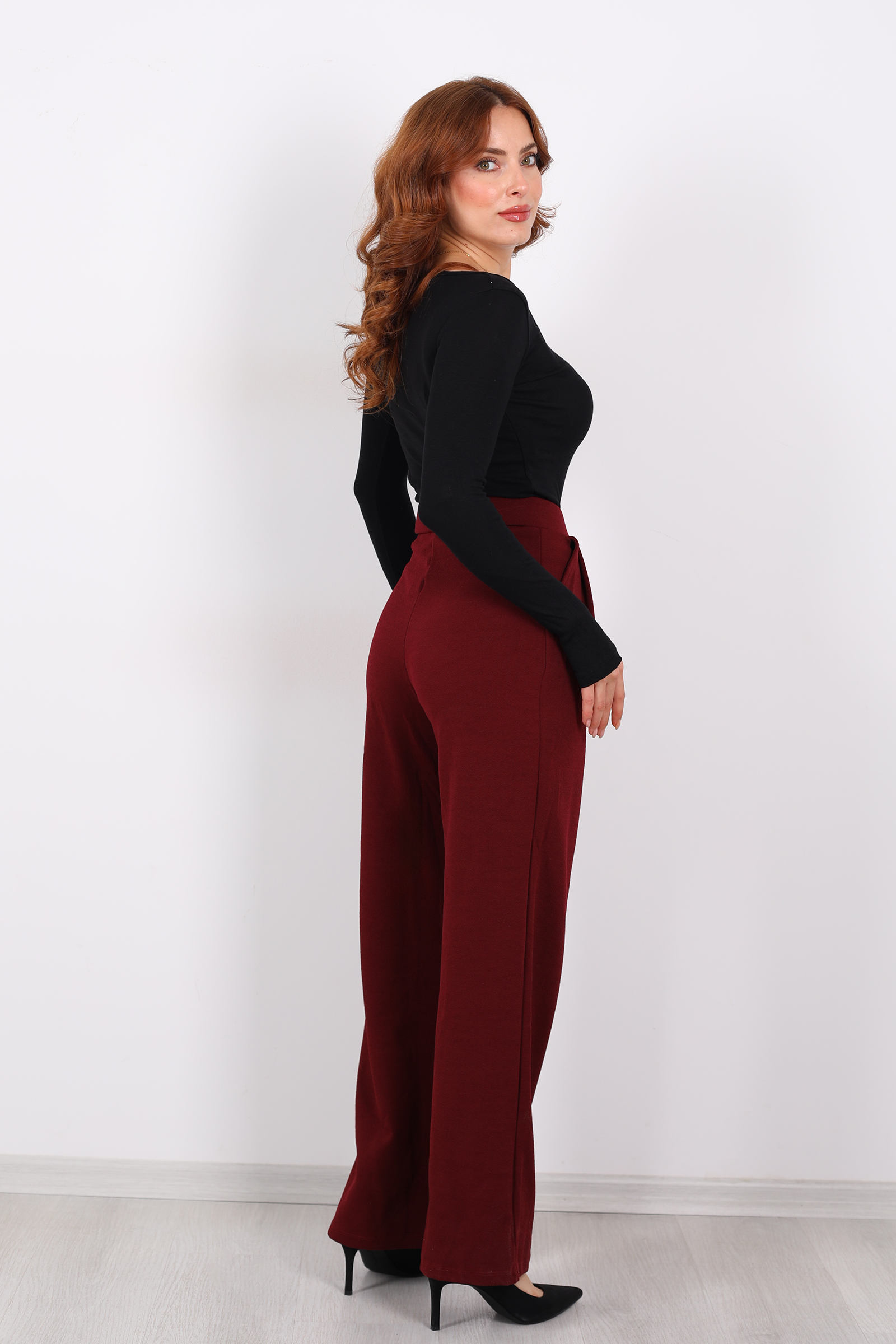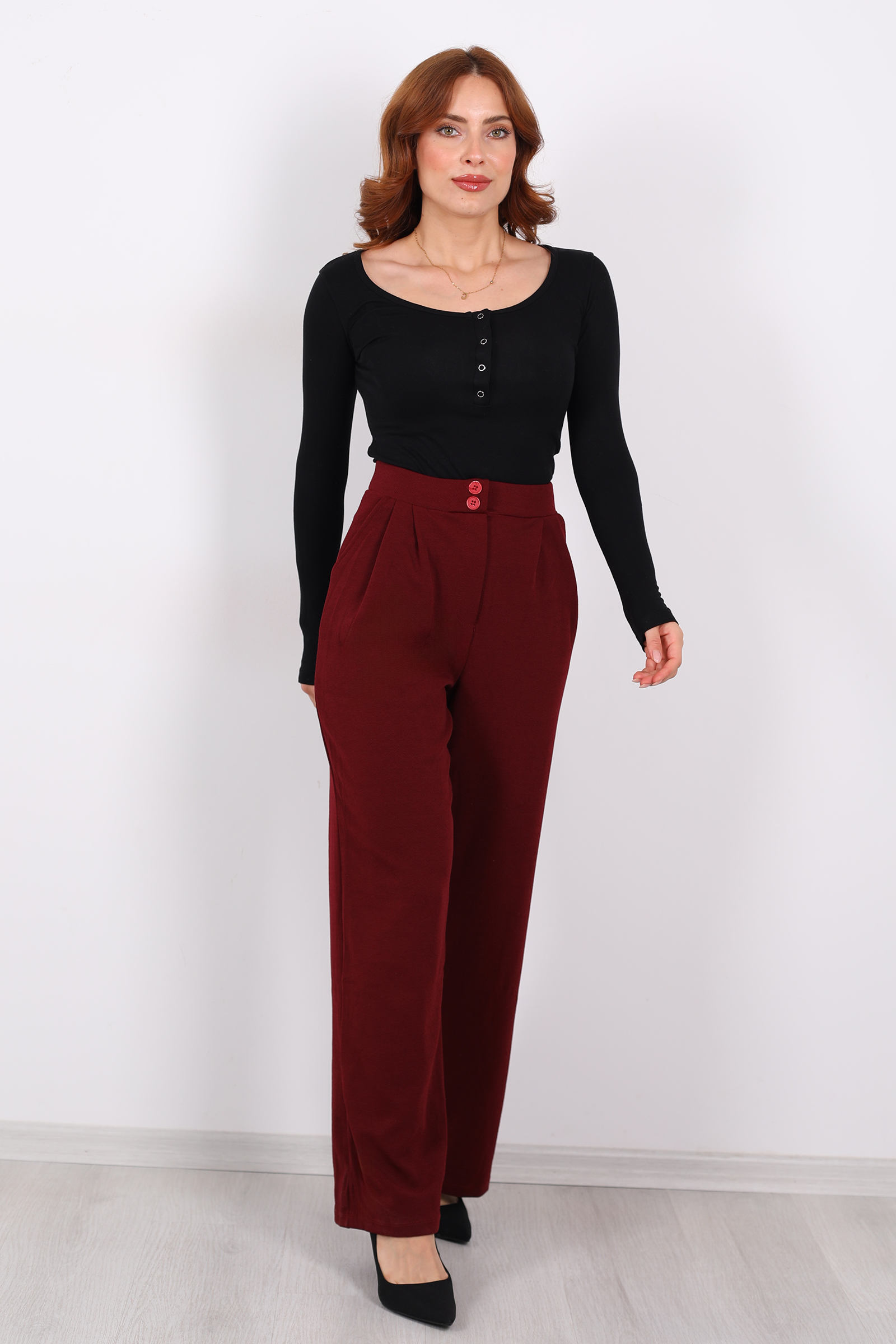 Çift Düğmeli Bol Paça Krep Bordo Kadın Pantolon