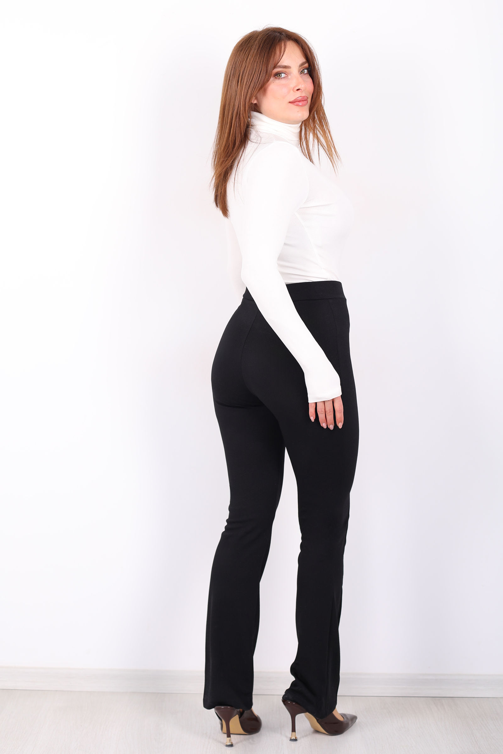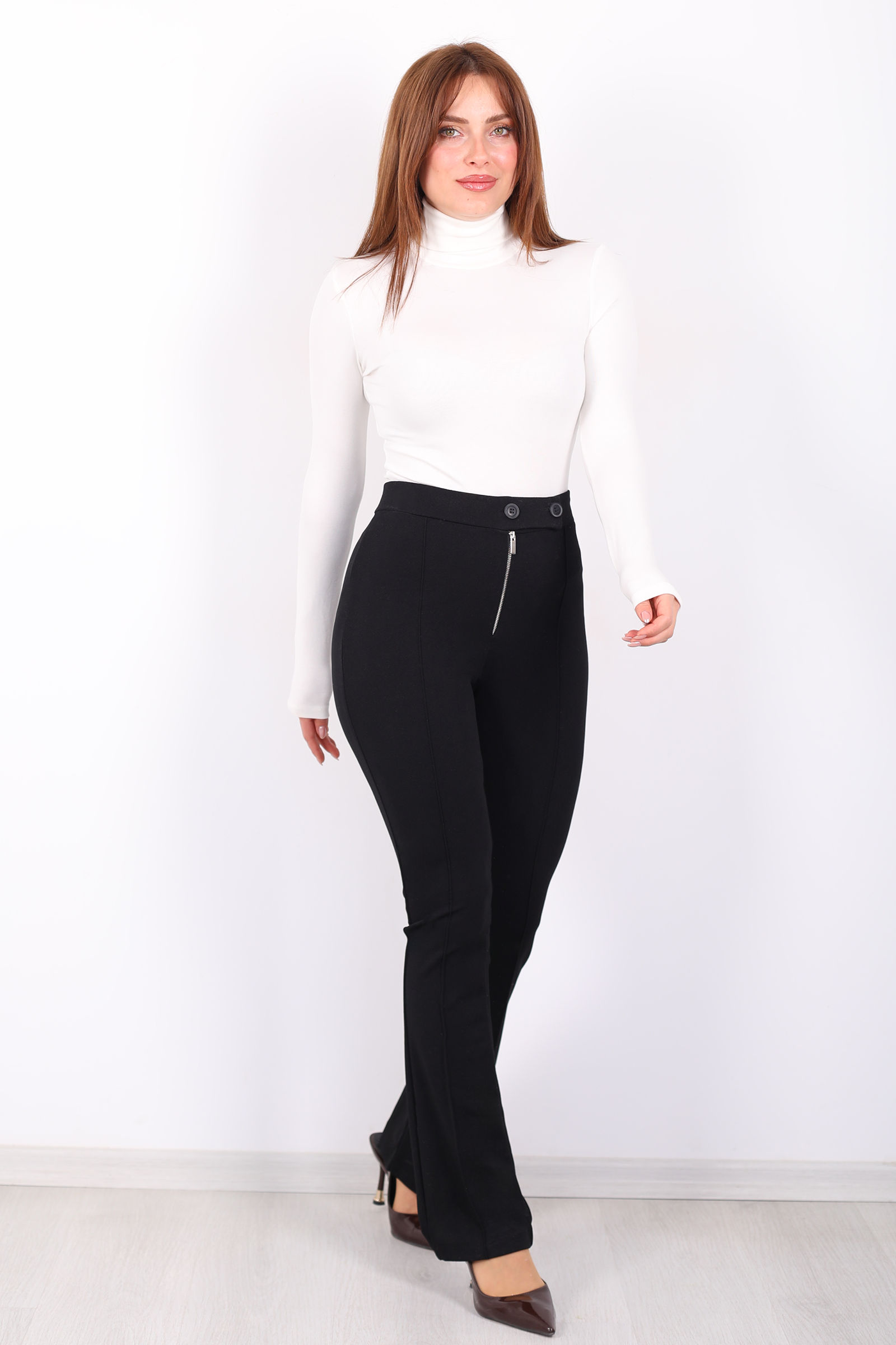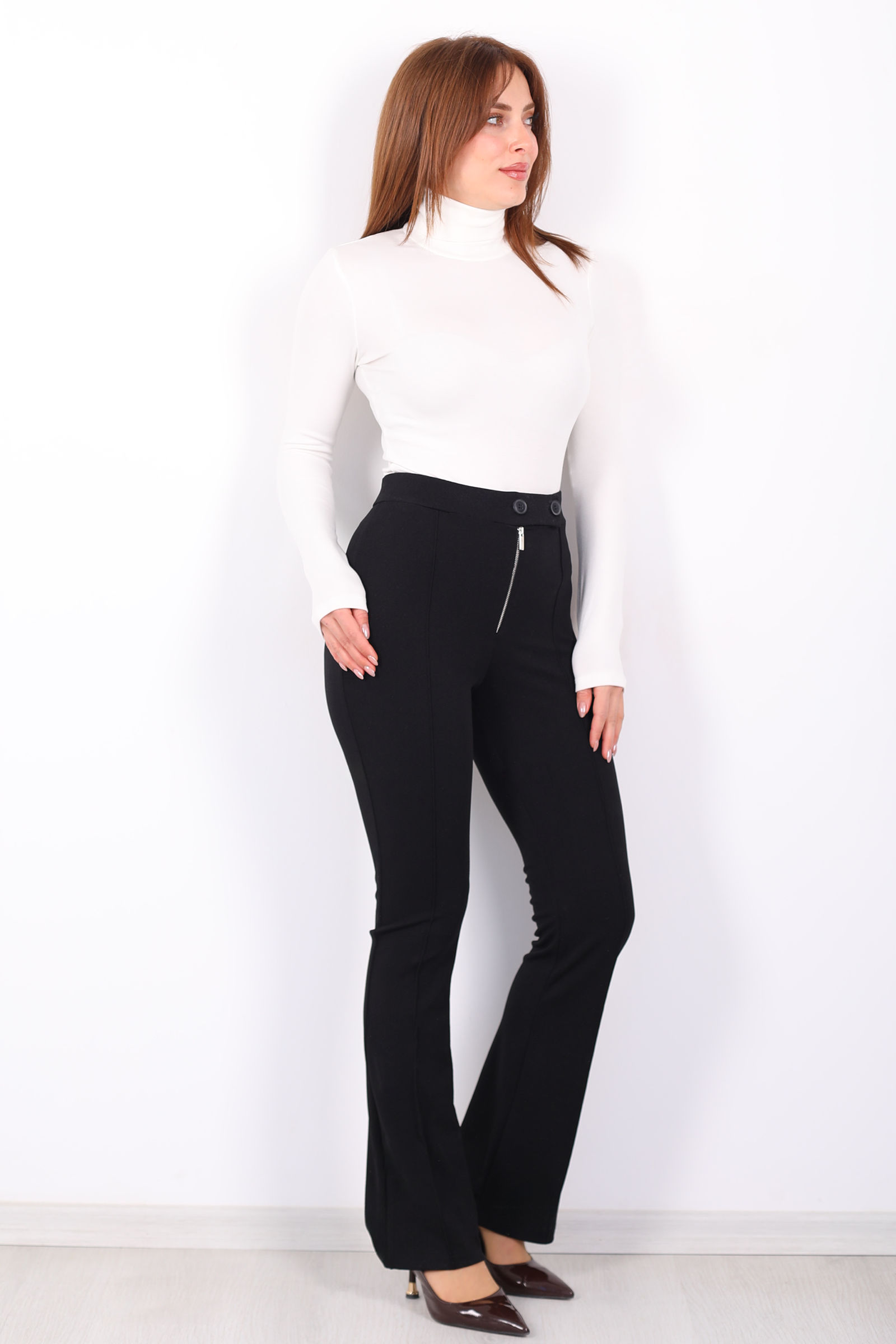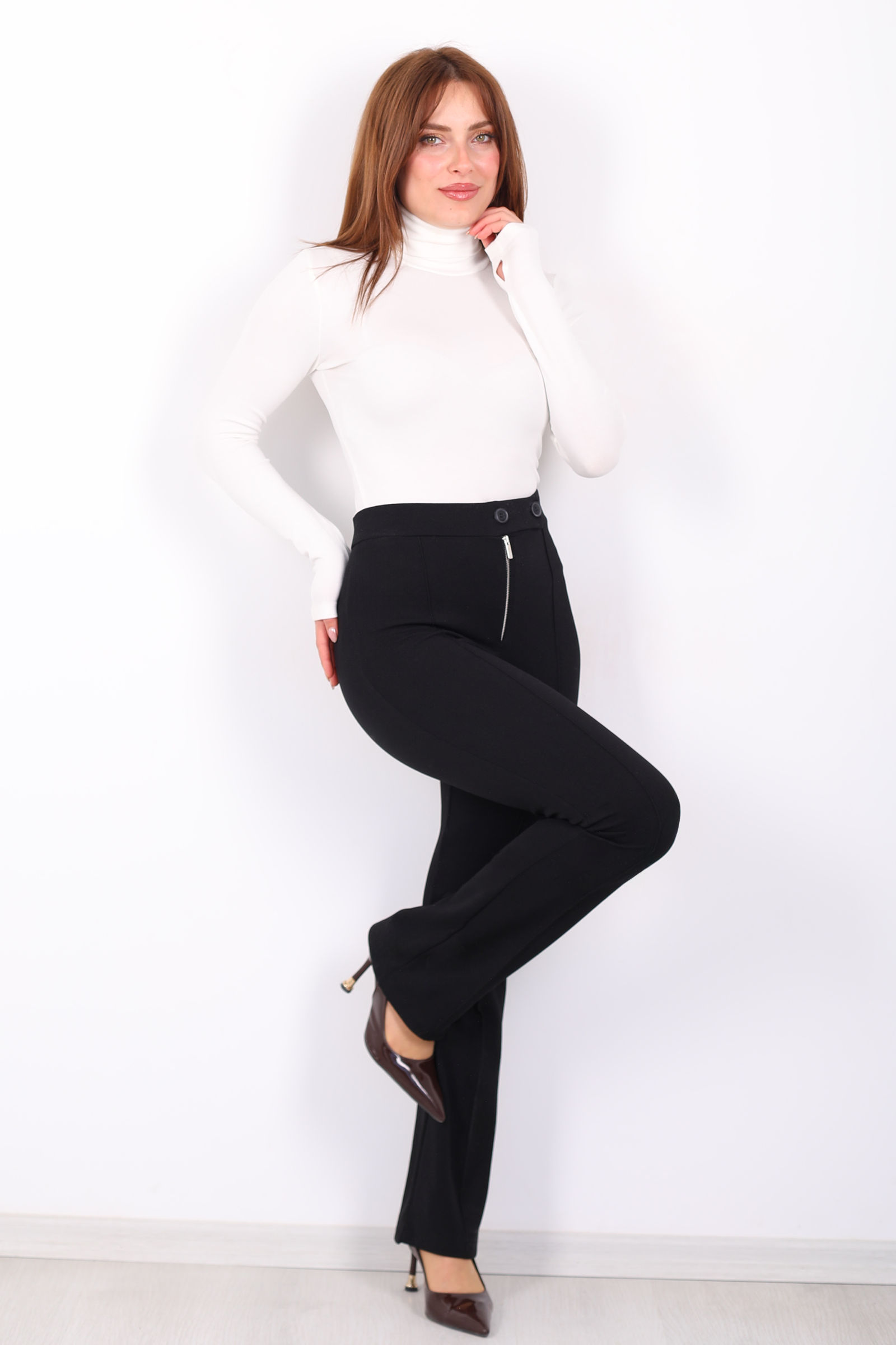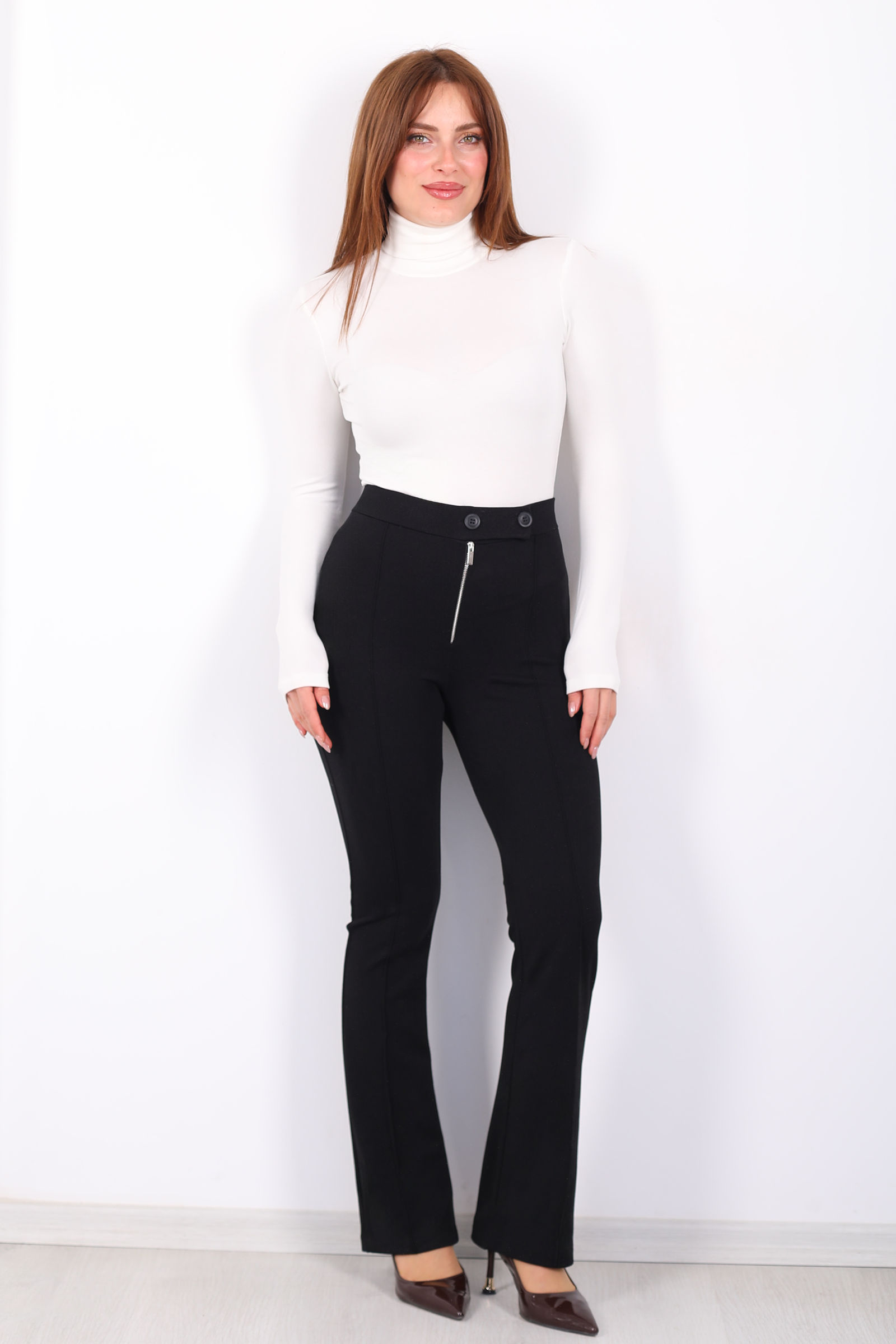 Zarif ve modern tasarımıyla öne çıkan bu siyah kadın İspanyol pantolon, çift düğme detayıyla stilinize sofistike bir dokunuş katar. İspanyol paça kesimiyle bacak hattını zarifçe vurgularken, yüksek kaliteli kumaşı gün boyu rahatlık ve konfor sağlar. Klasik siyah rengi sayesinde hem günlük hem de özel kombinlerinize uyum sağlar; bluz, gömlek veya basic tişörtlerle kolayca kombinlenebilir. Modern kesimi ve detaylarıyla gardırobunuzun vazgeçilmez parçalarından biri olacaktır.
