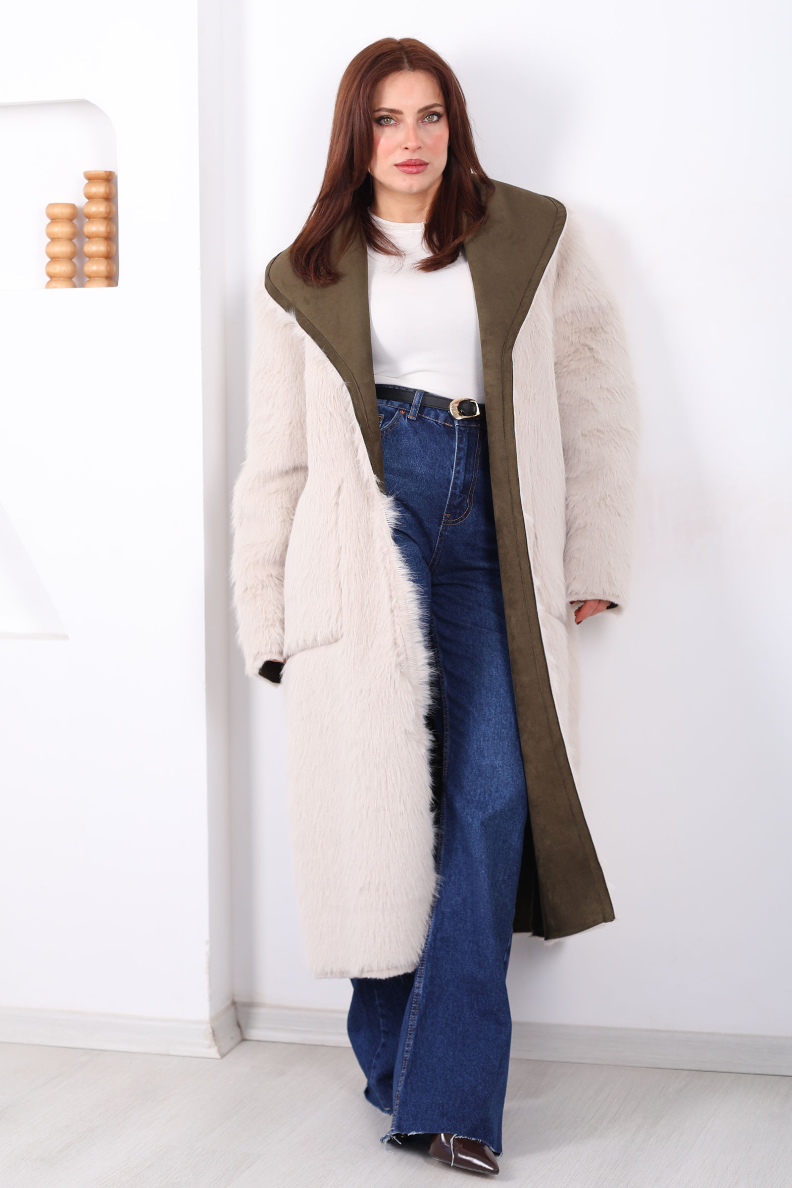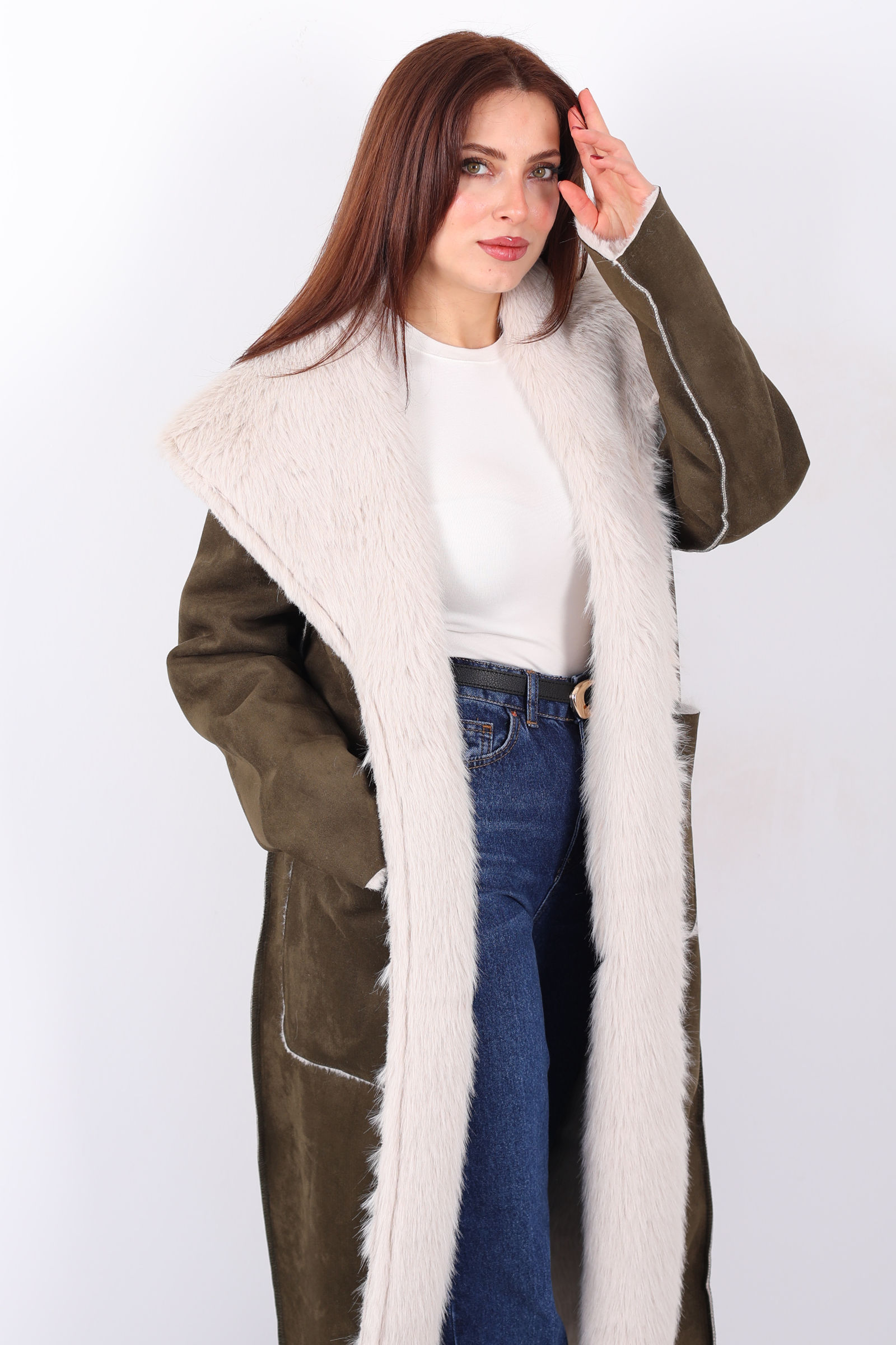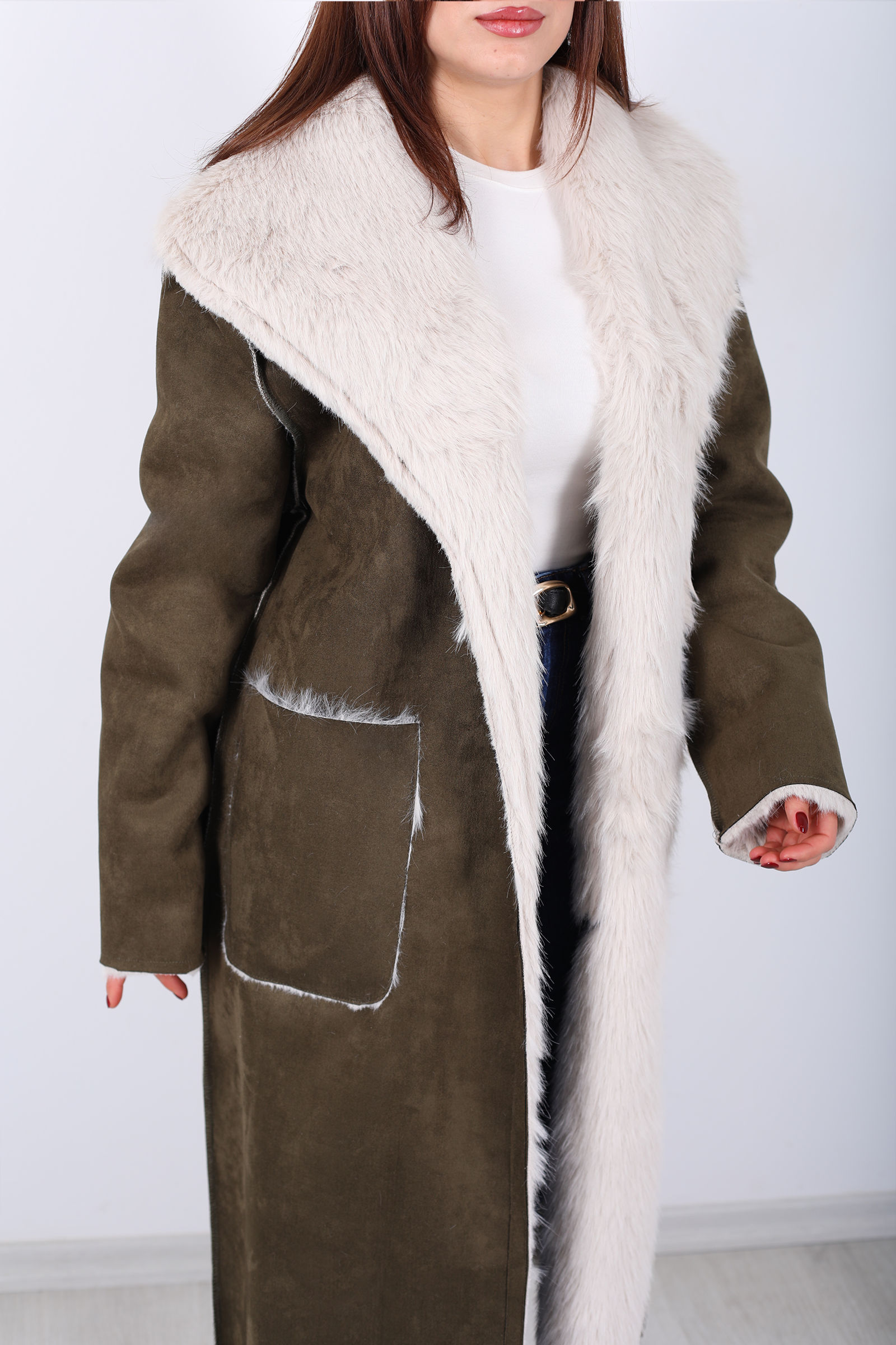 Çift Taraflı içi Kürklü Haki Kadın Süet Uzun Kaban