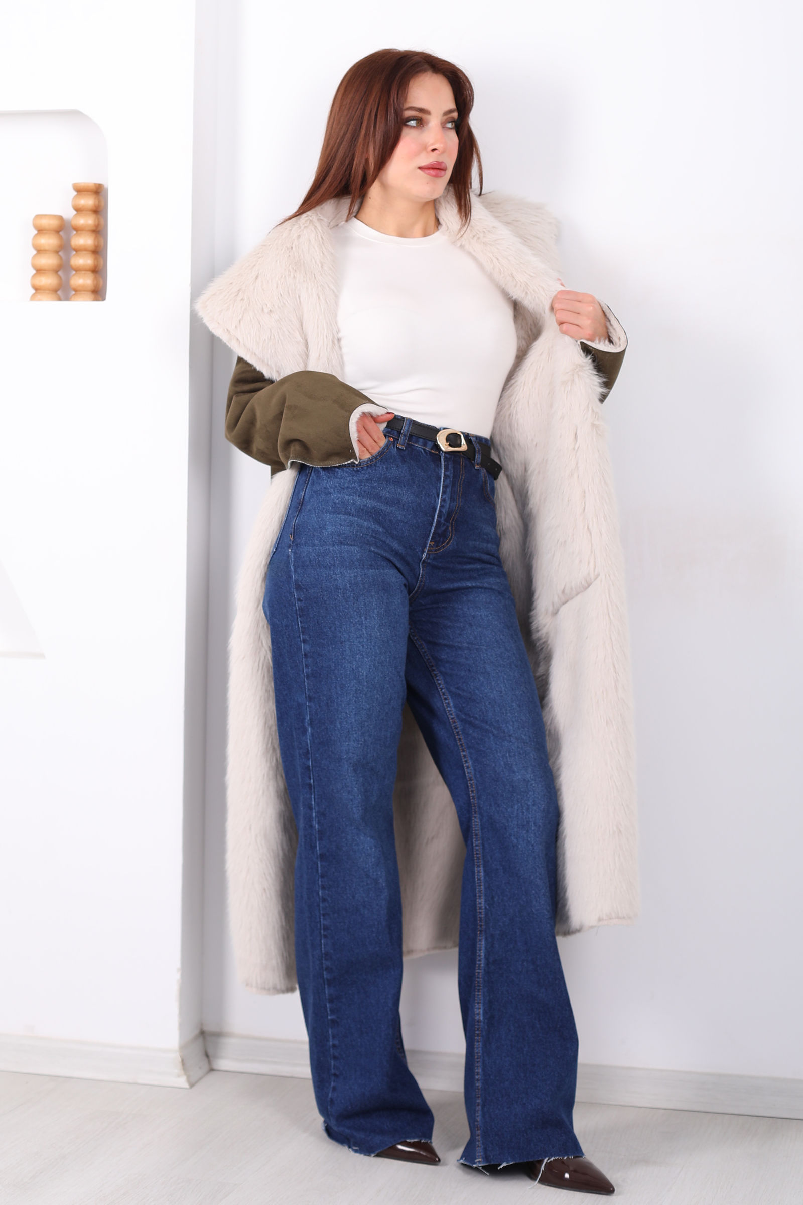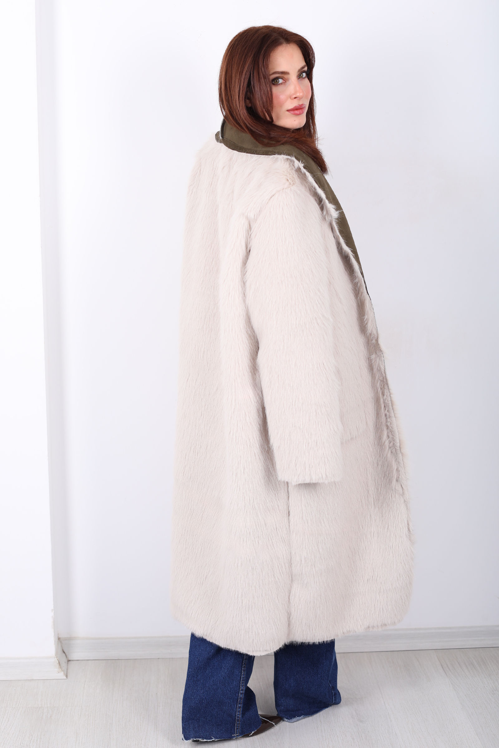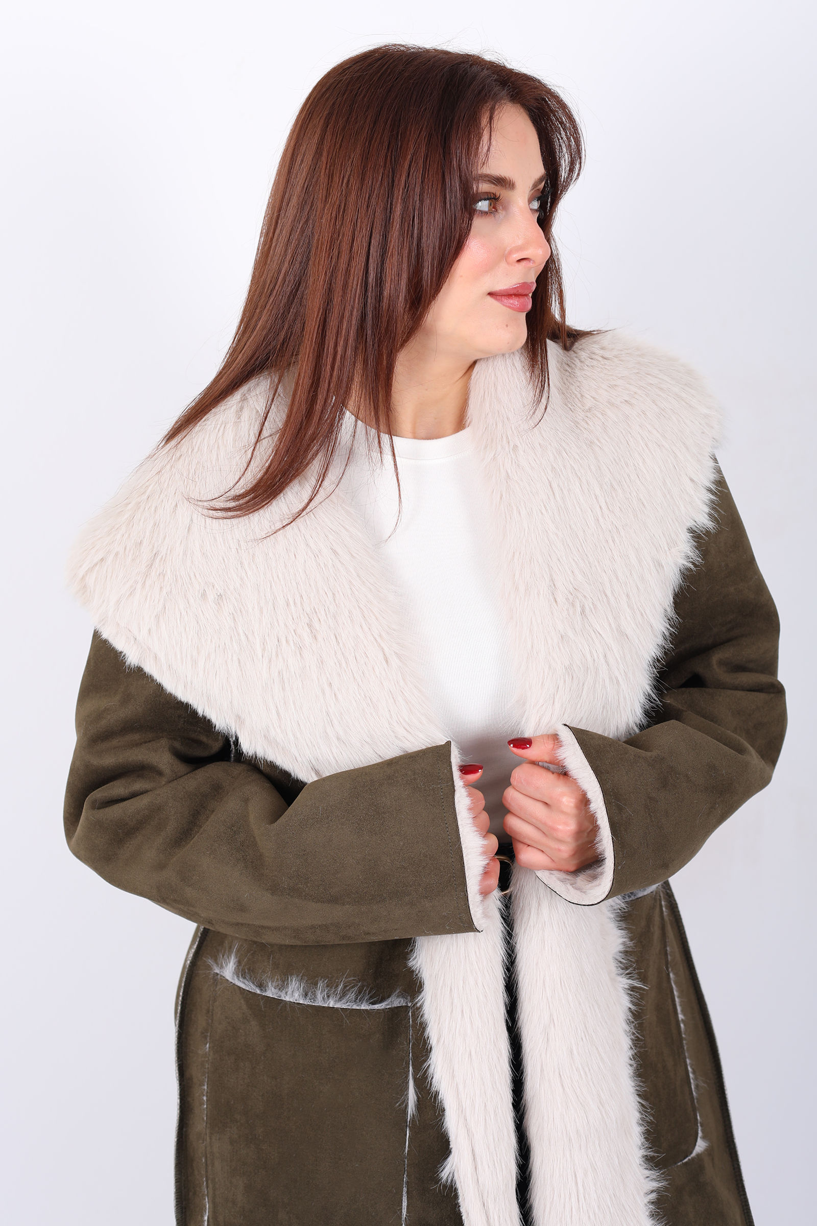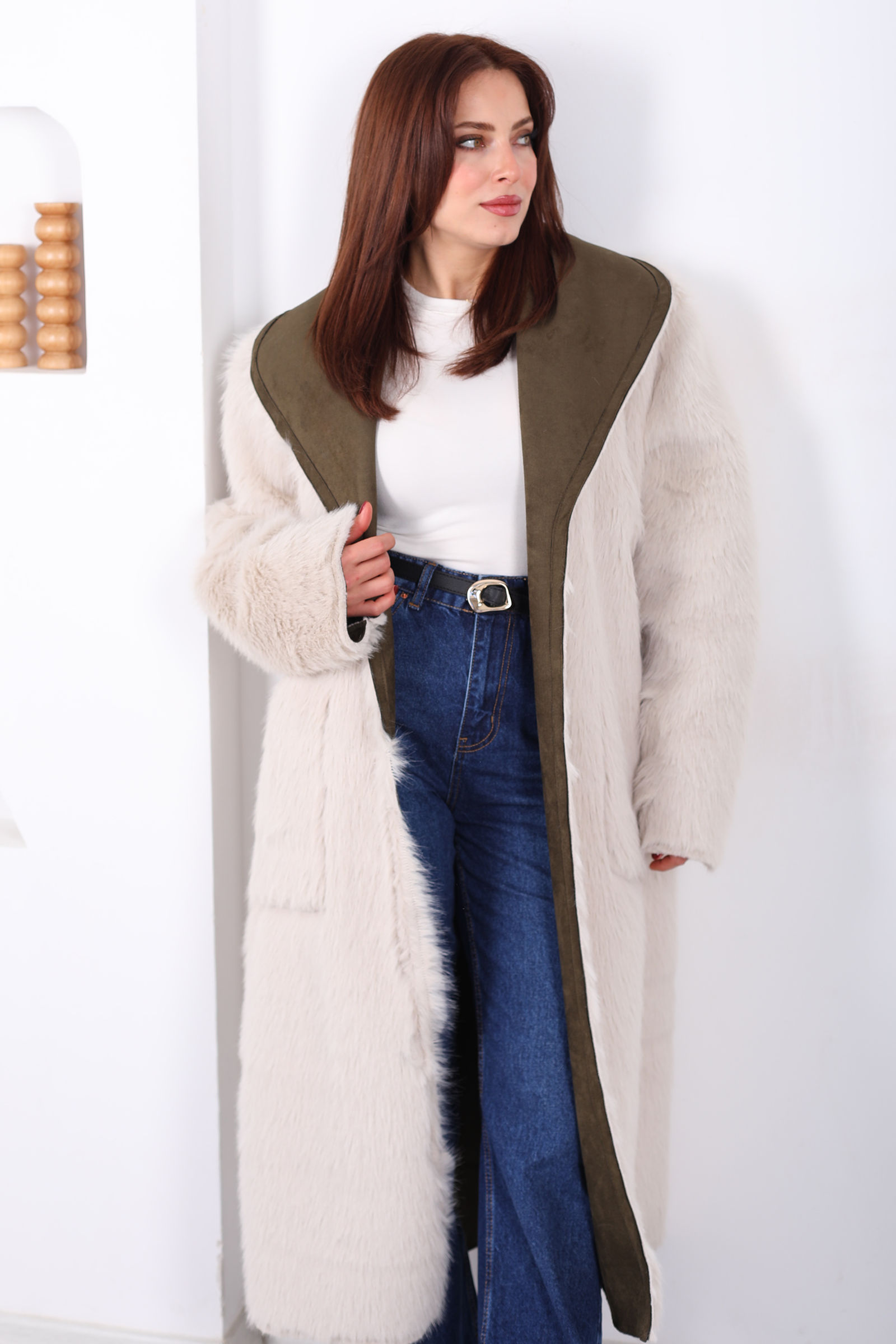 Çift Taraflı içi Kürklü Haki Kadın Süet Uzun Kaban