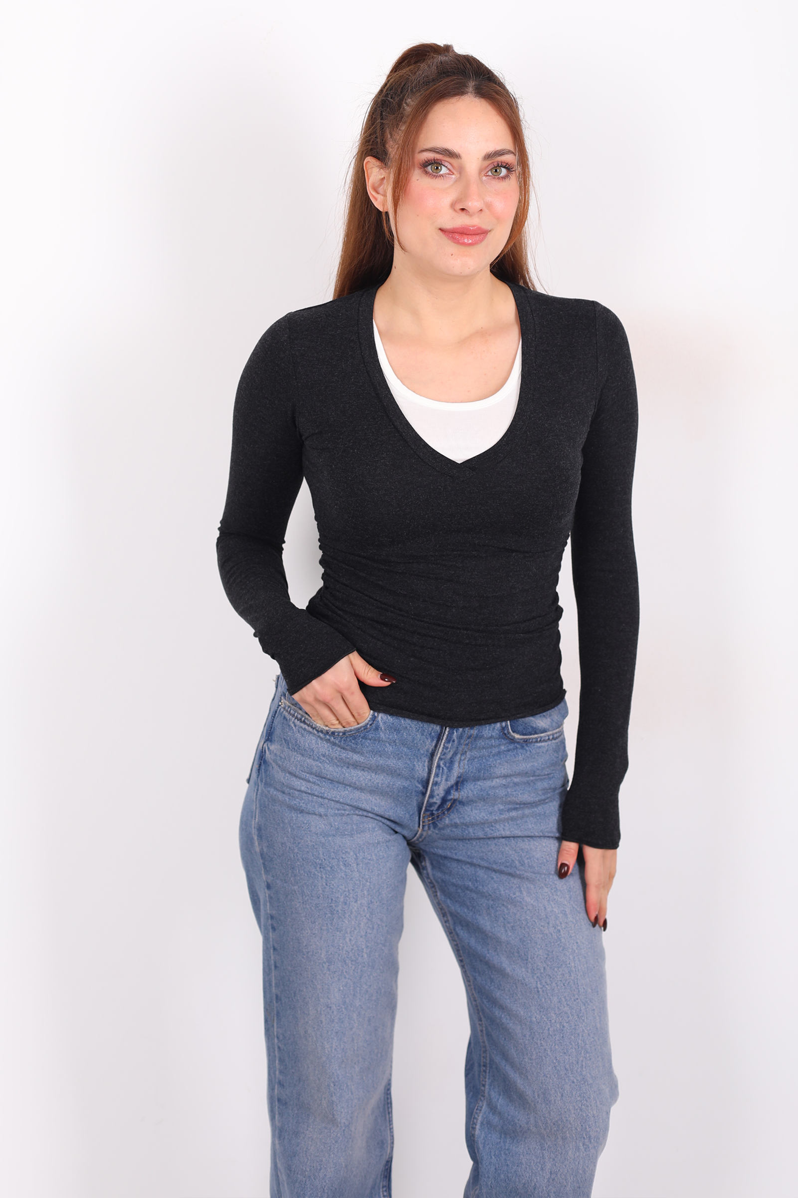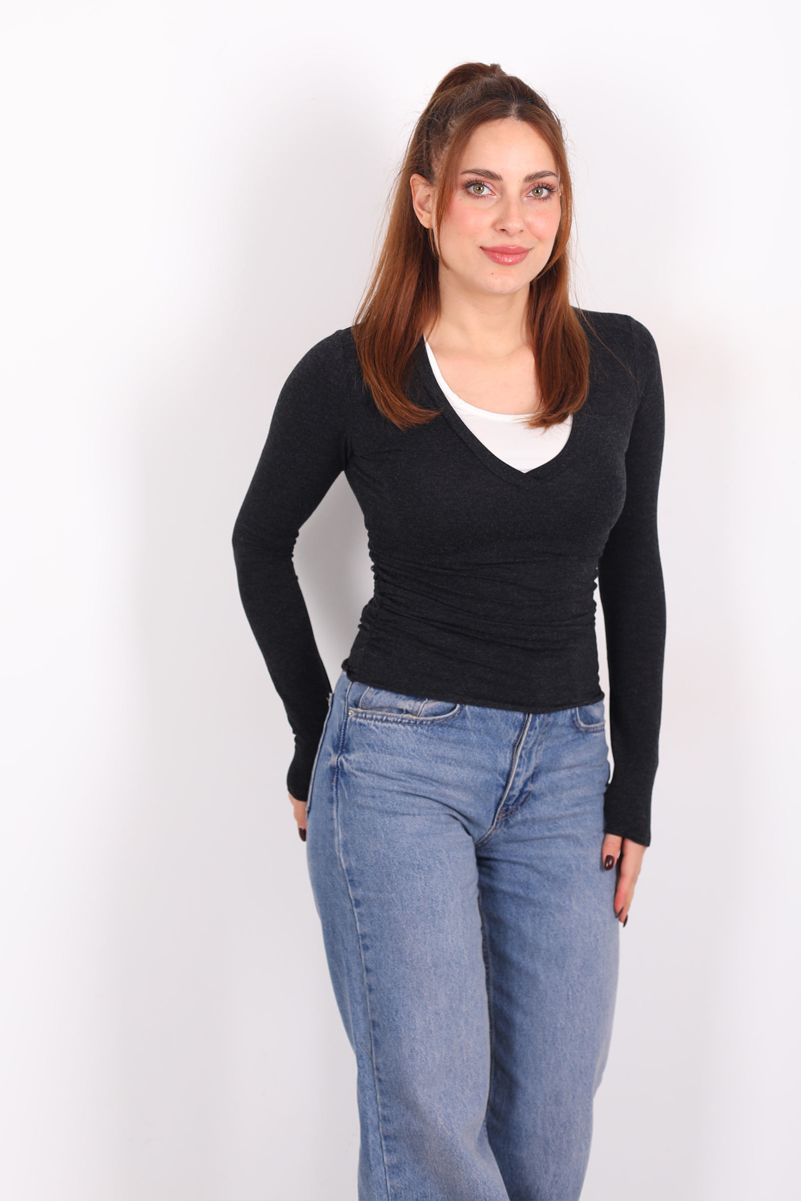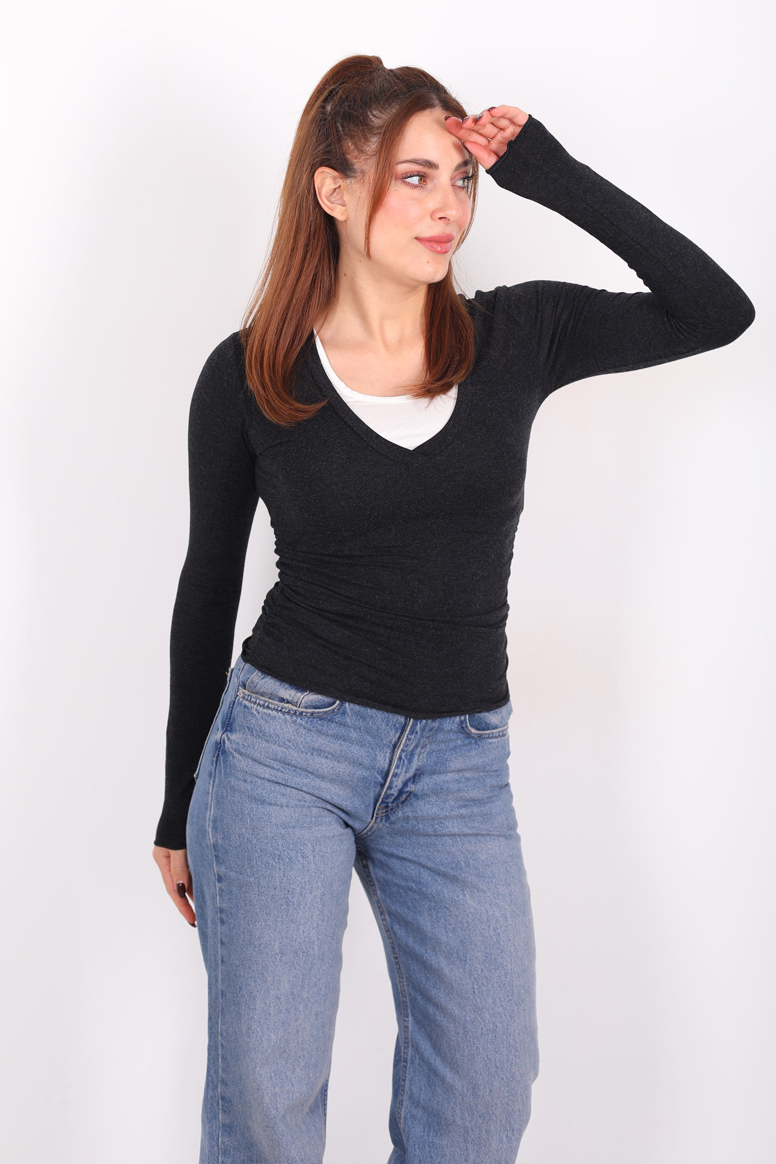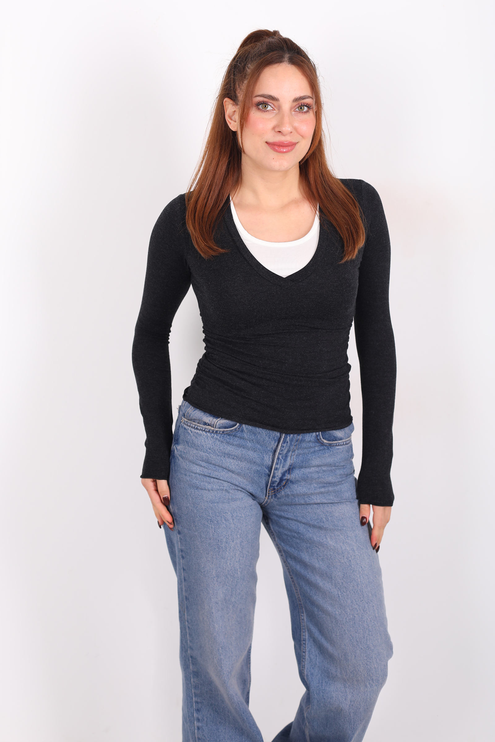 Siyahın derin tonuyla tasarlanan bu çift V yaka bluz, drapeli dokusuyla sade görünümü güçlü bir ifadeye dönüştürüyor. İki farklı V yaka detayı, boyun çizgisini dikkat çekici bir şekilde çerçevelerken bluzun akışkan kumaşı teninizle uyum içinde hareket eder. Drapeli yüzey dokusu, görünümde doğal bir hacim ve ritim yaratır; günlük kombinlerden şık akşam buluşmalarına kadar pek çok farklı tarzda yer alabilir. Minimal ama etkileyici detaylara sahip bu parça, gardırobunuza modern bir zarafet katar.