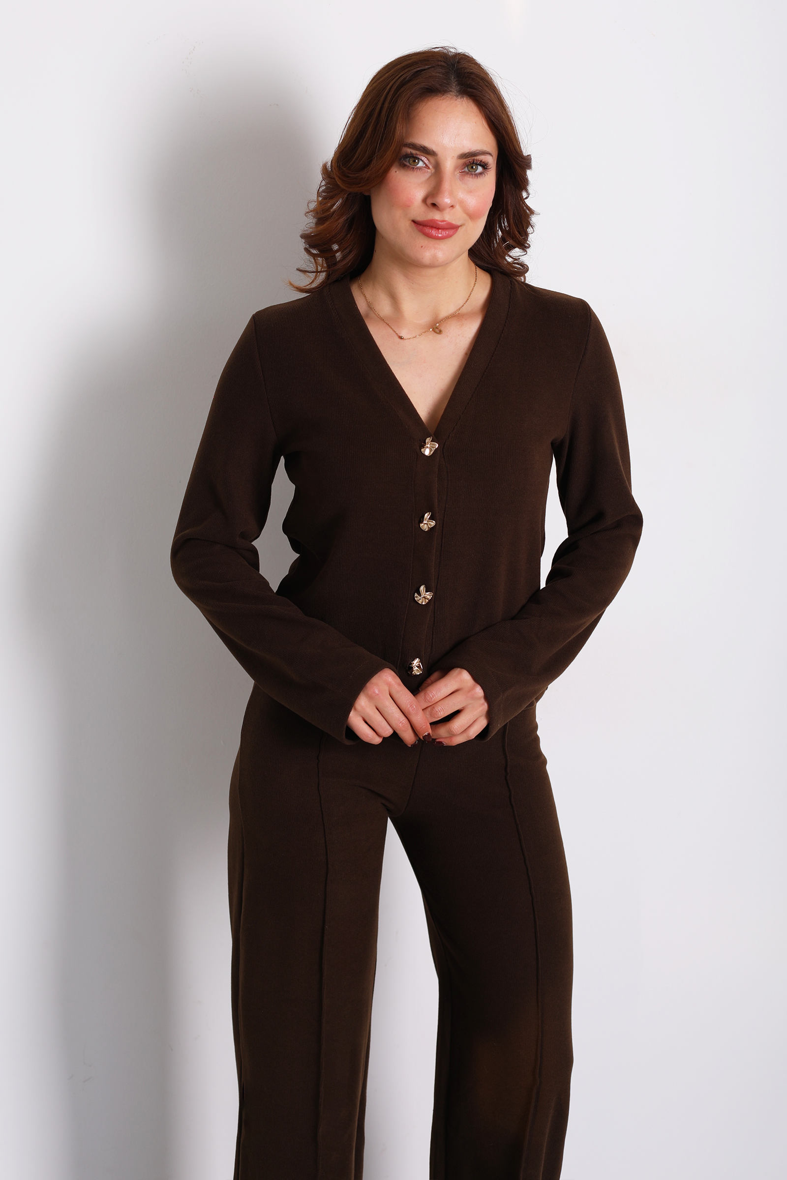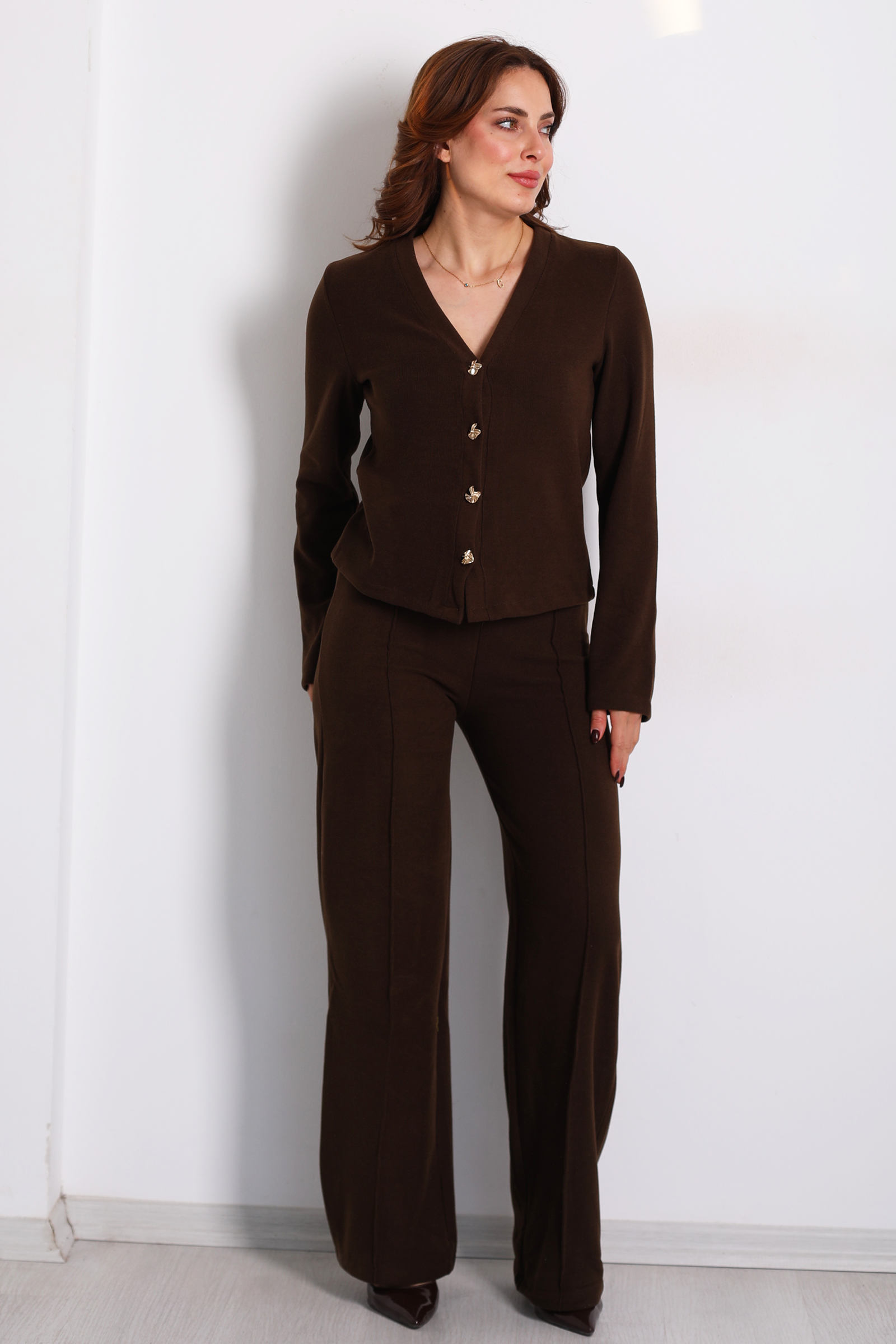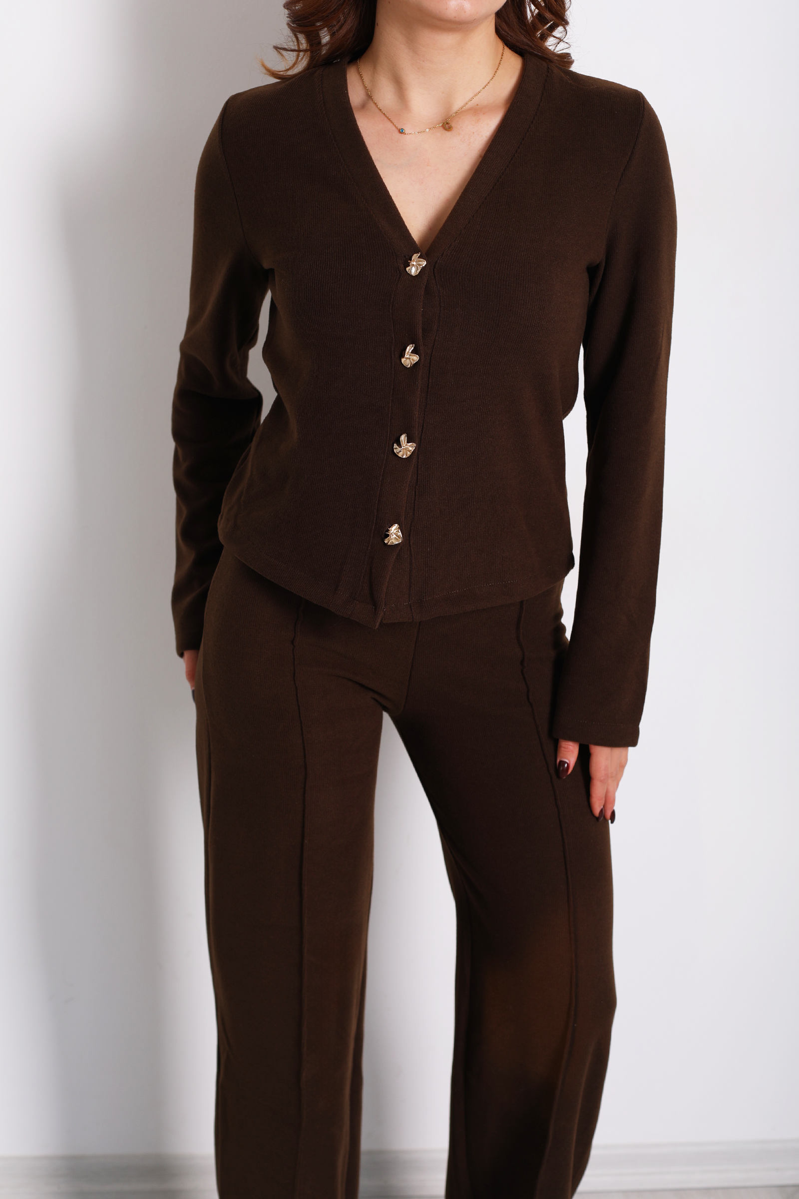 Cımalı Gold Düğmeli Acı Kahve Kadın Selanik Takım, sıcak tonların zarafetini modern dokunuşlarla buluşturan şık bir set parçadır. Gold düğmeli cıma detayları, tasarıma ışık tutan zarif bir ışıltı eklerken, acı kahve tonunun derinliği stilinize sofistike bir hava katar. Selanik kumaşın yumuşak ve esnek yapısı, gün boyu konfor sağlar ve üst‑alt uyumu kombininizi dengeli ve dikkat çekici kılar.