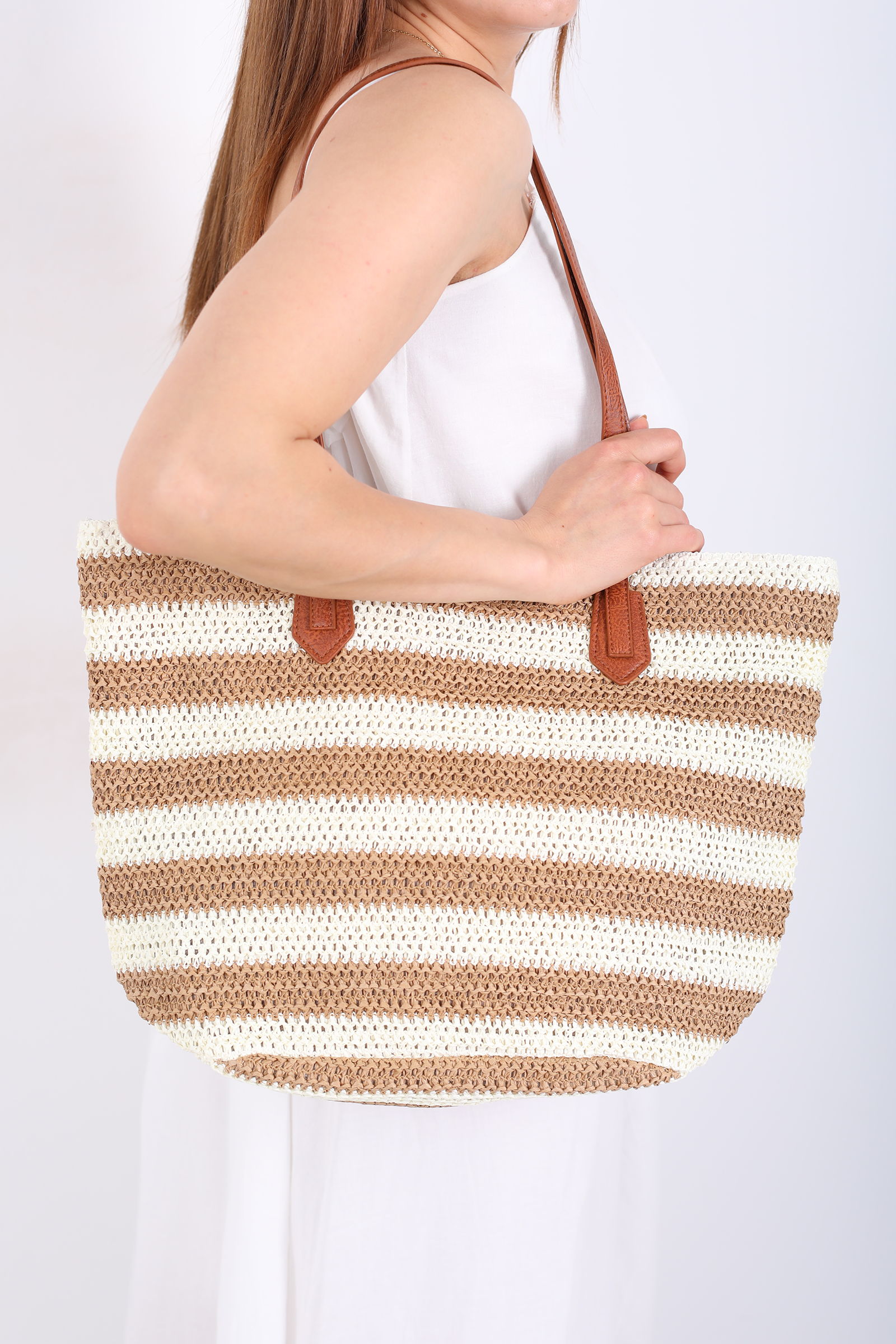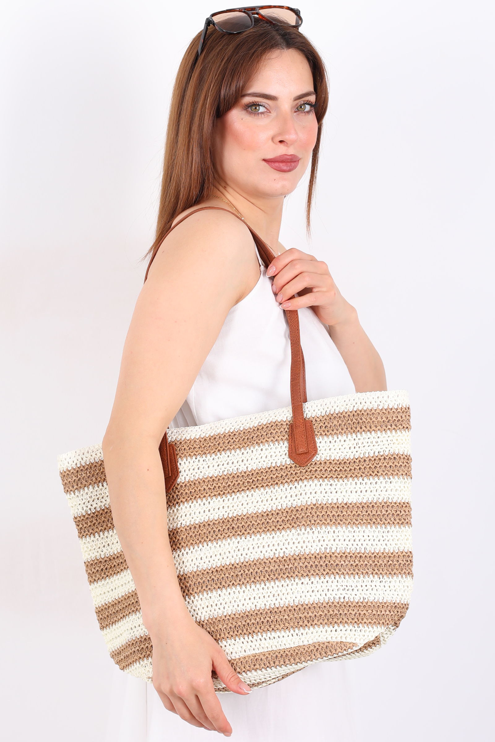 Çizgili Hasır Örme Açık Kahve Plaj Çantası