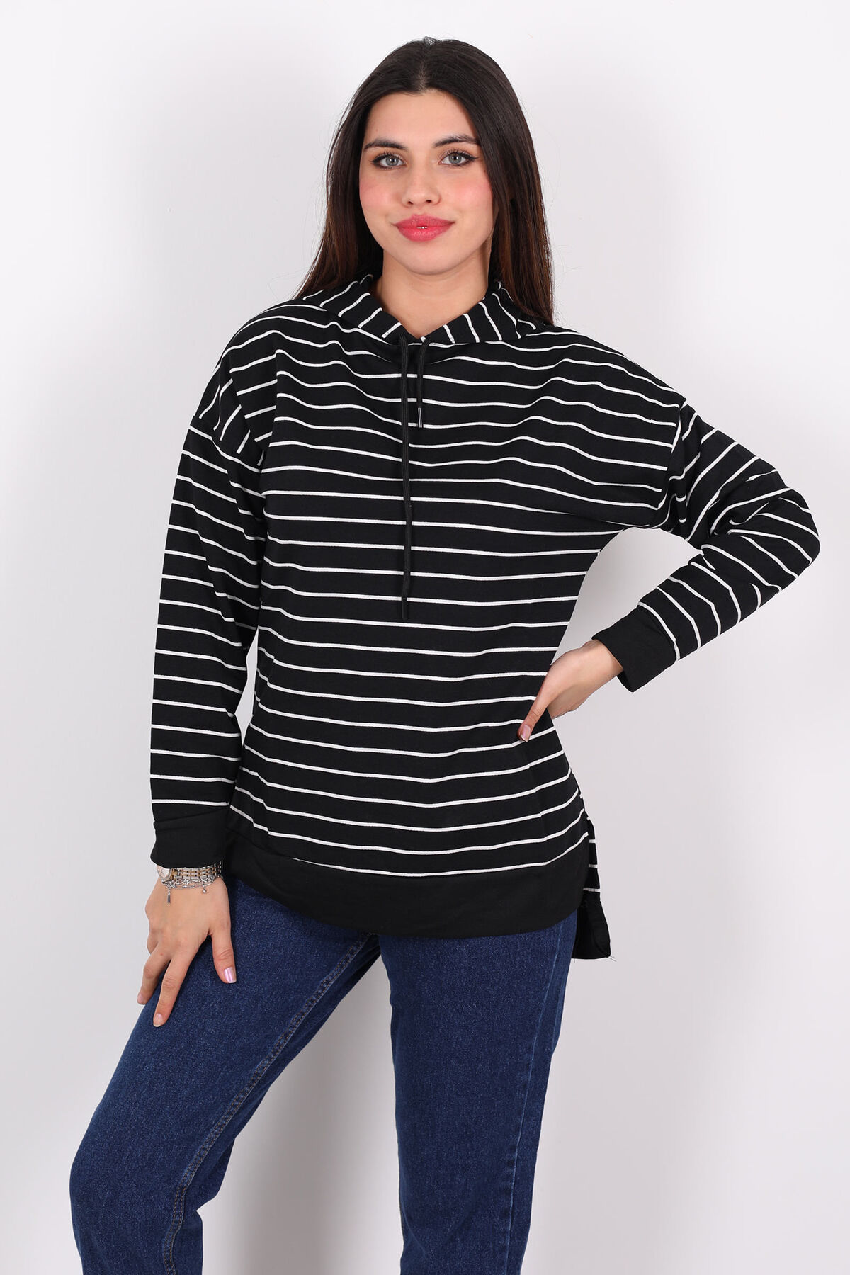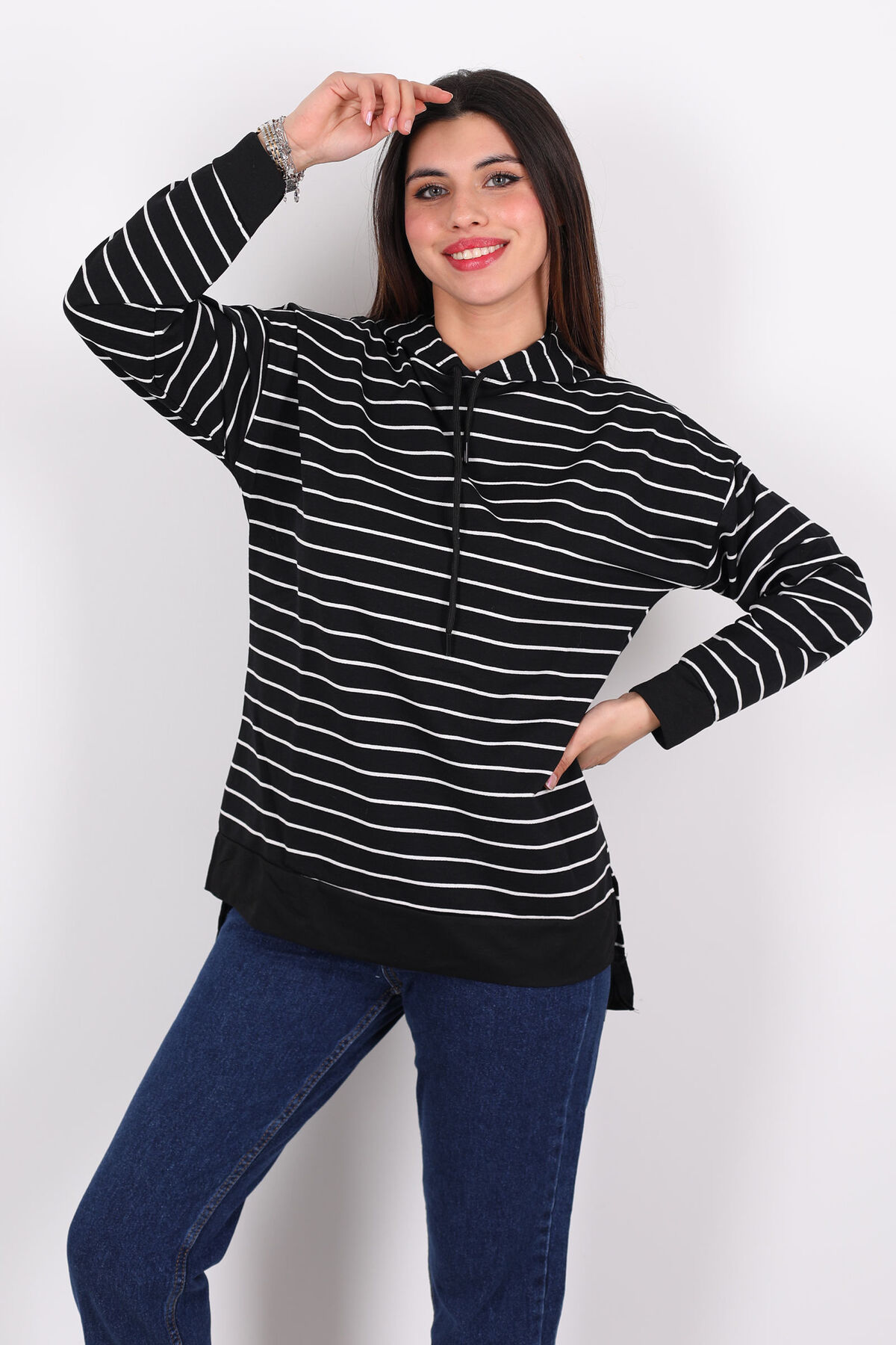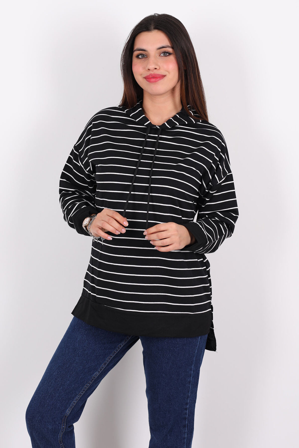 Siyahın gizemini çizgili dokunuşlarla buluşturan bu uzun kapüşonlu sweat, sokak stilinin yeni favorisinden fazlası. Omuzdan bele uzanan dikey çizgiler görsel ritim yaratırken, arka kısmın daha uzun boy kesimi hem beden oranlarını dengeliyor hem de dış giyimde tunik etkisi sunuyor. Kumaşında kullanılan %70 pamuk ve %30 polyester karışımı üç iplik yapısı, yumuşaklıkla sıcaklığı dengeler; kol ve beden dikişlerindeki detaylar dikkatle işlenmiştir.