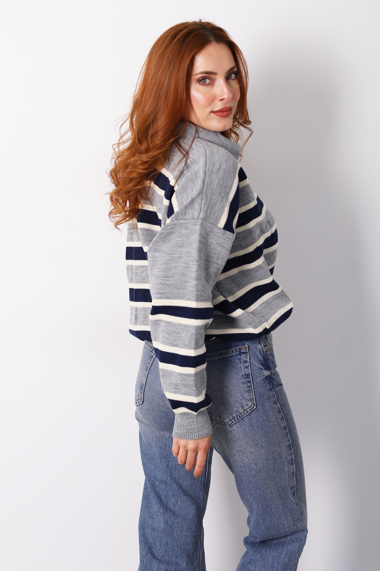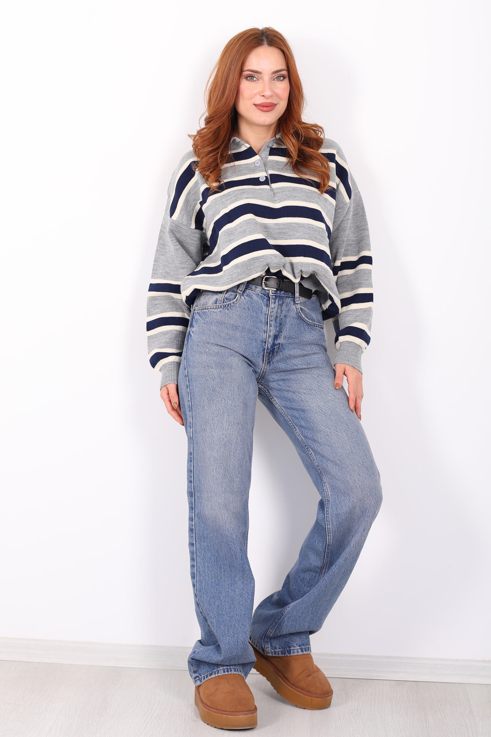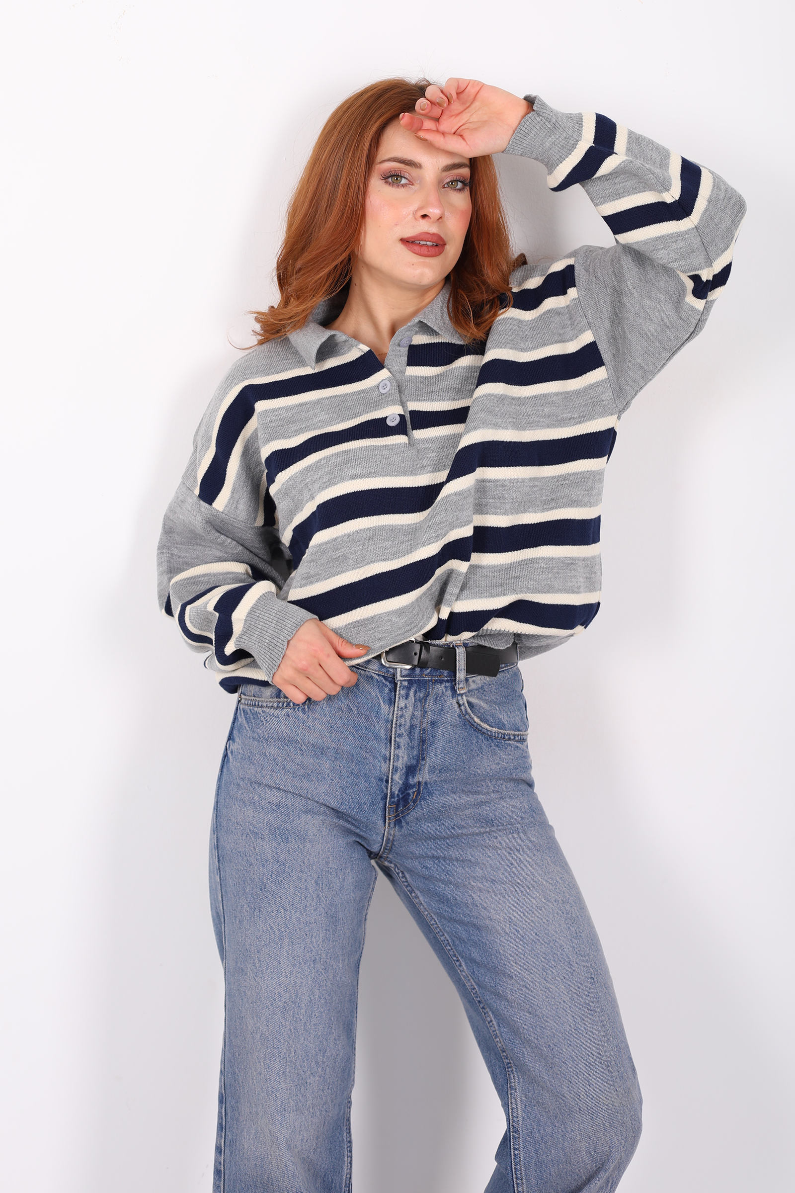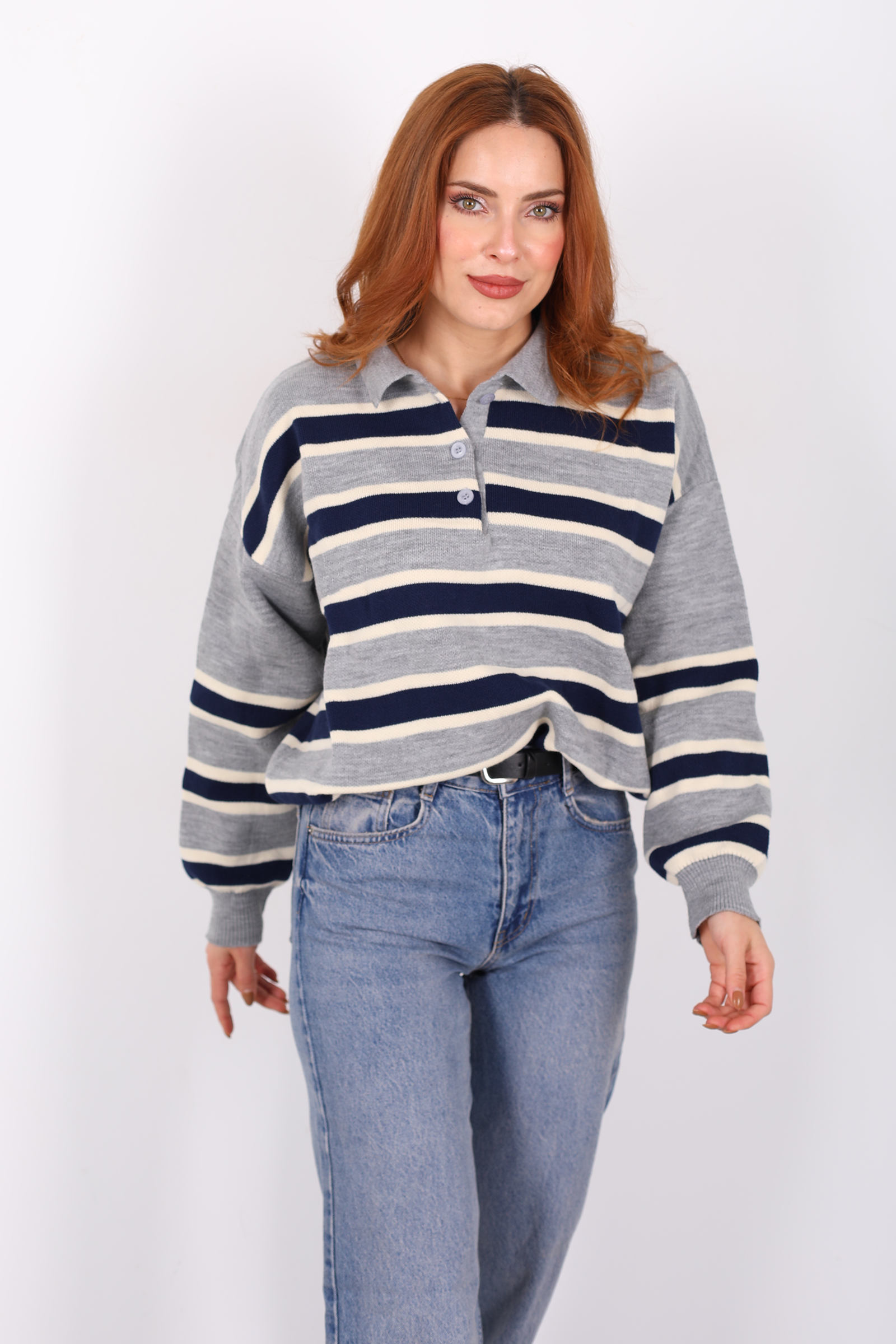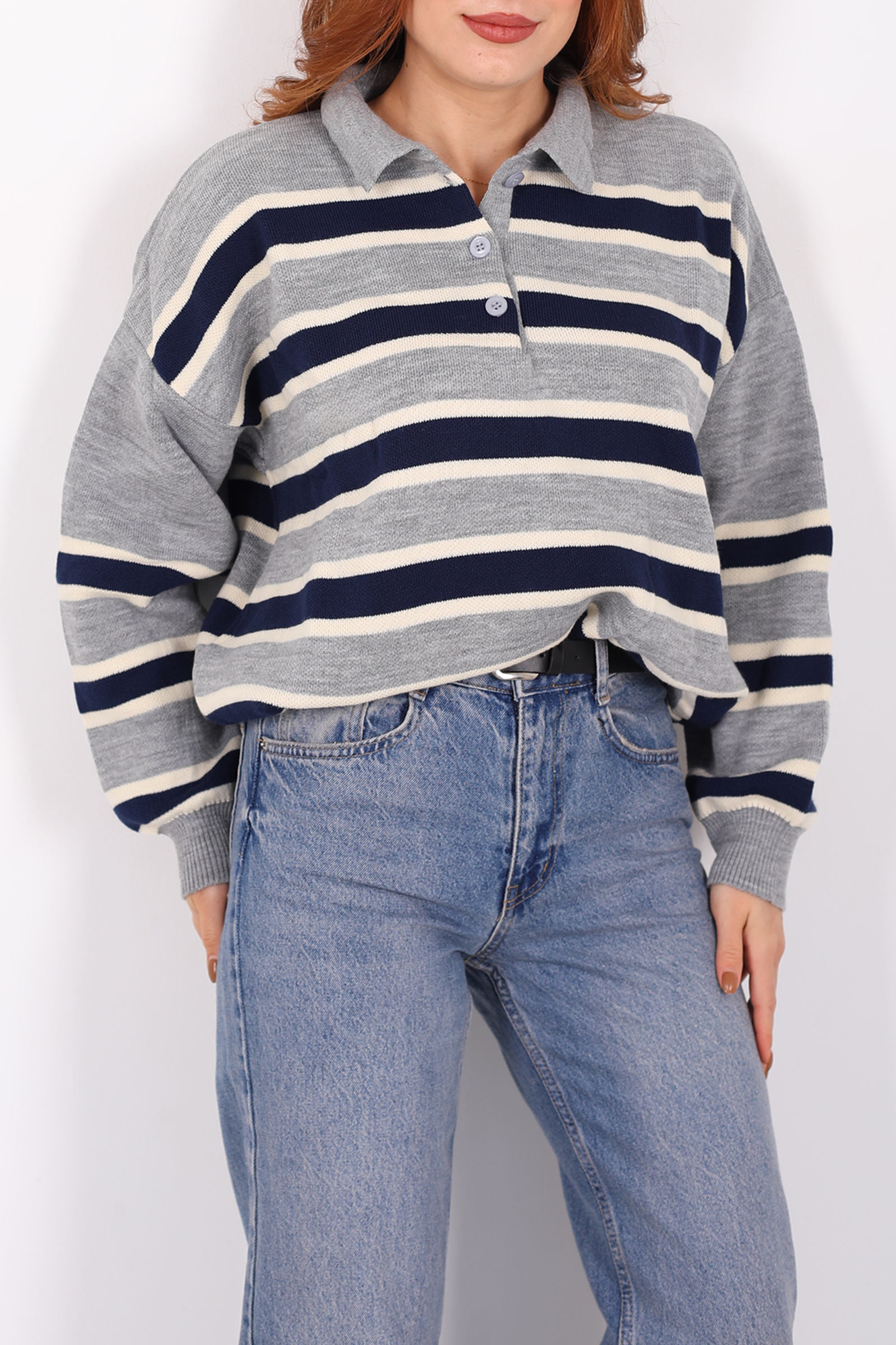 Çizgili Polo Yaka Gri Kadın Triko Kazak