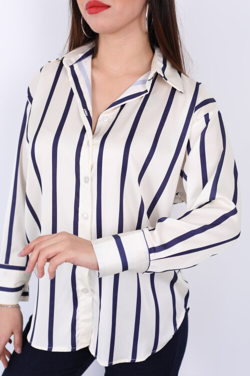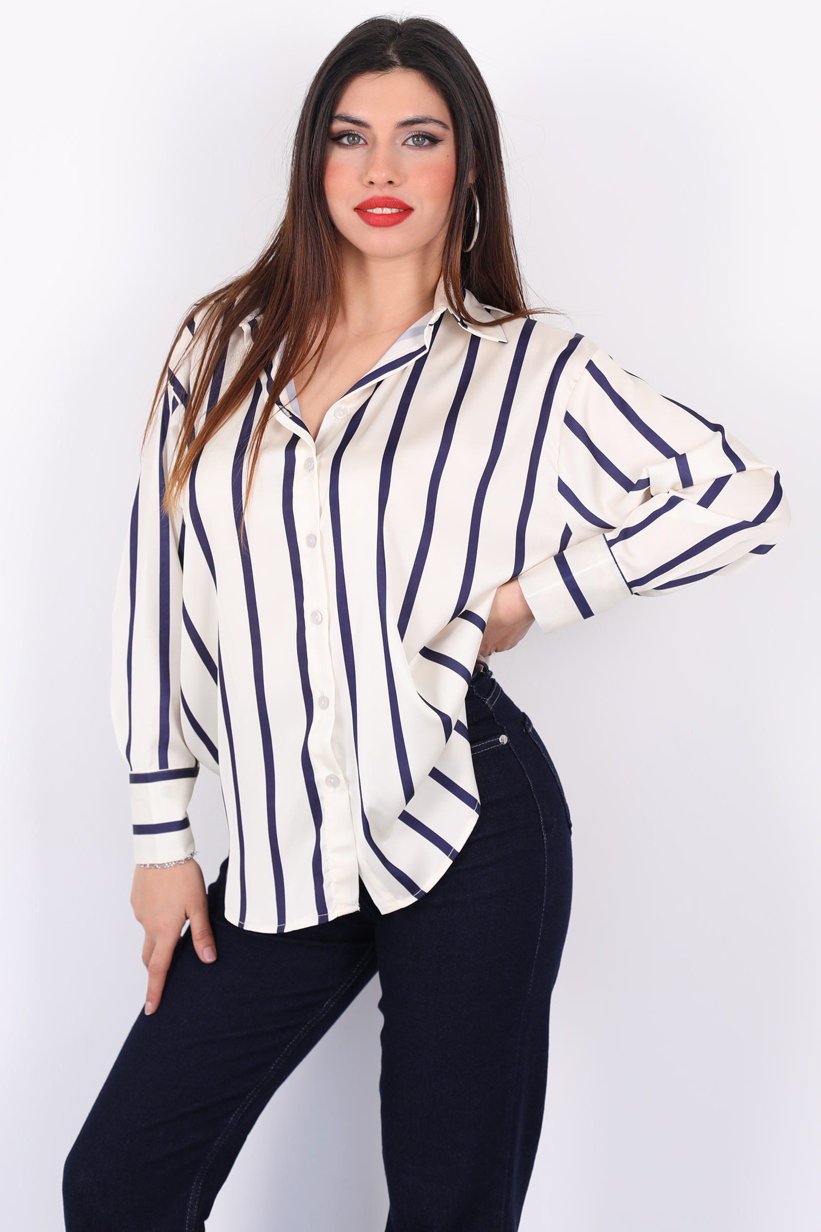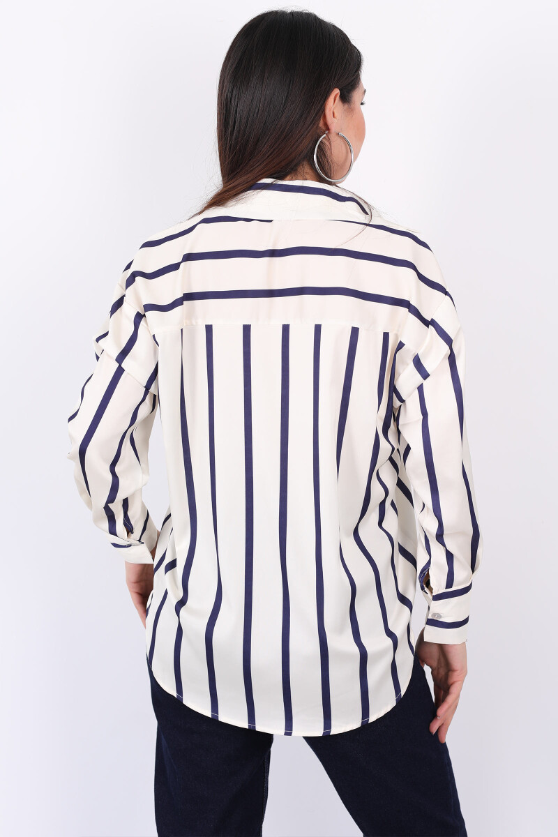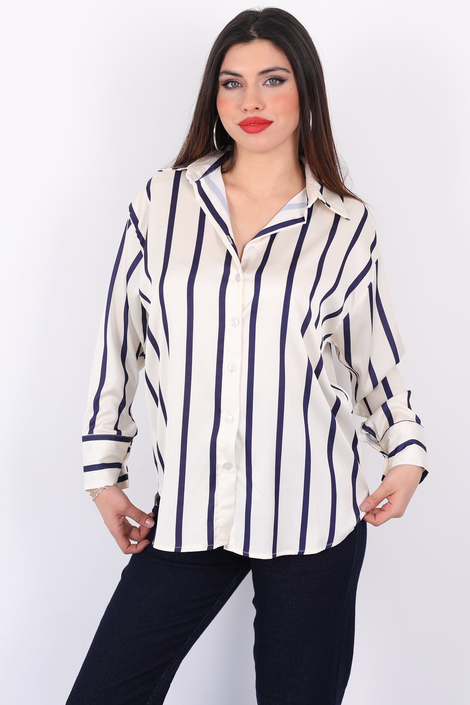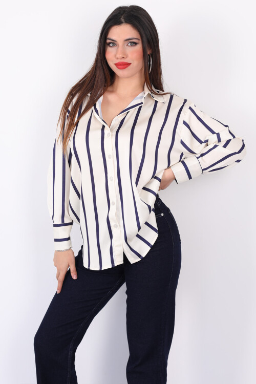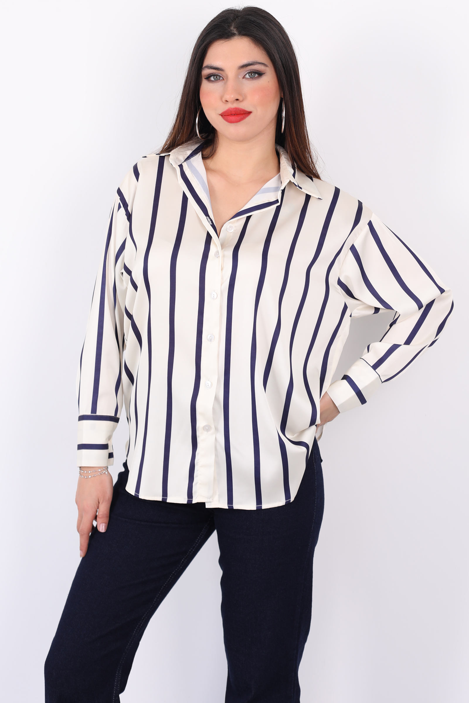 Lacivert tonundaki bu gömlek, üzerindeki ince çizgilerle derinlik kazanıyor ve sade bir tasarımı dinamik bir ifadeye dönüştürüyor. Saten kumaşın parlaklığı ve gömleğin geniş kalıbı, modern bir duruş sunarken tarzınıza zarif bir dokunuş ekliyor.İnce çizgili lacivert kumaş, klasik bir forma modern bir hava katar.