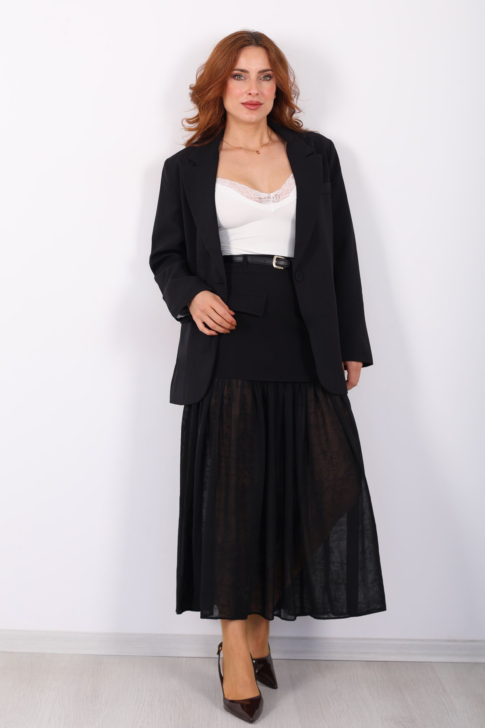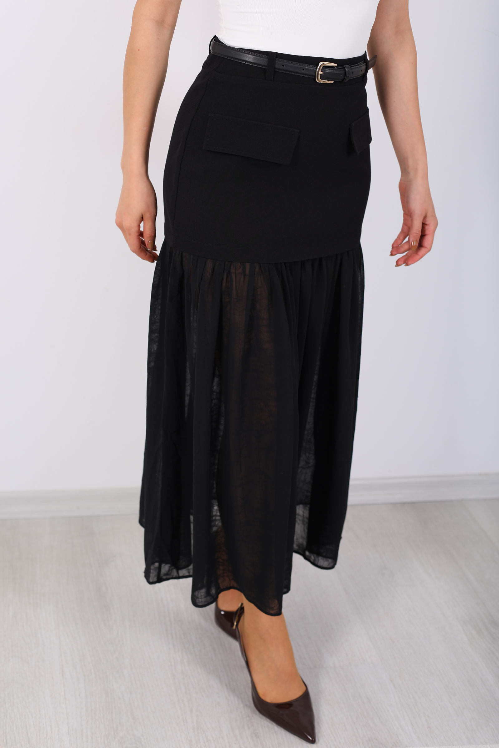 Coral Cepli Pilise Tüllü Kemerli Siyah Kadın Etek