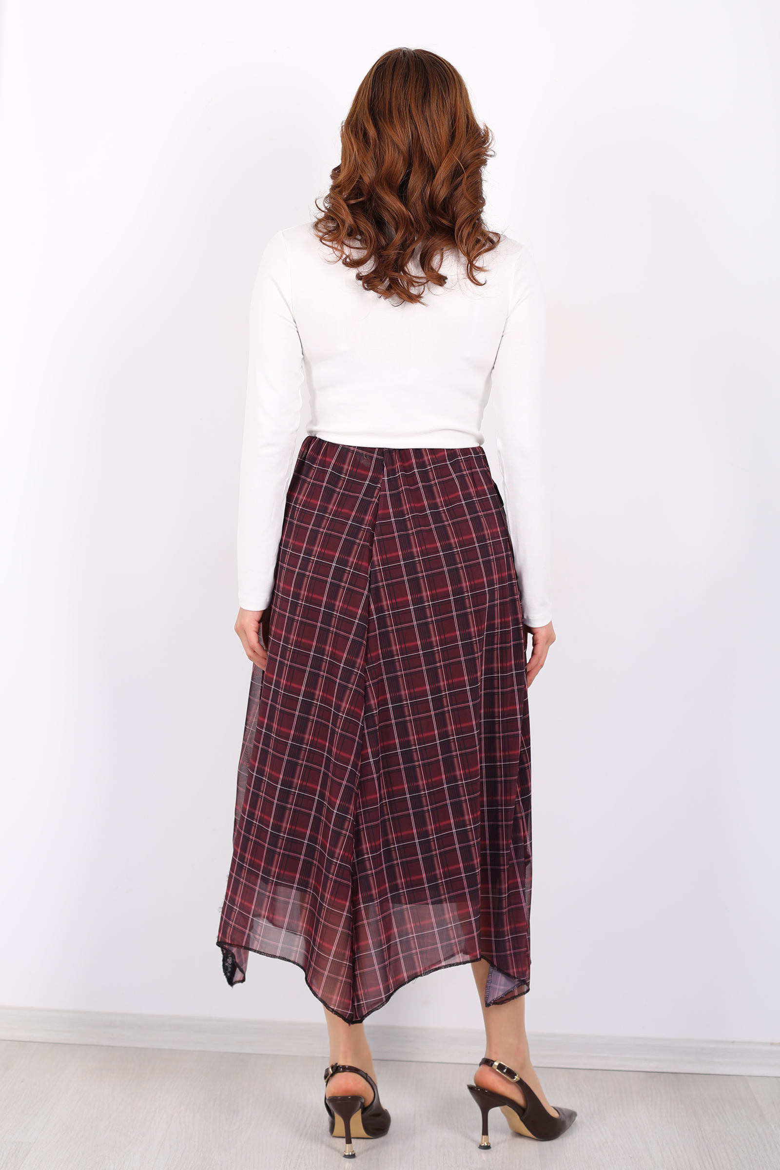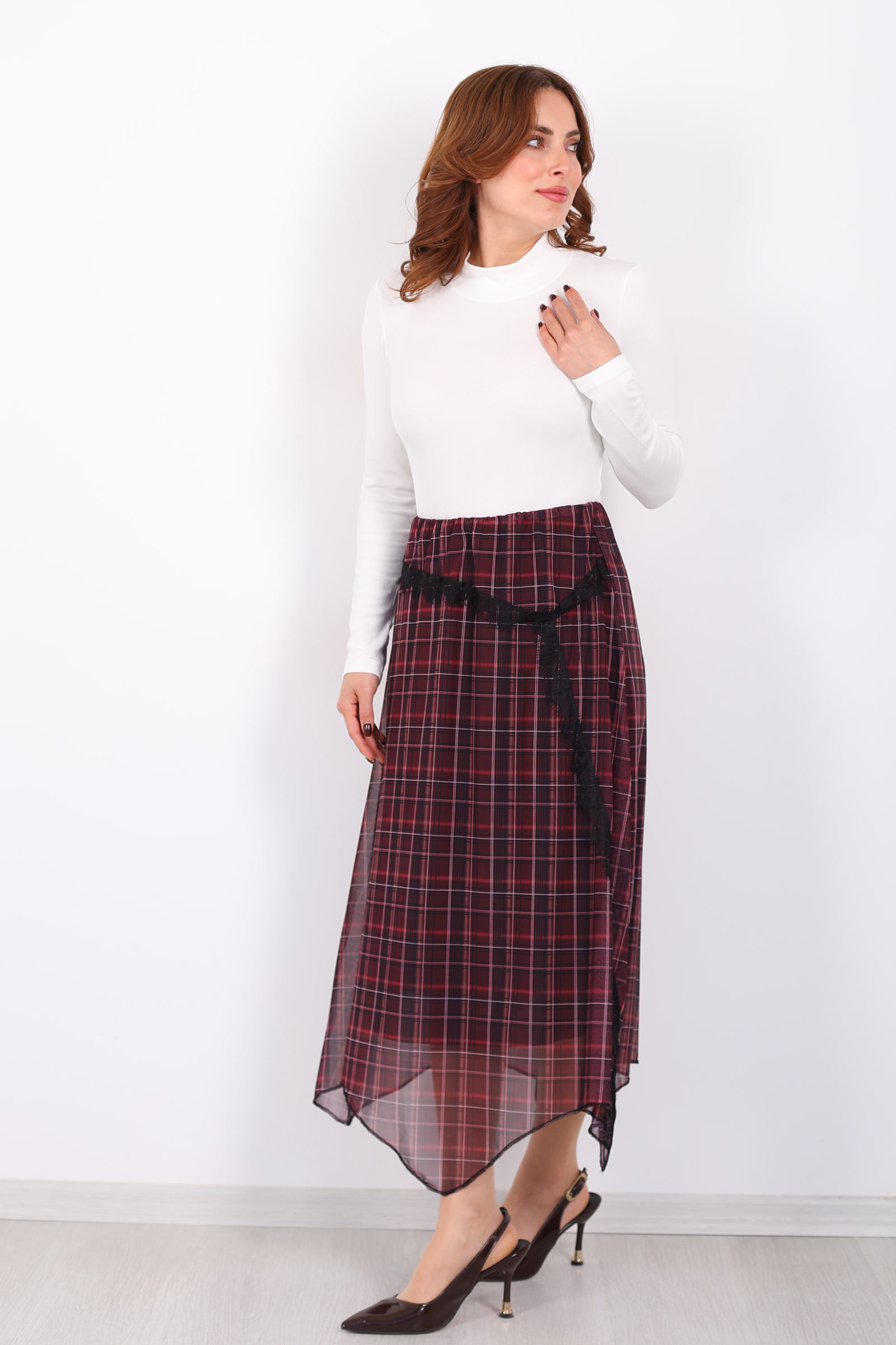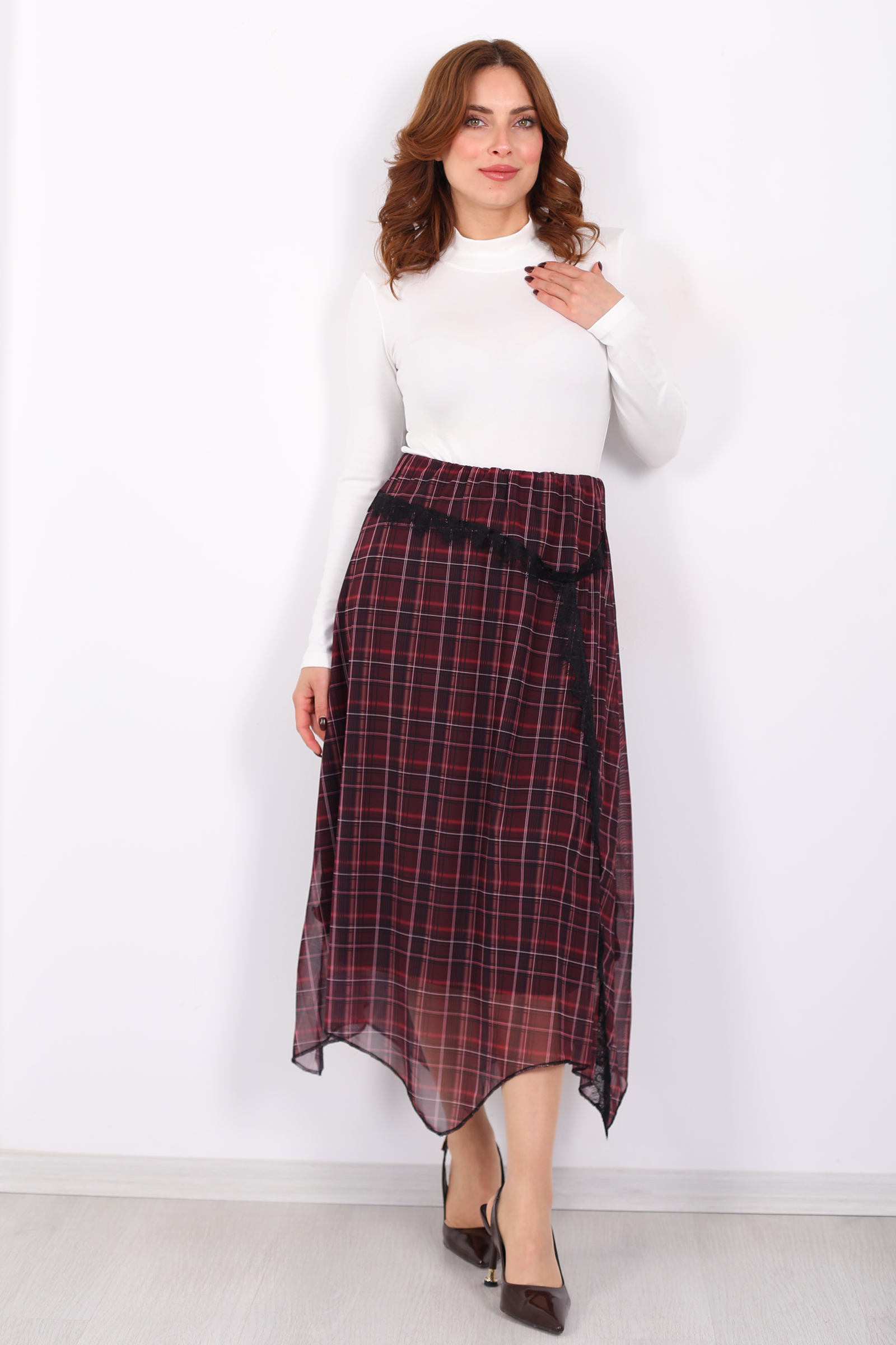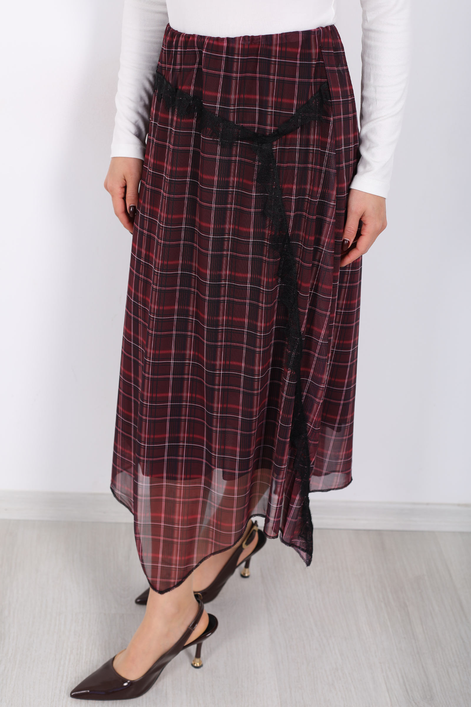 Bu mürdüm ekose desenli kadın eteği, gardırobunuza zarafet ve modern bir dokunuş katmak için tasarlandı. Feminen dantel detayları, klasik ekose desenle bir araya gelerek yeniden yorumlanmış bir stil sunar; her adımda sofistike bir görünüm elde etmenize yardımcı olur. Asimetrik kesimi sayesinde sıradanlıktan uzak, dinamik bir siluet yaratır.