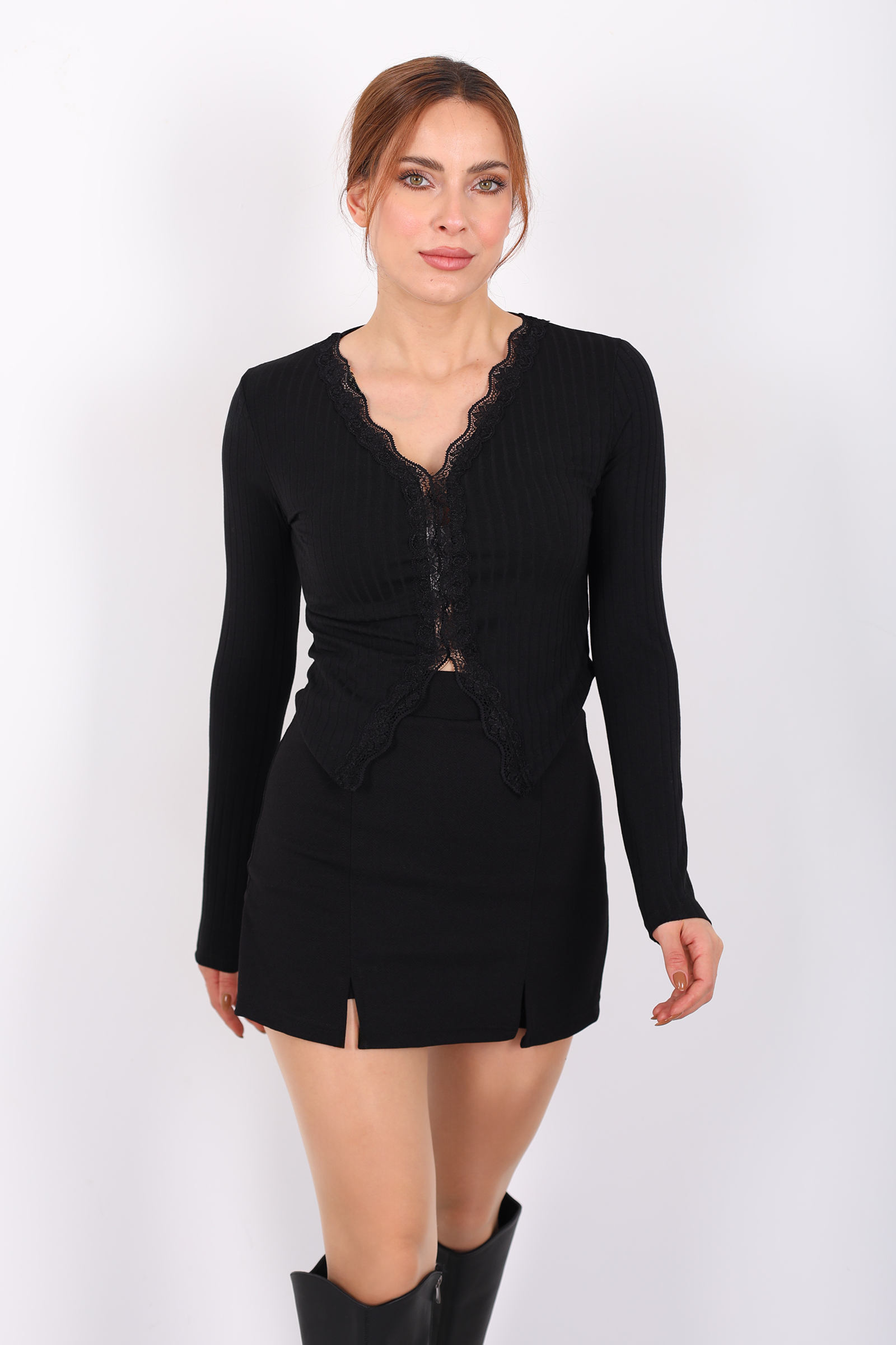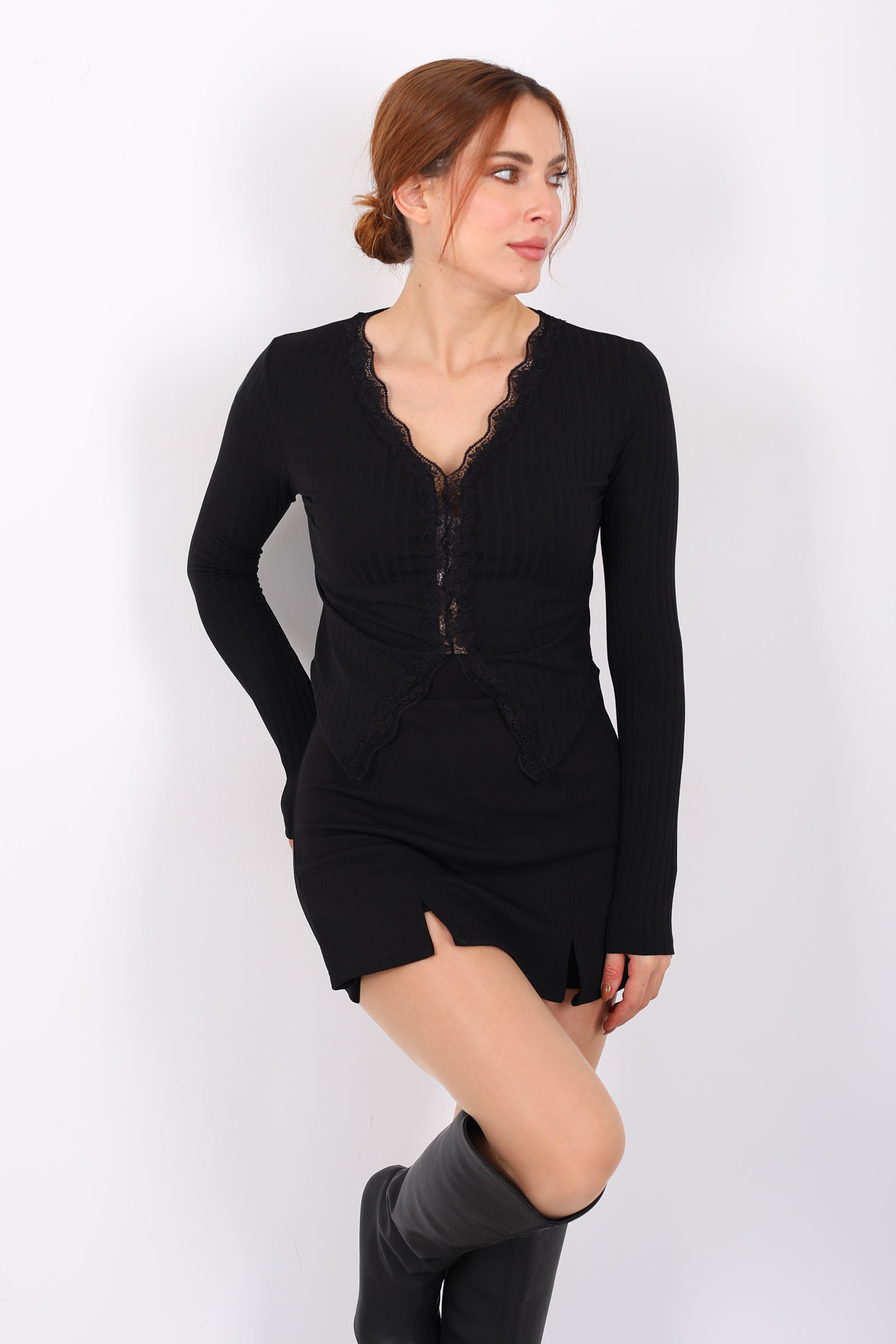 Dantel Detaylı V Yaka Siyah Kadın Fitilli Bluz