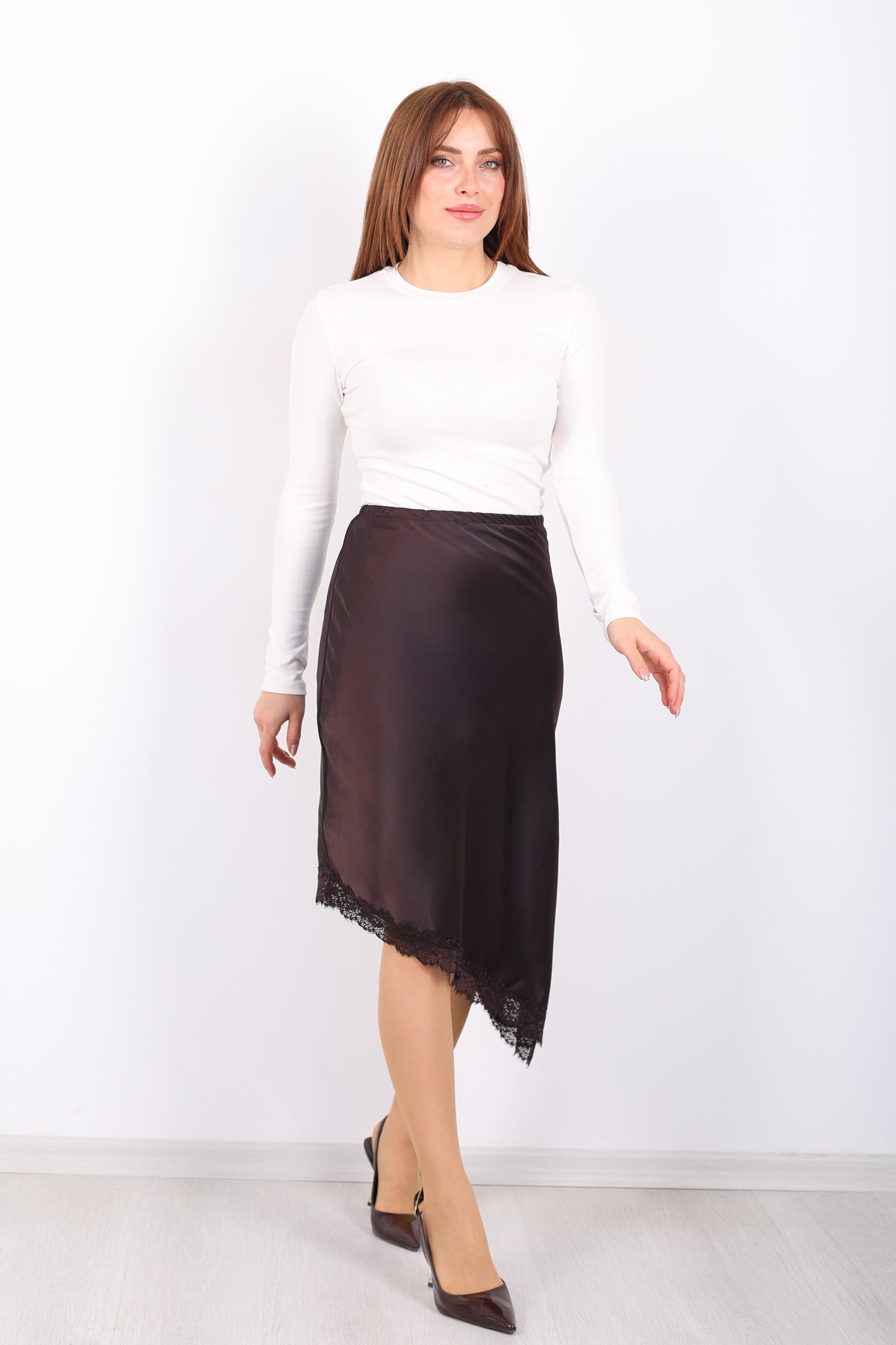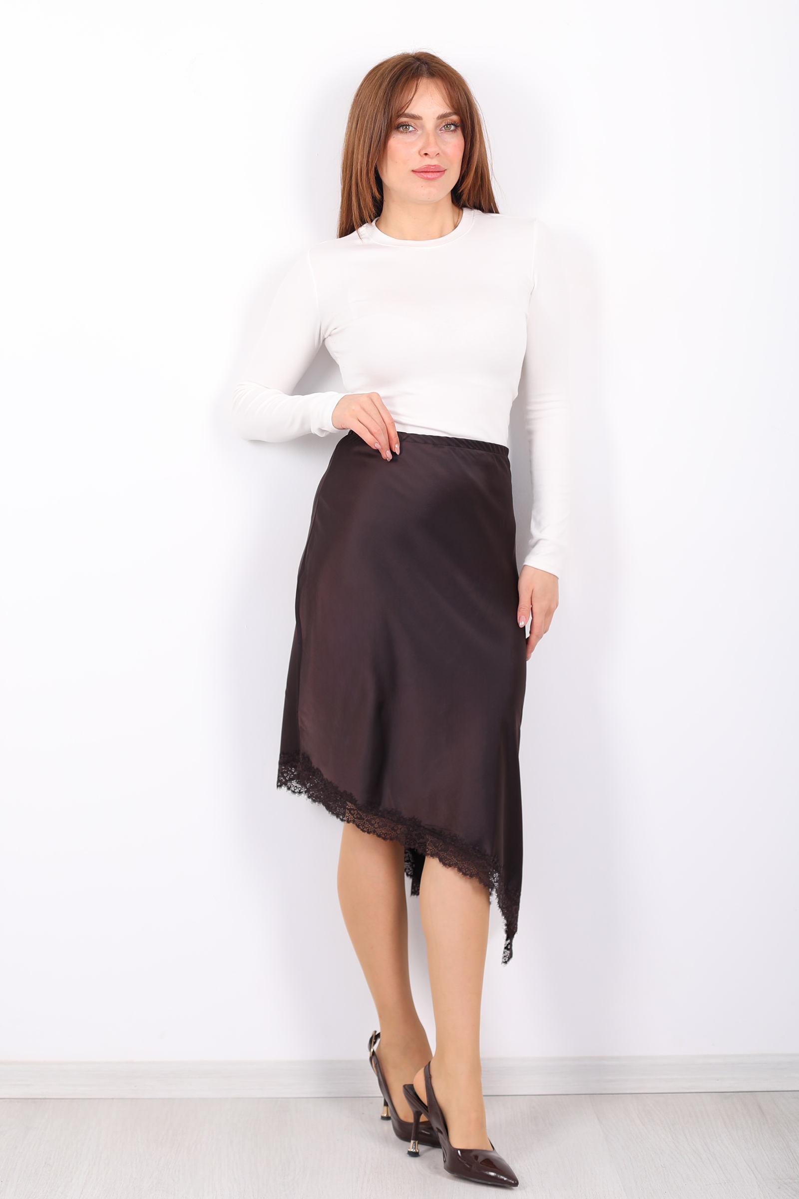 Bu kahverengi saten etek, zarif ve şık detaylarla günlük gardırobunuza sofistike bir dokunuş katıyor. Dantel şeritlerle bezeli asimetrik kesim ve yırtmaç tasarımıyla her adımda akıcı bir siluet sunar; saten kumaşın hafif parlaklığı stilinizi tamamlar. Derin kahverengi tonu, nötr üstler ve şık topuklularla kombinlendiğinde hem gündüz şehir stilinde hem de akşam etkinliklerinde etkileyici bir görünüm yaratır. İnce topuklu sandaletler veya klasik basic tişörtlerle farklı havası yakalanabilir — bu etek stilinize romantik bir karakter kazandırır.