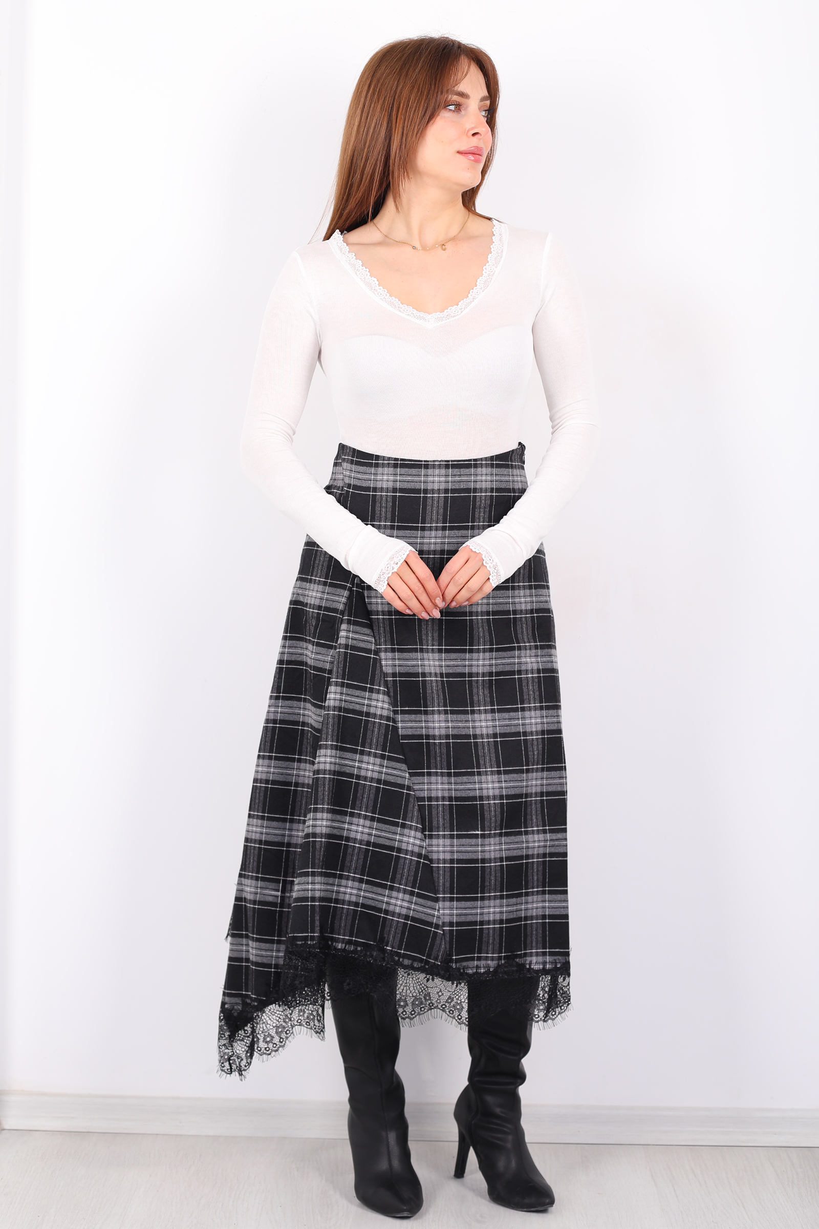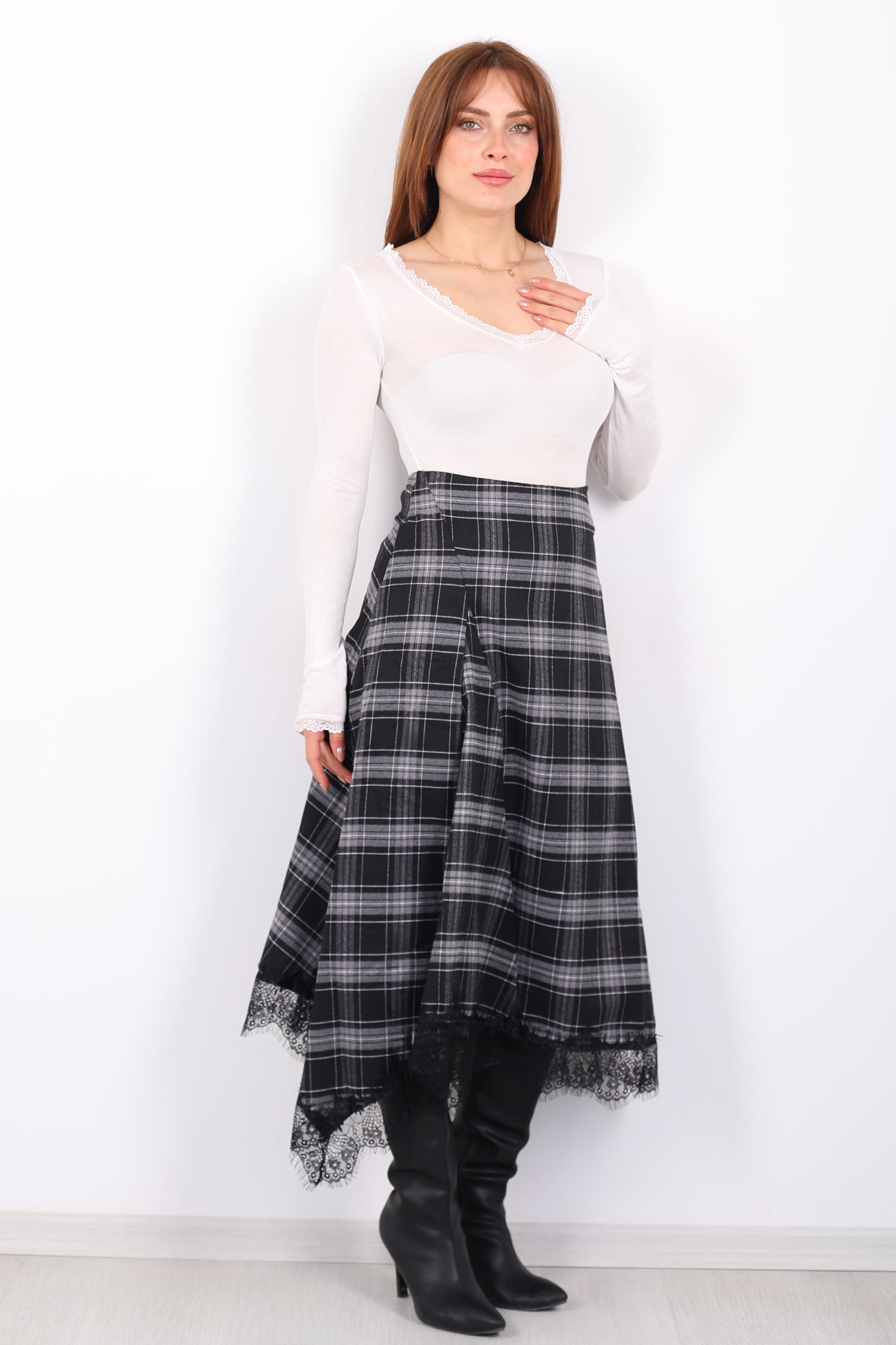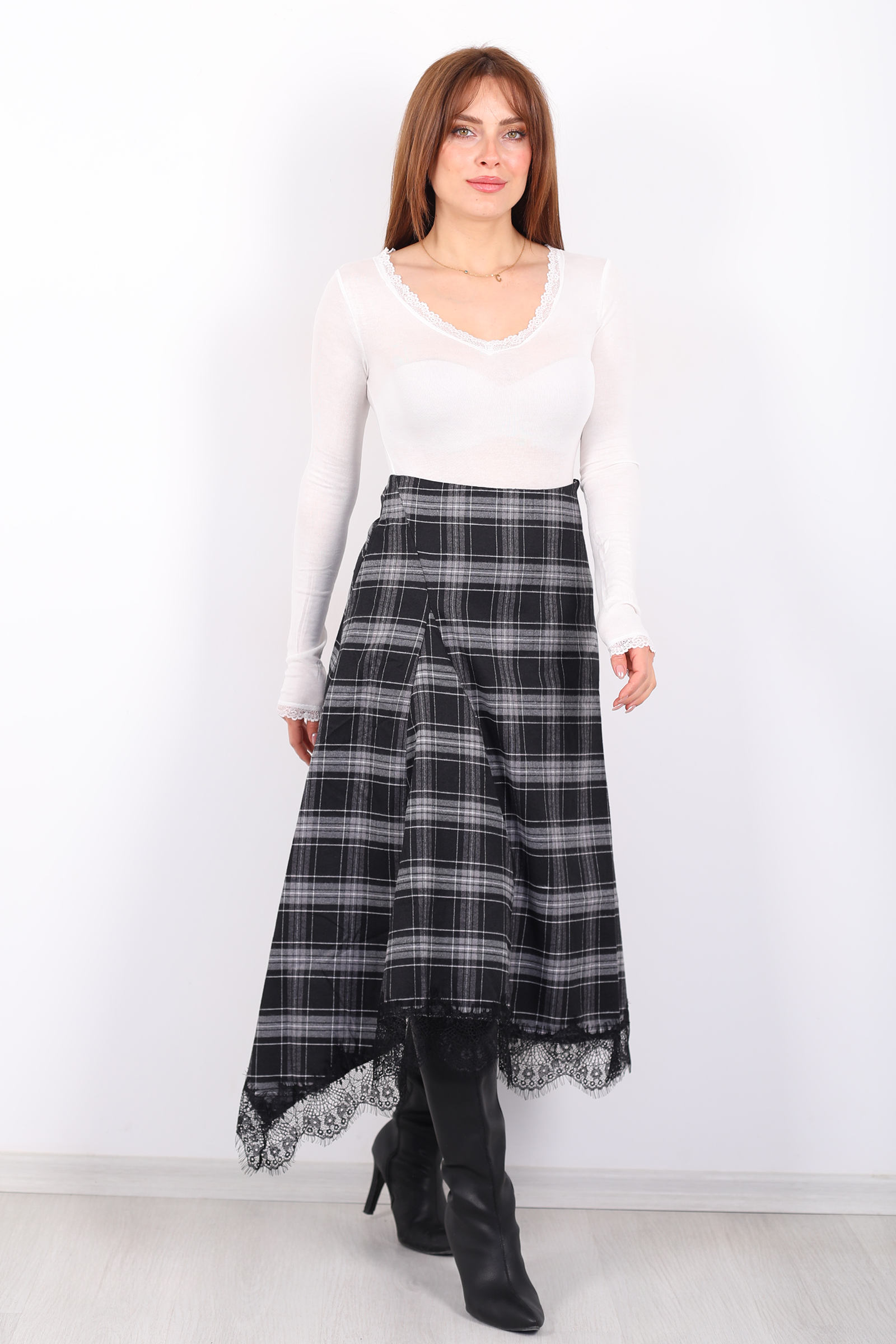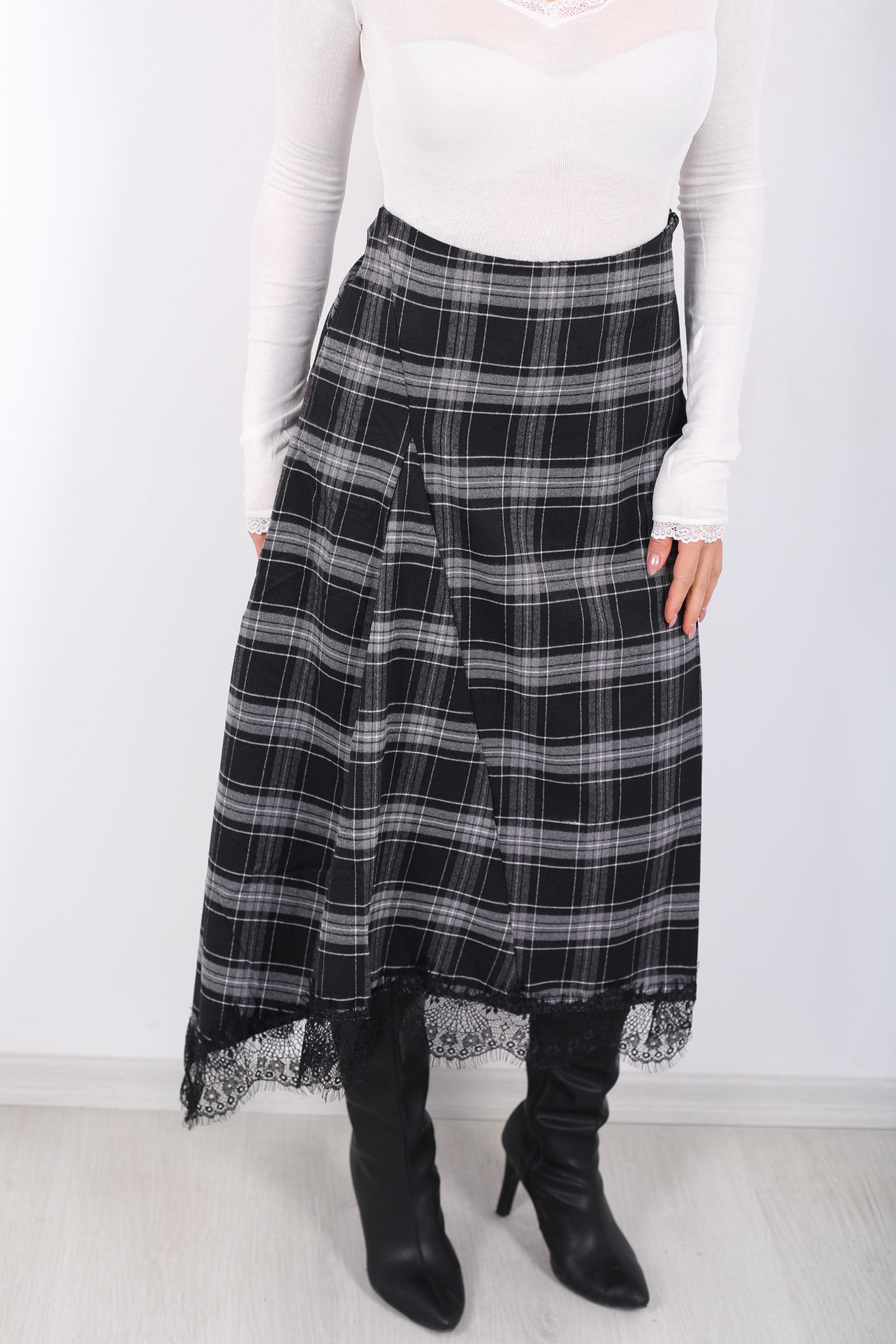Bu siyah ekose desenli etek, asimetrik kesimi ve zarif dantel detayları ile klasik deseni modern çizgilerle harmanlıyor. Kareli desenin dinamik yapısı eteğe hareket kazandırırken, dantel süslemeler feminen bir dokunuş ekleyerek tarzınızı öne çıkarır. Akıcı kumaş ve modern kesim, silueti zarifçe sarmalayıp kolay uyum sağlar; bel hattı ise farklı üstlerle kombinlendiğinde şık kontrastlar yaratır. Jean ve basic bir tişörtle rahat bir sokak stili yakalayabilir; bluz ve topuklularla akşam kombinlerinizi sofistike bir seviyeye taşıyabilirsiniz. Dolabınıza hem feminen hem özgün bir karakter kazandıracak bu etek, modern stilin favorileri arasında yer alacak.