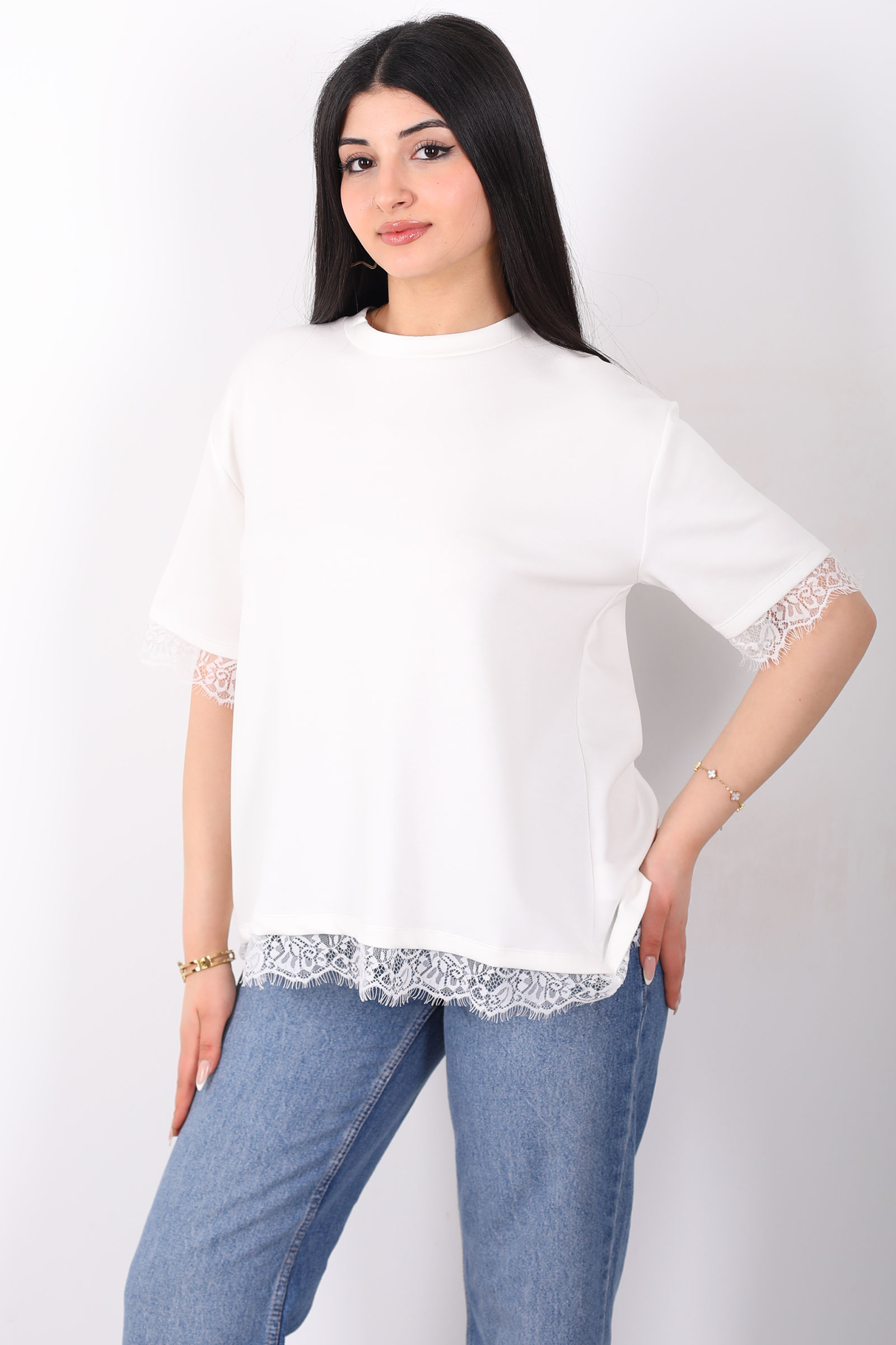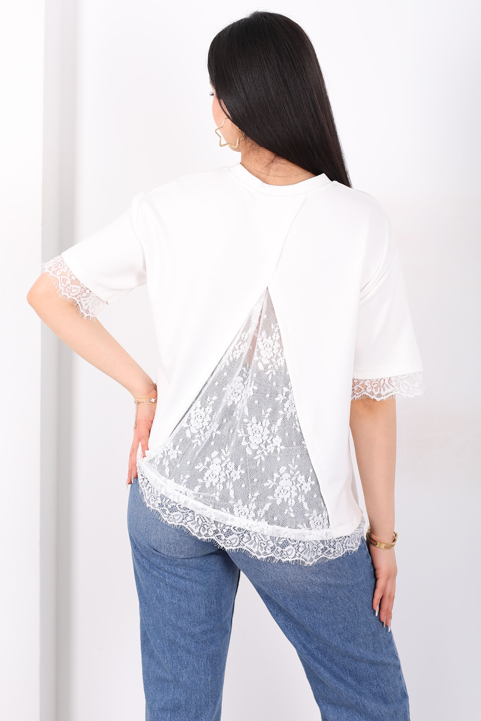 Dantelli Çan Kesim Bisiklet Yaka Beyaz Kadın T-Shirt