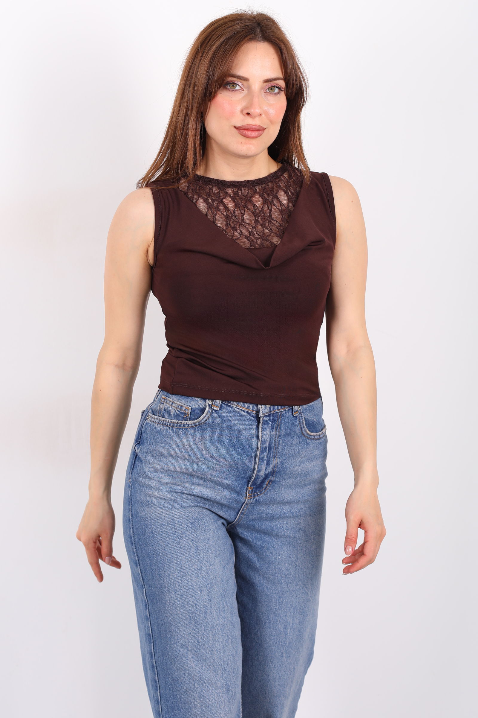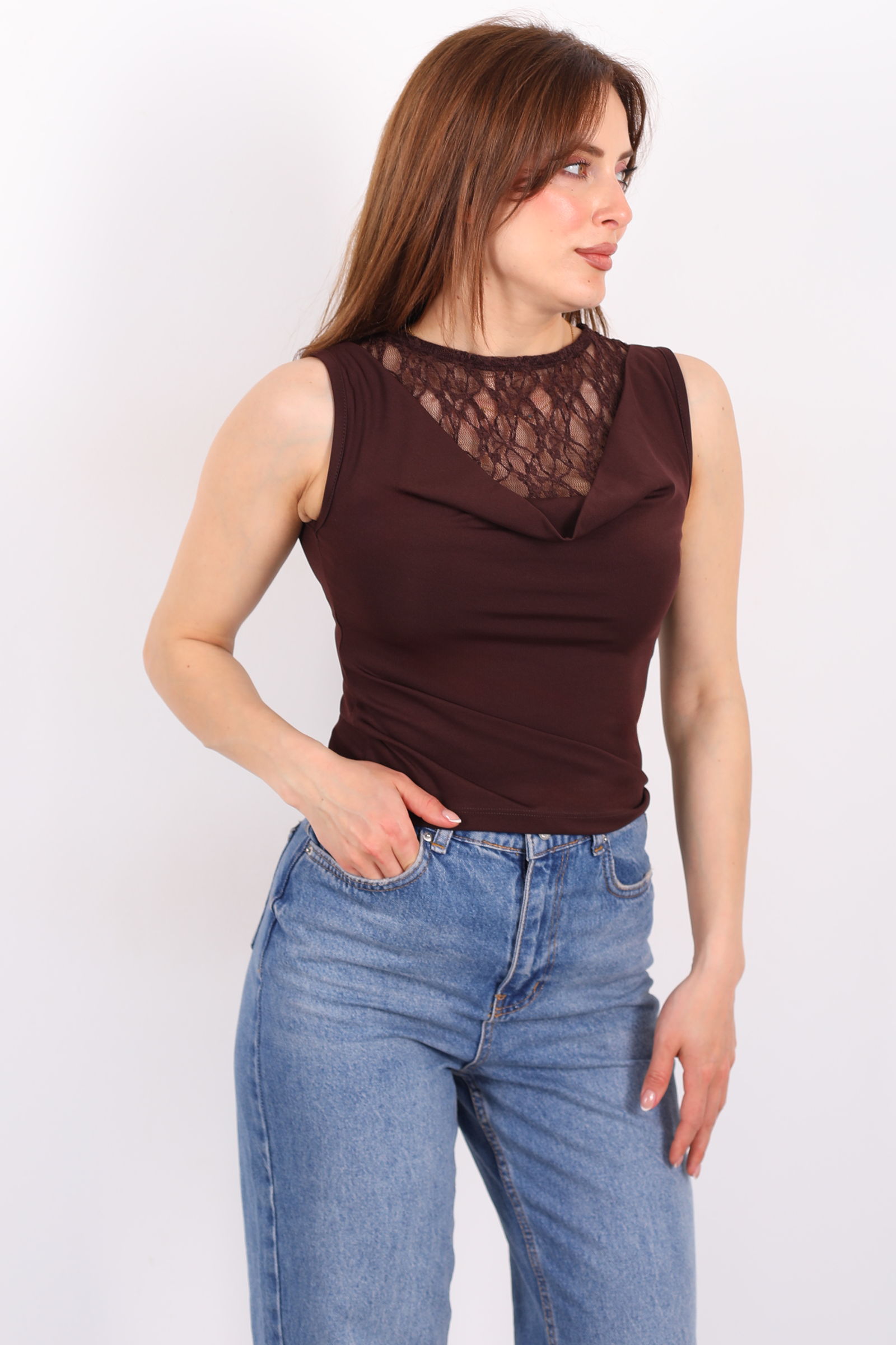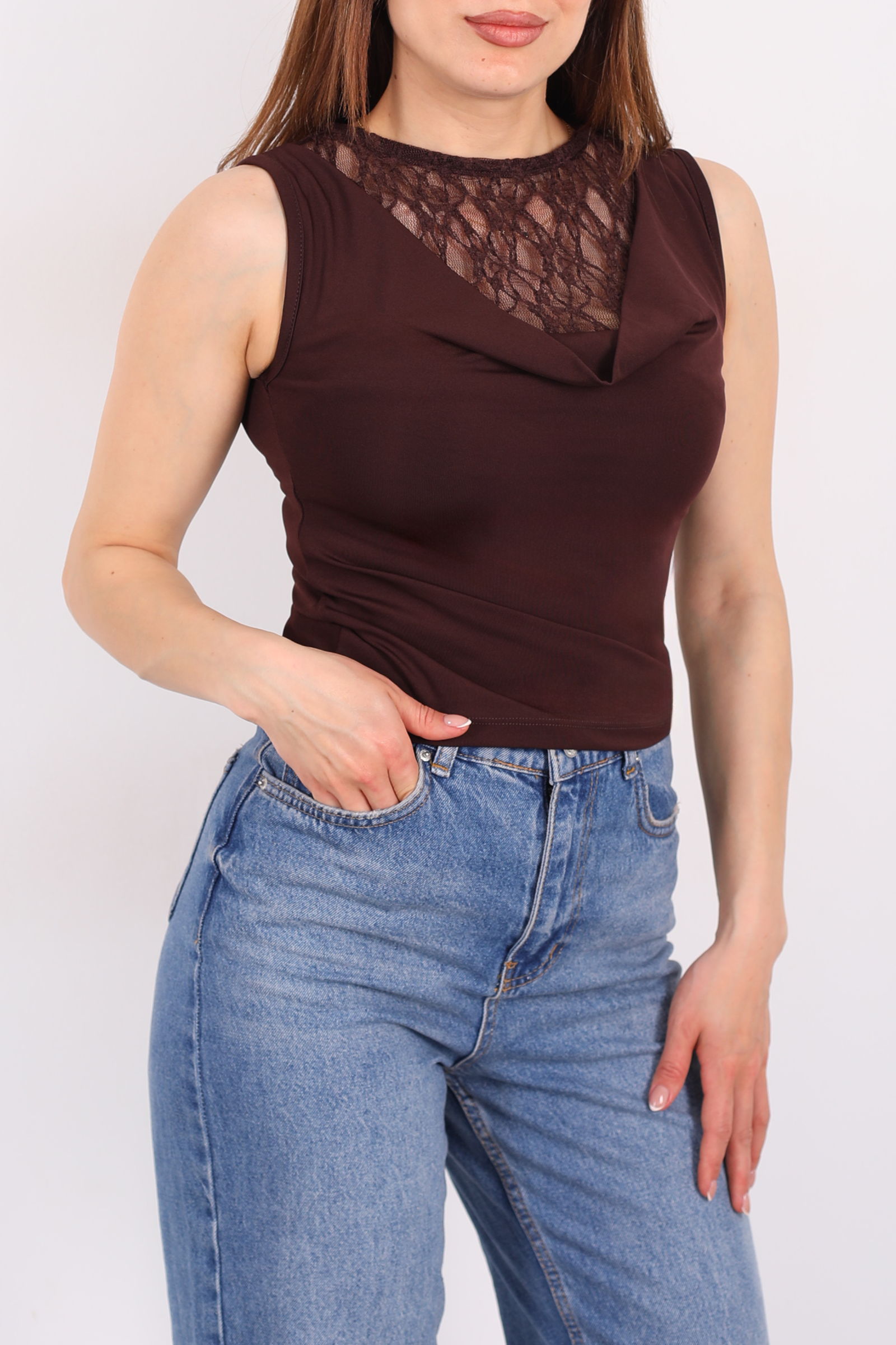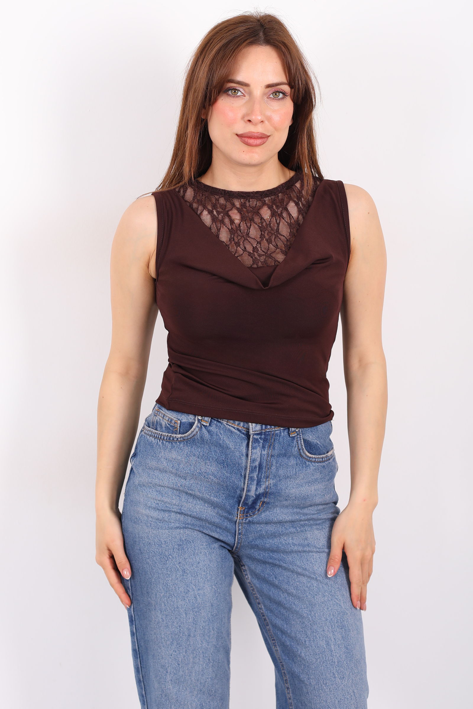 Degaje Yaka Dantelli Kadın Kahverengi Kolsuz Bluz