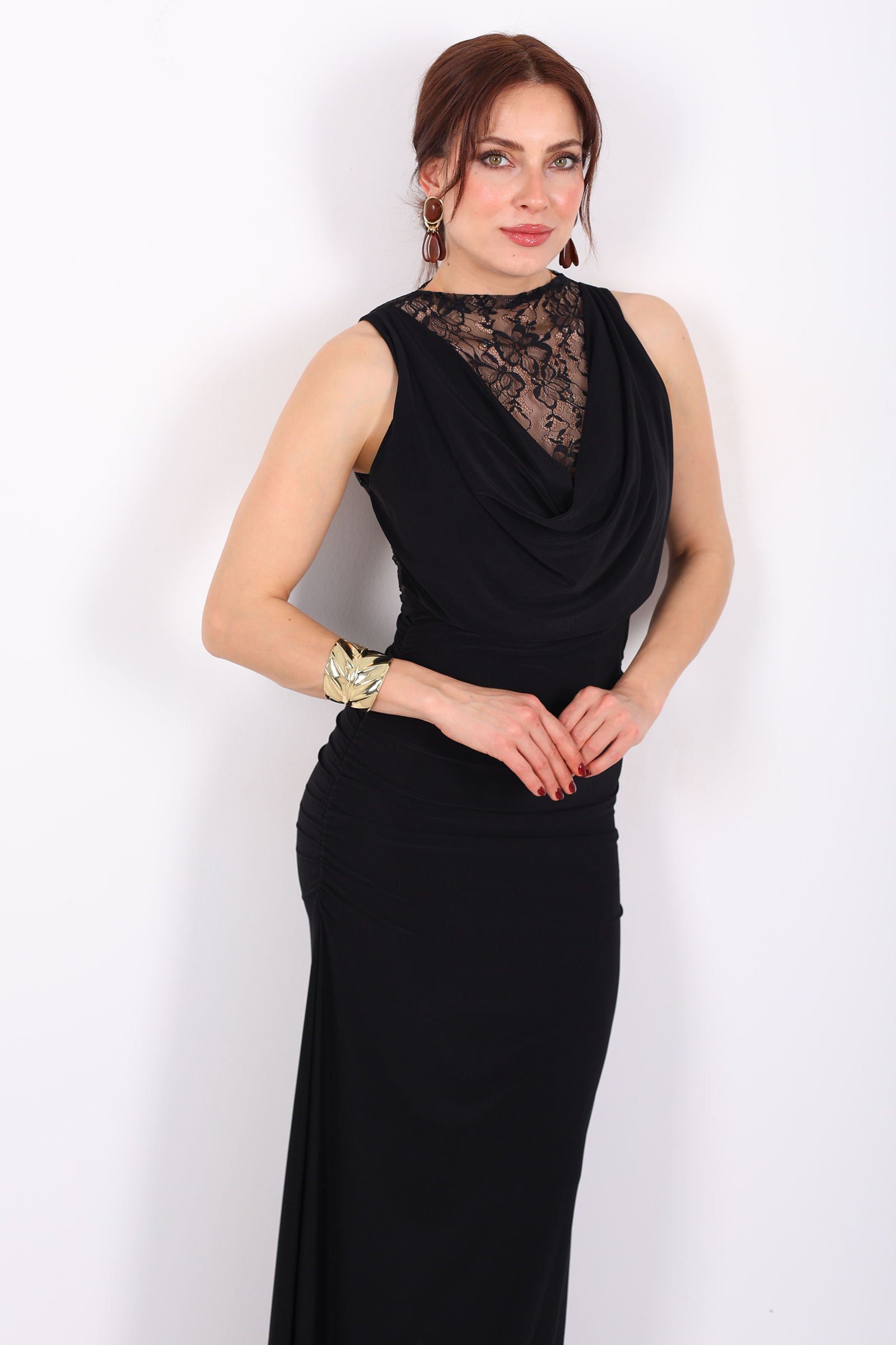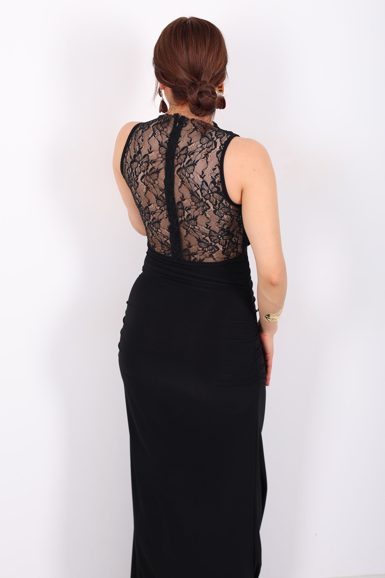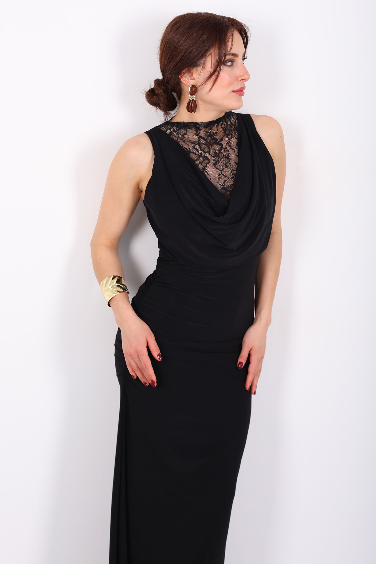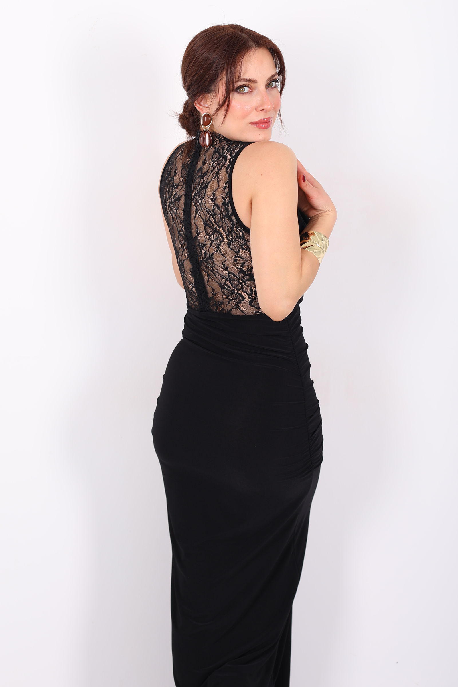Degaje yakanın feminen çizgisiyle tasarlanan bu siyah elbise, ön ve arkadaki dantel detaylarıyla zarif bir hareket hissi sunar. Sade siluetinin içine yerleştirilen dantel işçilikler, minimal ama dikkat çekici bir estetik yaratır. Günlük stilinize sofistike bir dokunuş eklemek istediğinizde veya akşam etkinliklerinde stilinizi öne çıkarmak istediğinizde ideal bir parçadır.