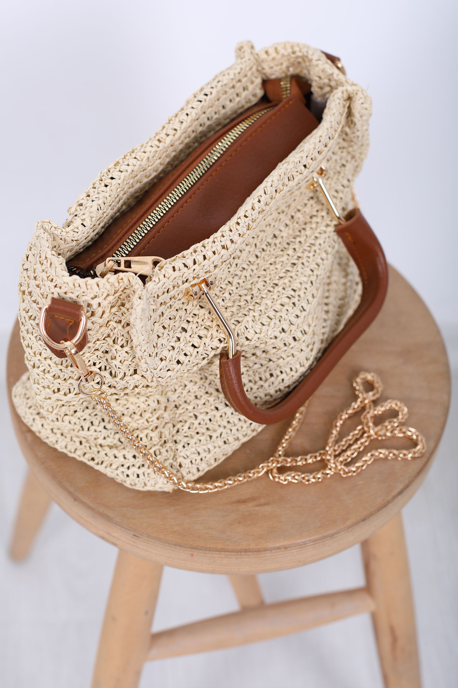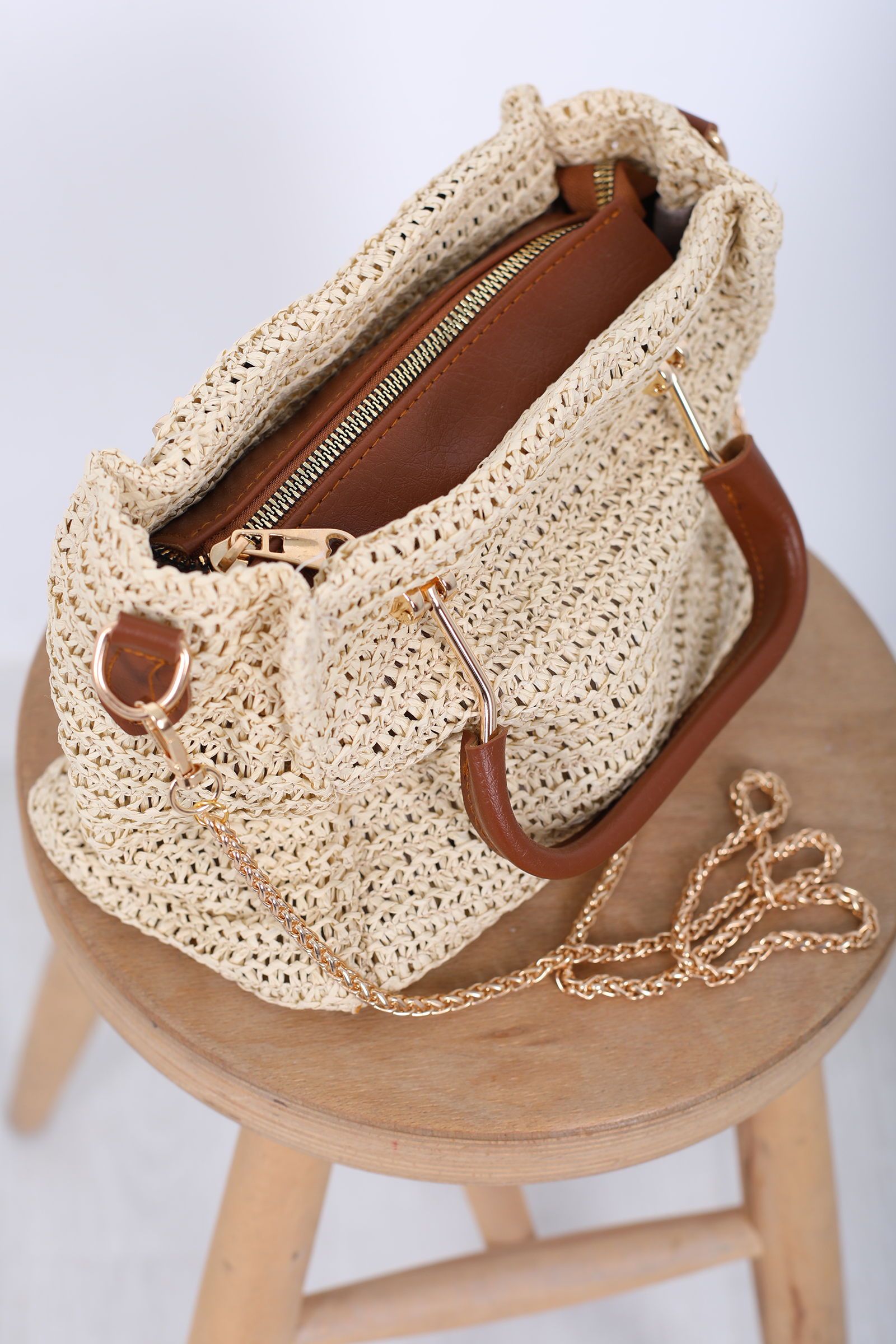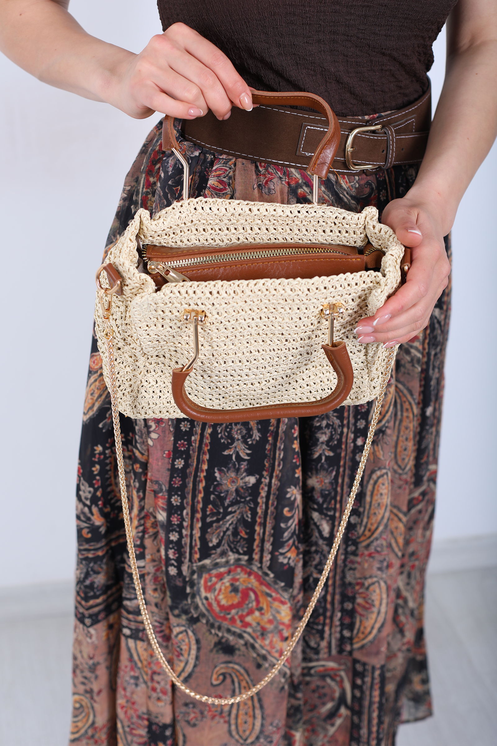 Fermuarlı Örme Kahverengi Hasır Omuz Çantası