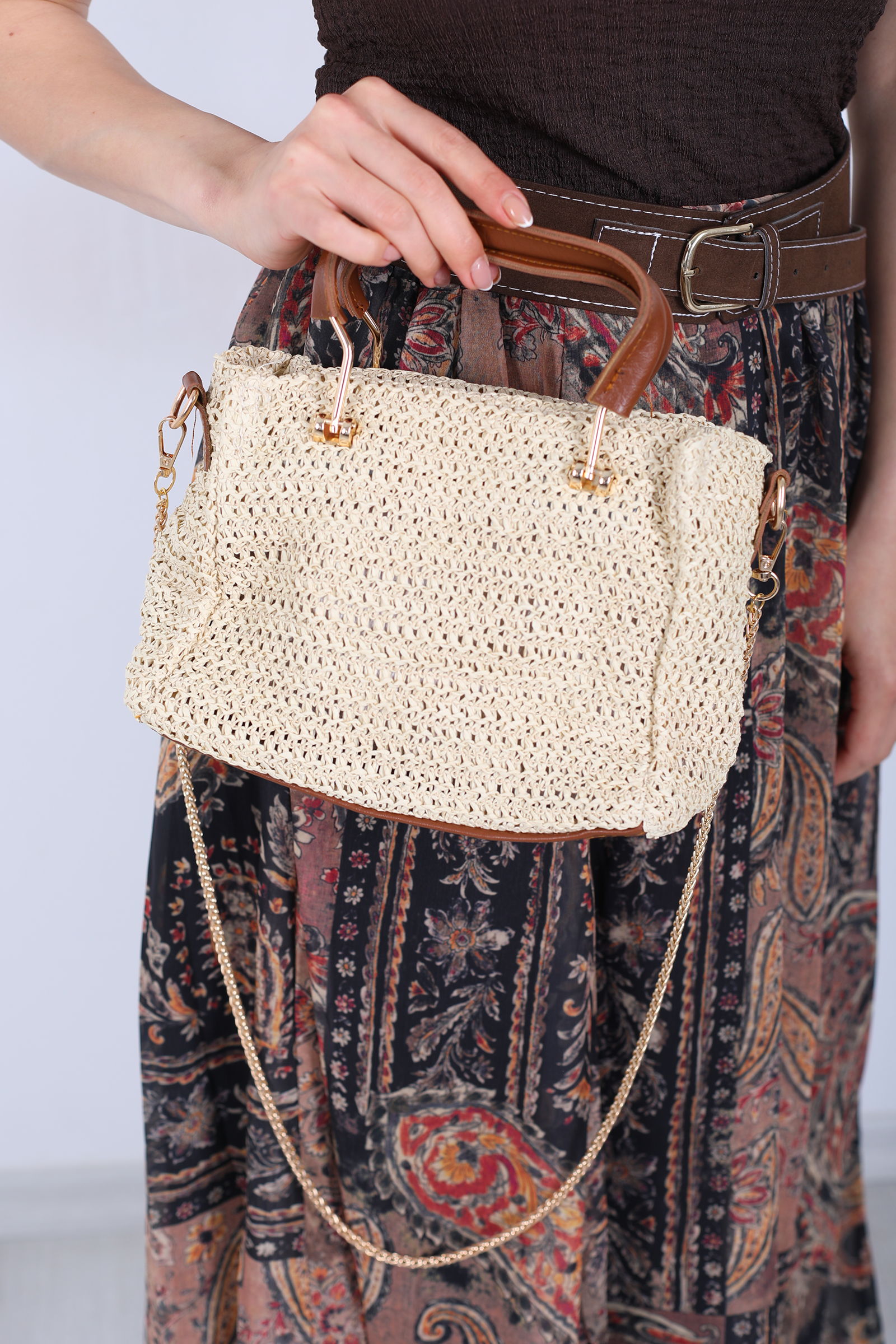 Deri ve Demir Detaylı Zincir Askılı Krem Hasır Çanta