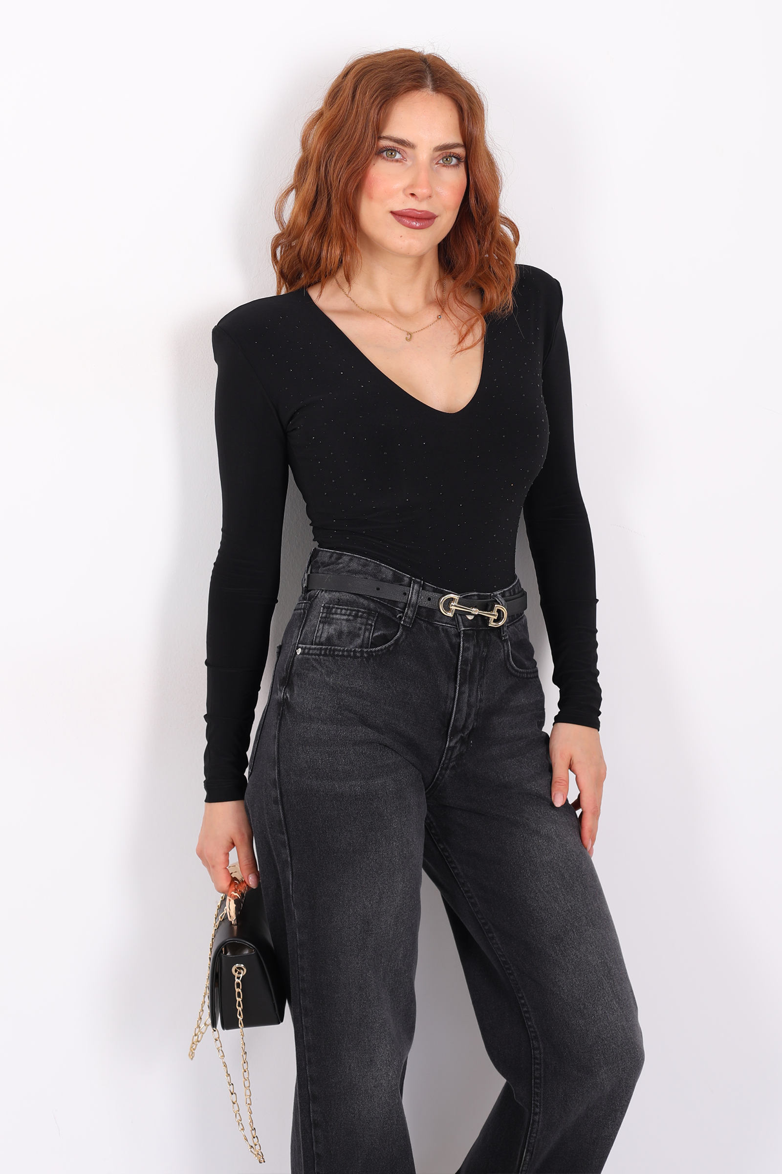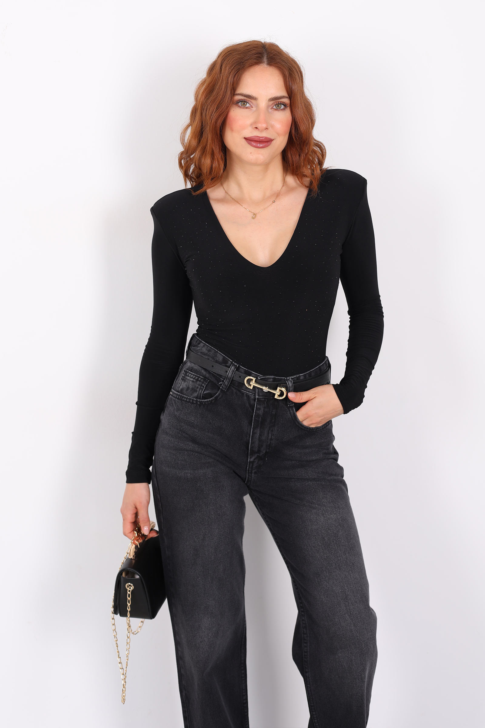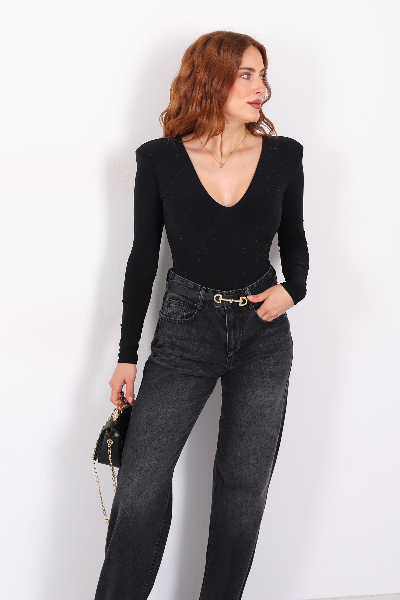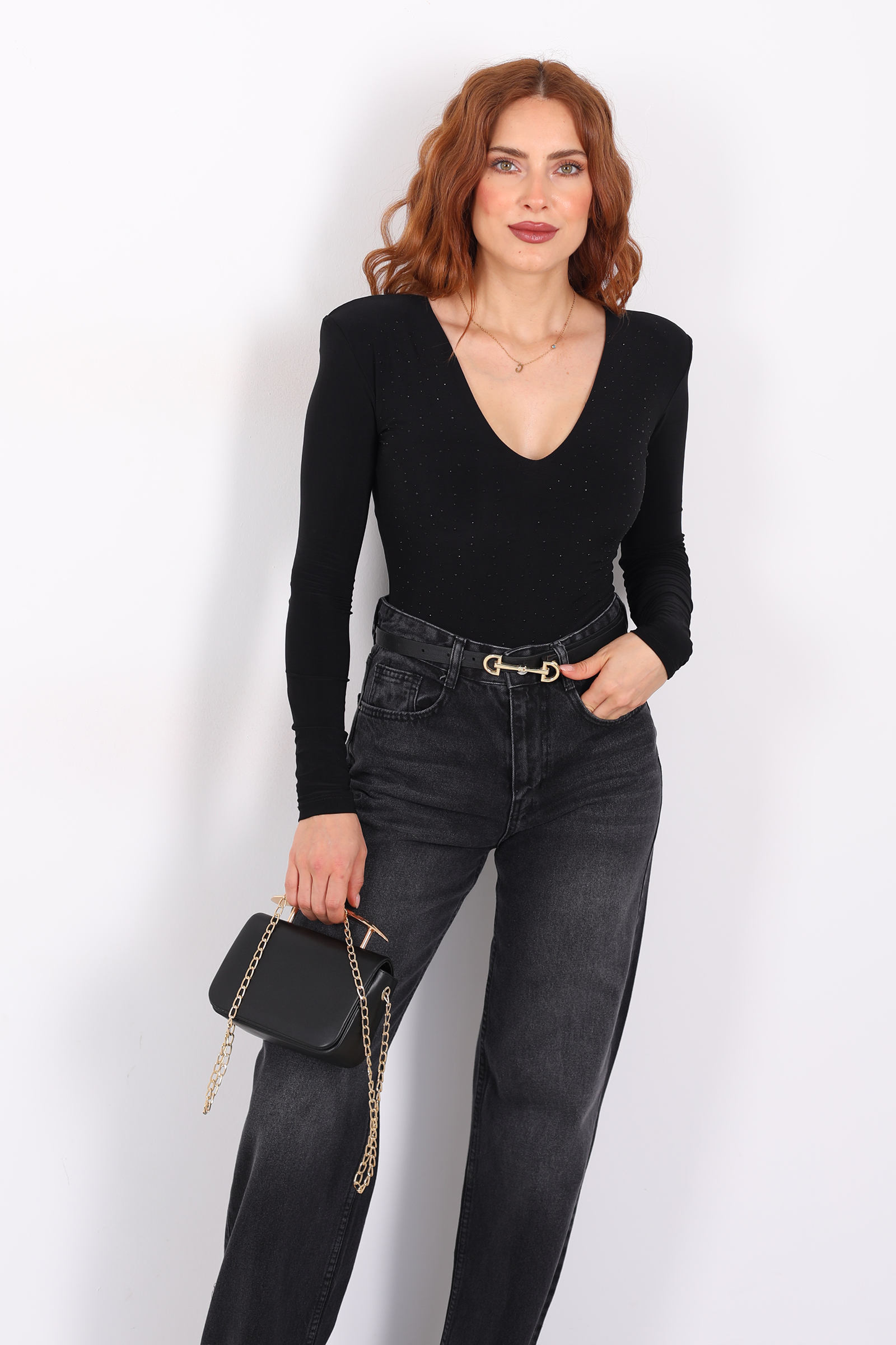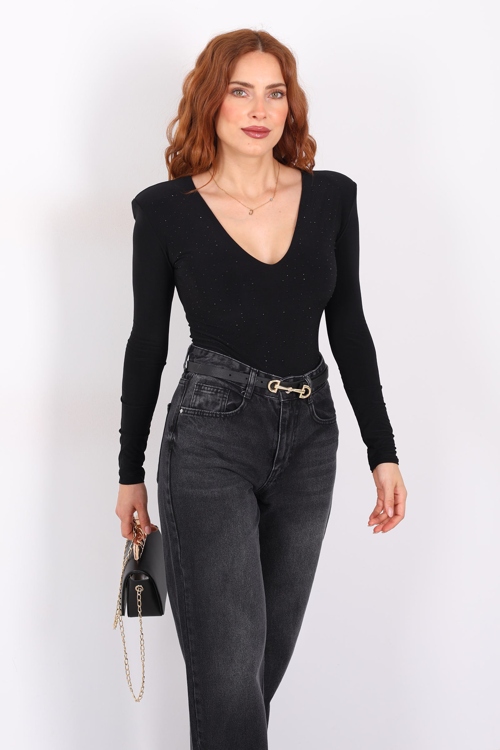 Bu gövdeyi (body) tasarlayan stil, güçlü ve zarif çizgileri cesurca bir araya getiriyor. Derin V yakası, boyun ve göğüs hattını vurgular; bu, hem feminen bir dokunuş hem de cesur bir siluet sunar. Göğsünde taş işlemeleri, küçük ama dikkat çekici bir ışıltı efekti yaratarak parçayı sade bir temelden sofistike bir ifadesini taşıyan bir parçaya dönüştürüyor.