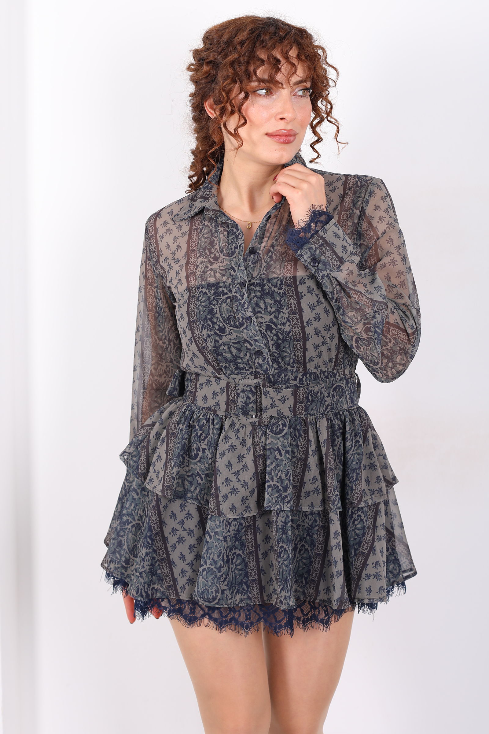Desenli Beli Transparan Kadın Haki Kemerli Mini Şifon Elbise