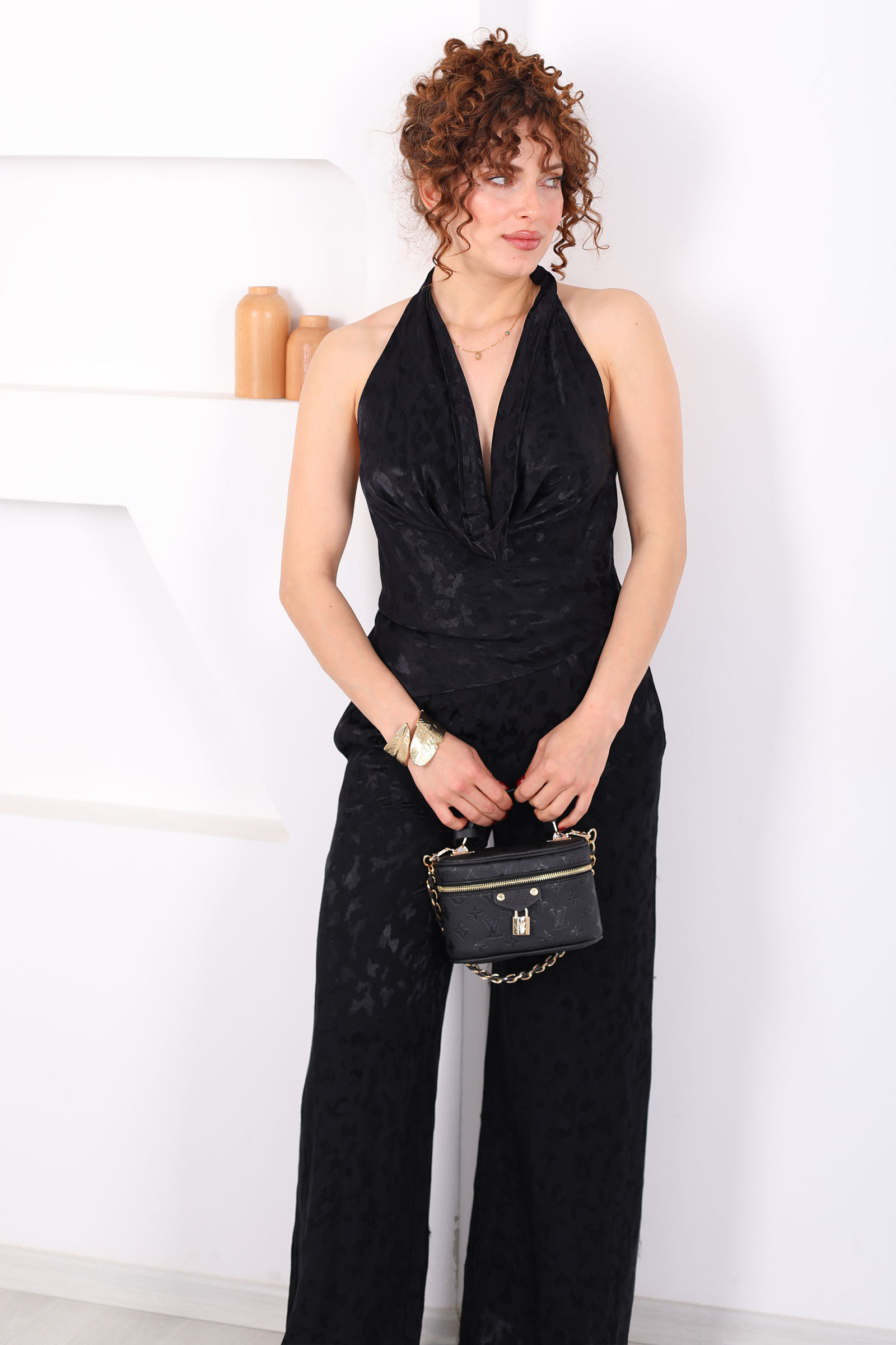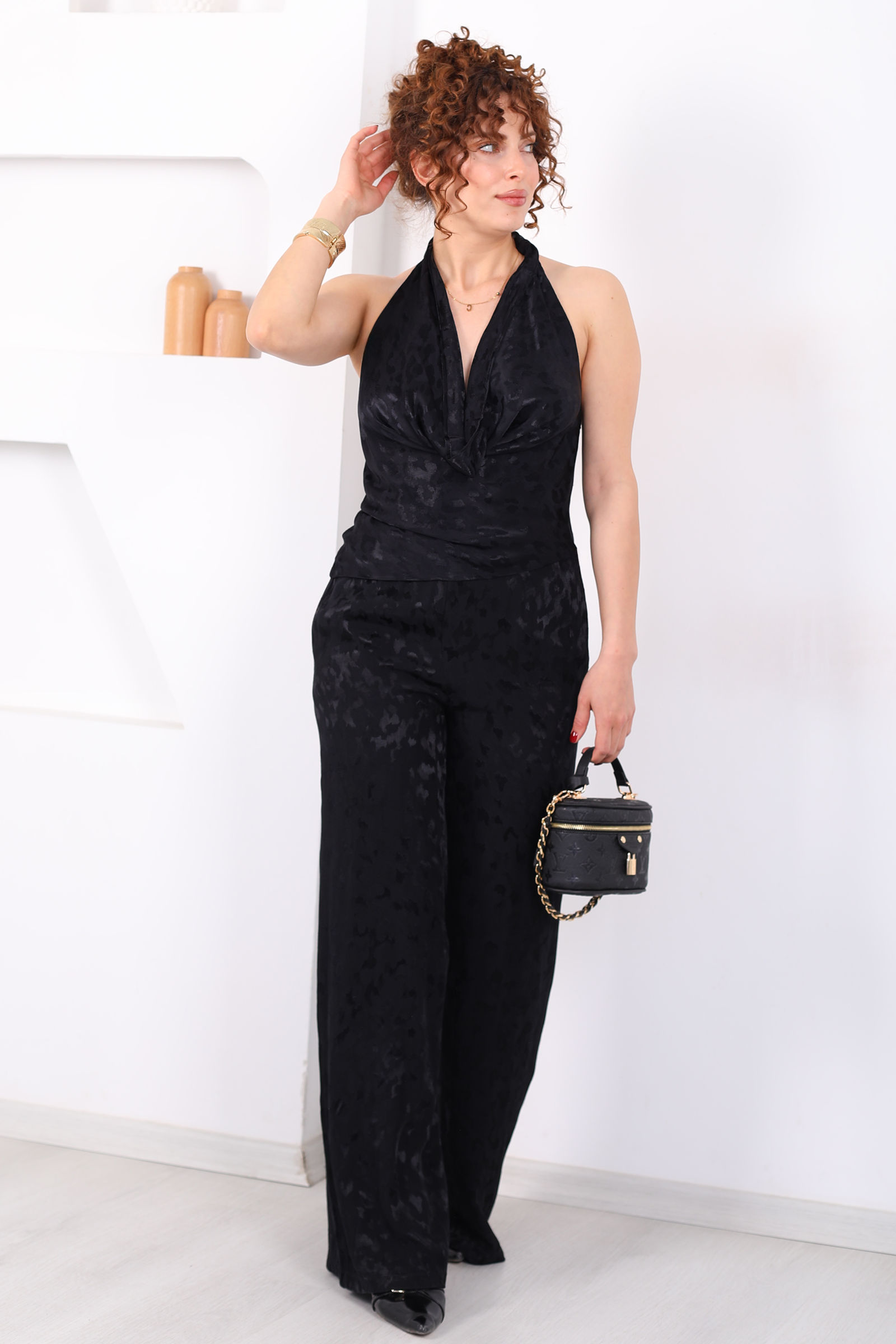 Desenli Boyundan Geçirmeli Kadın Siyah Saten Pantolon Takım