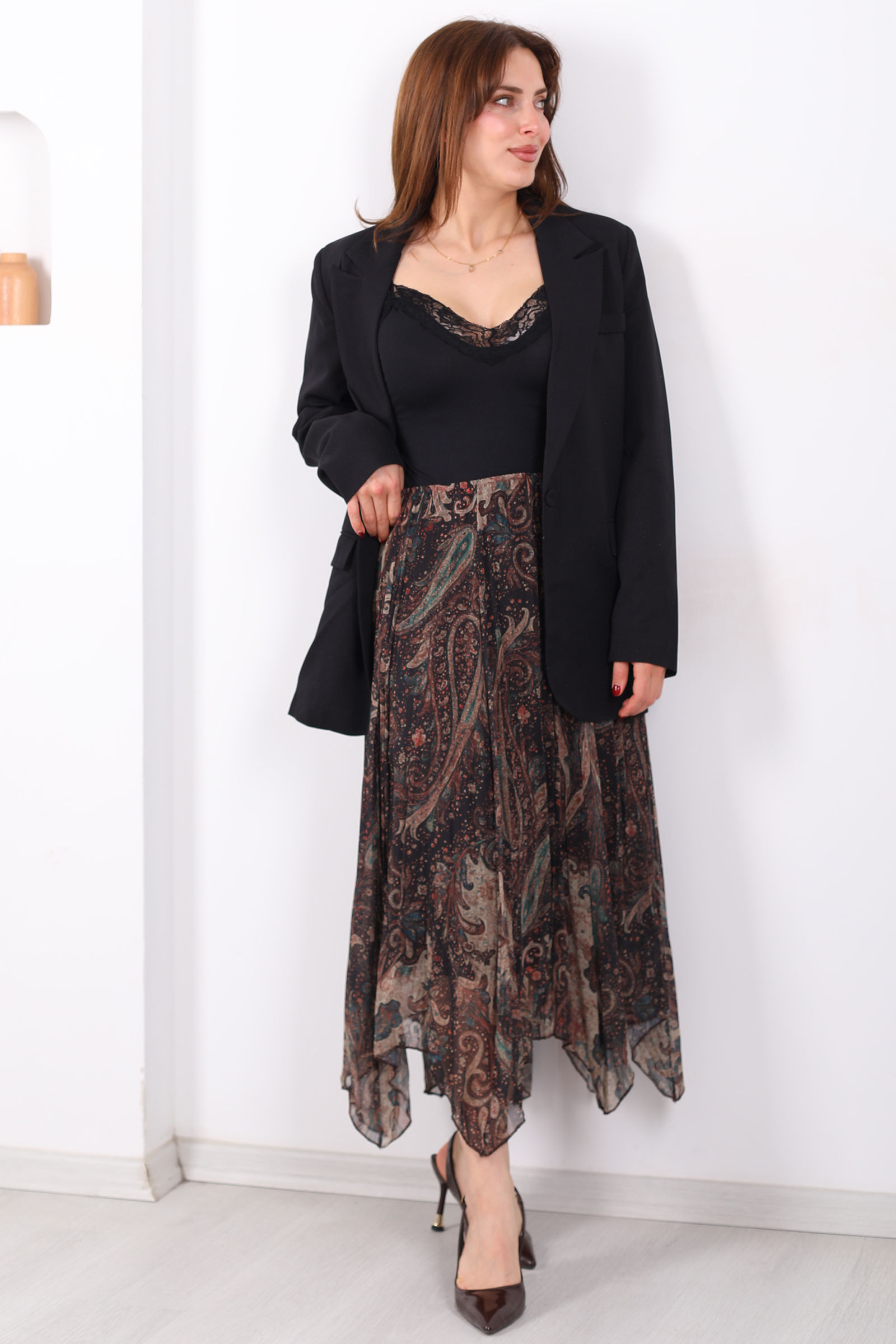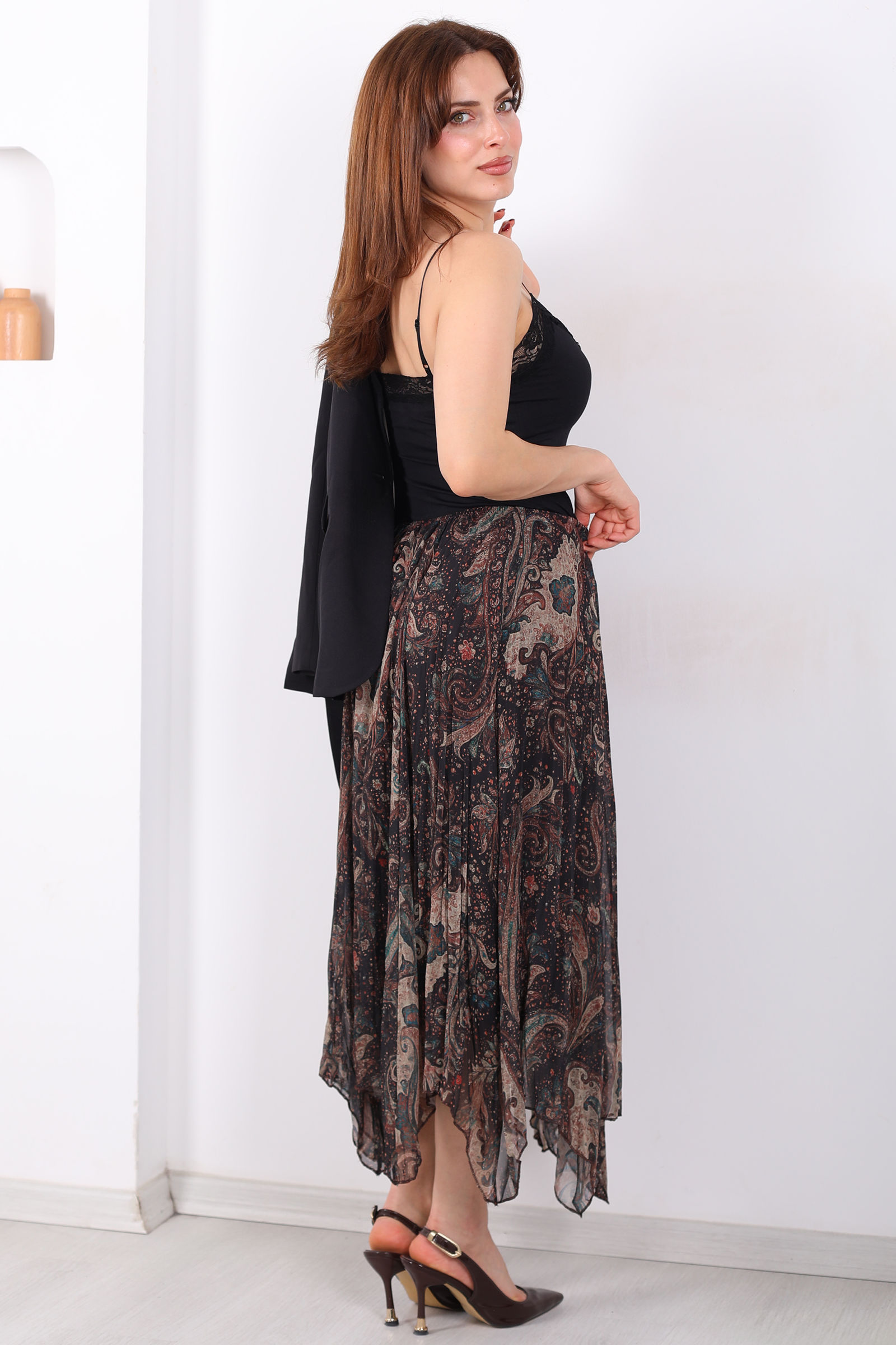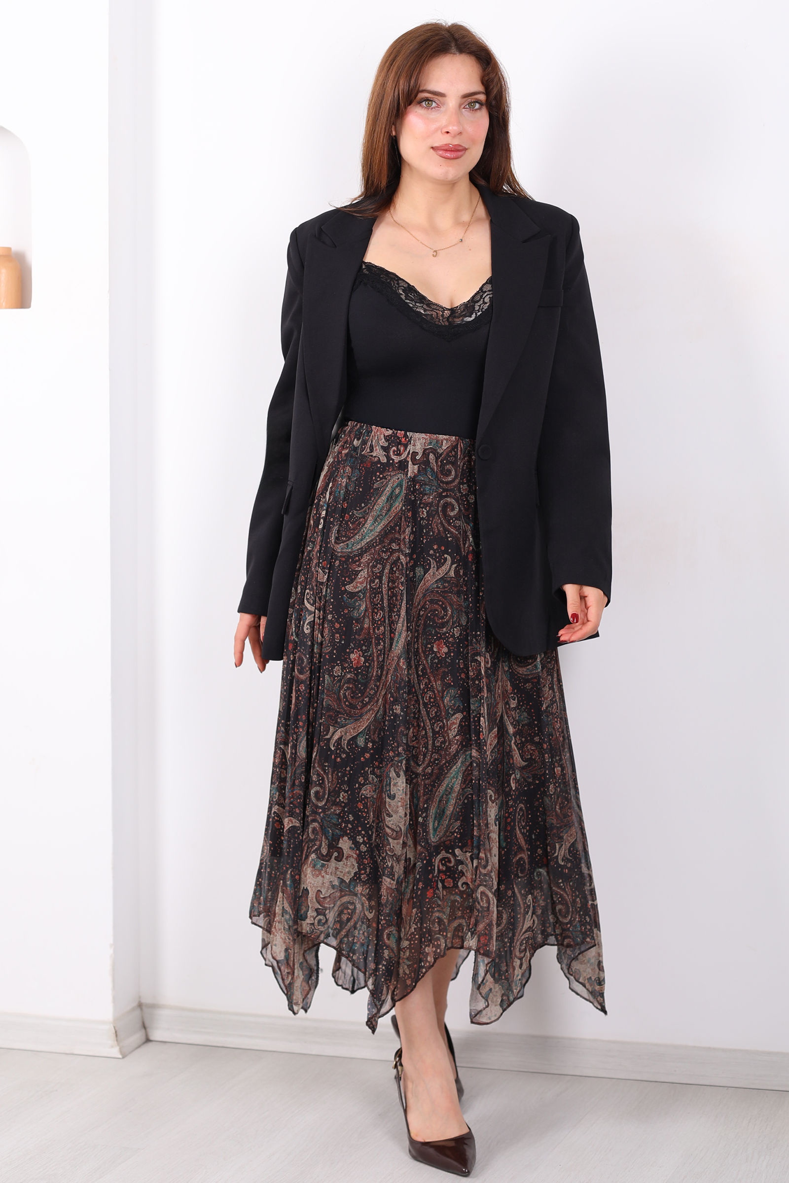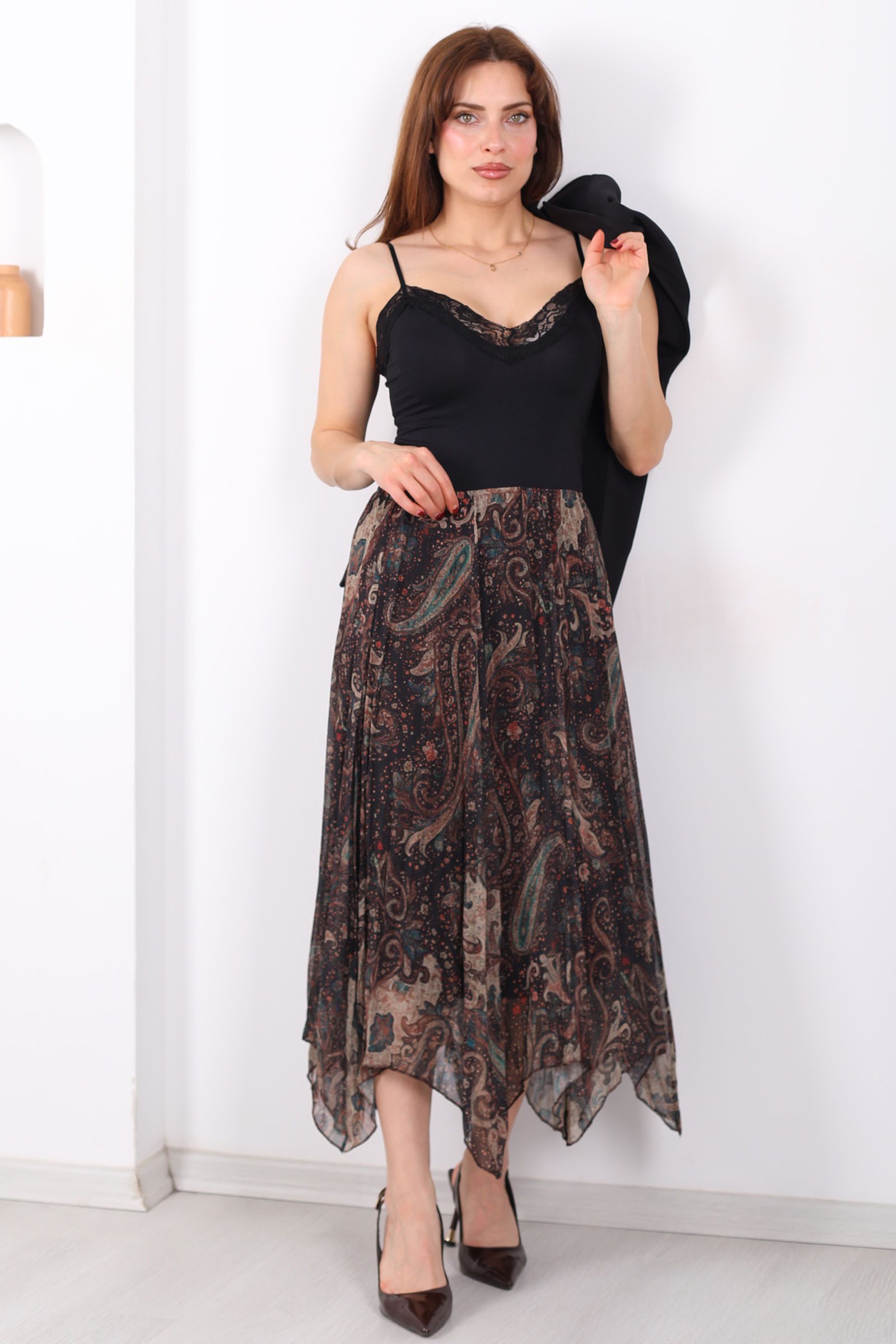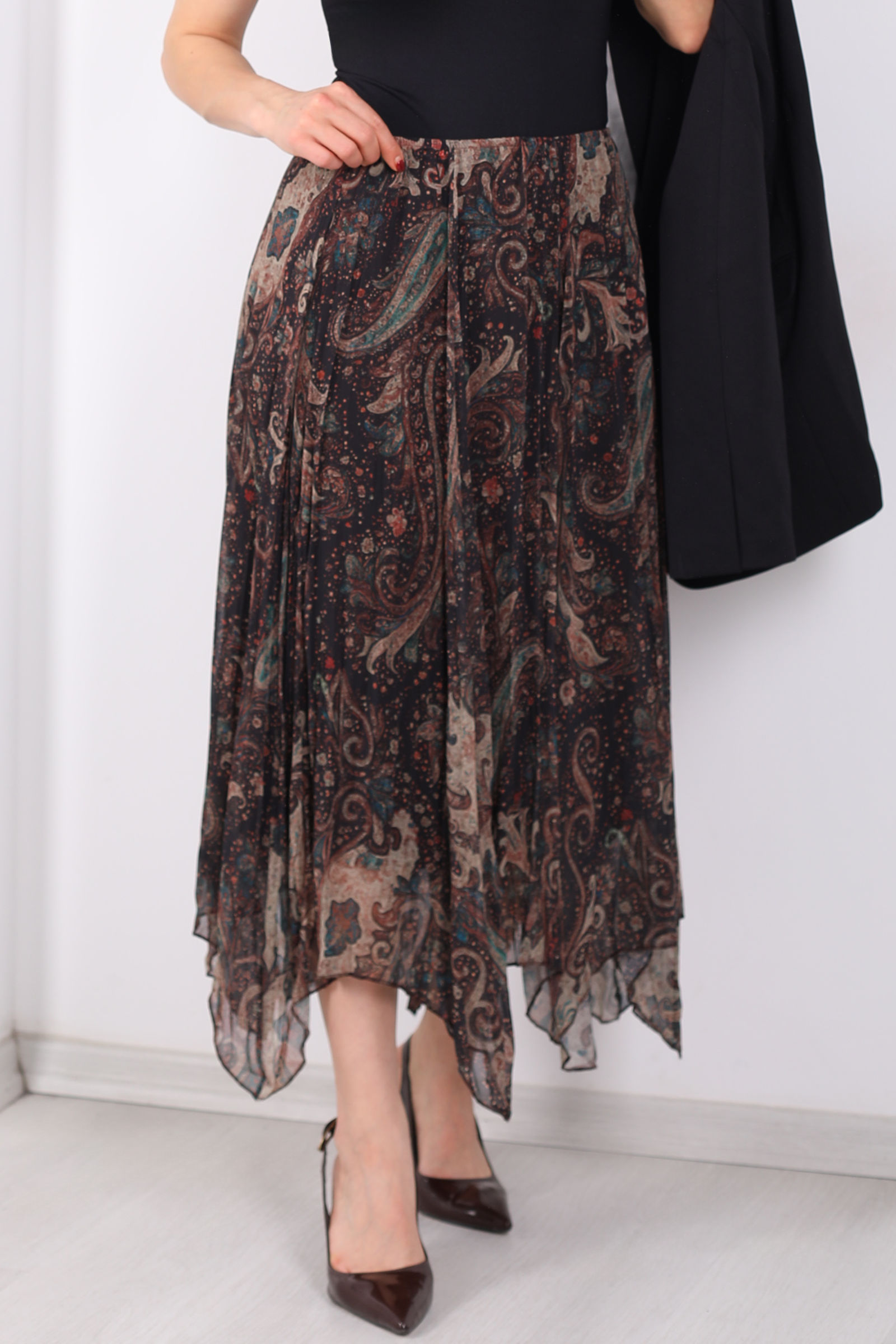 Desenli Pileli Kadın Midi Füme Şifon Etek