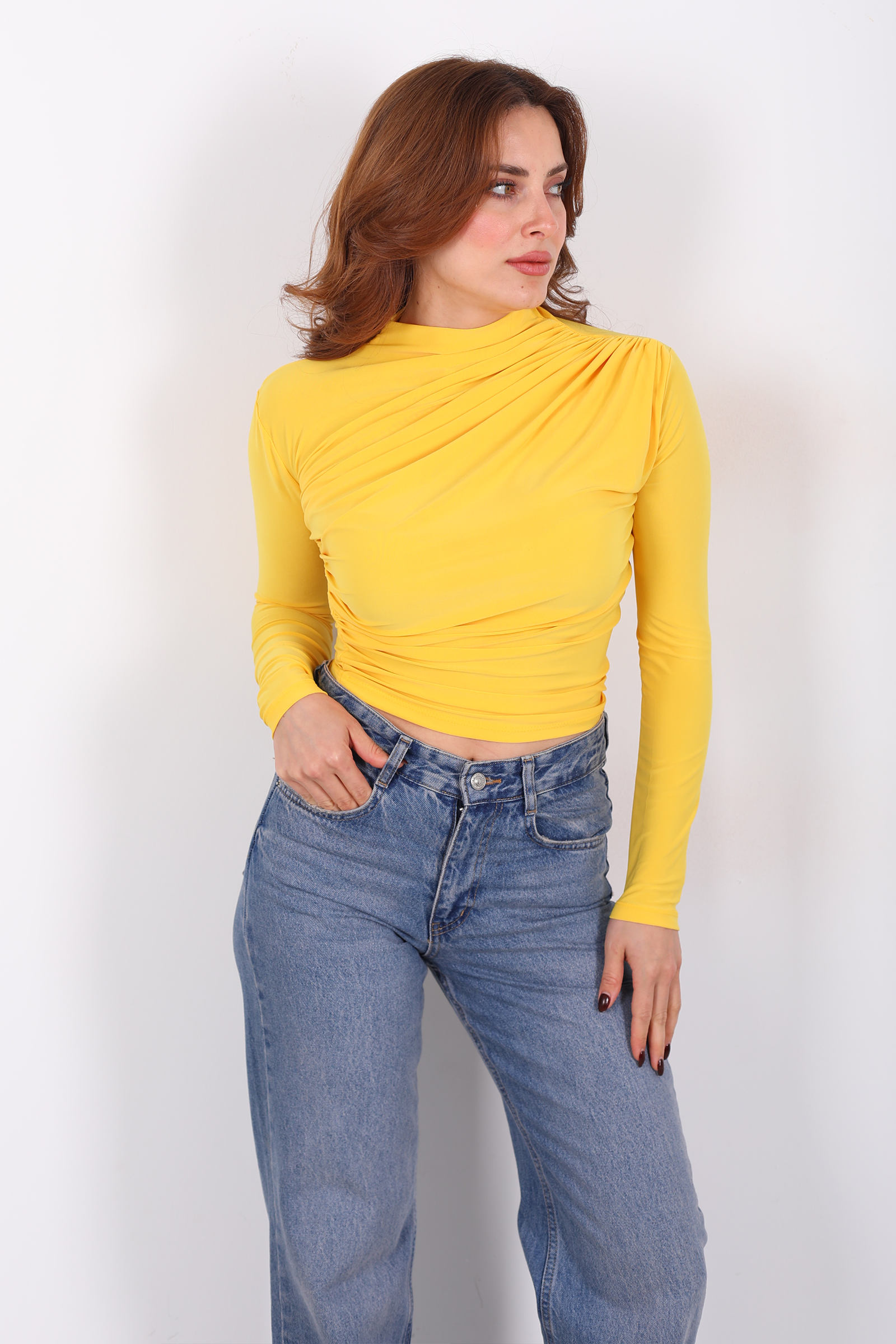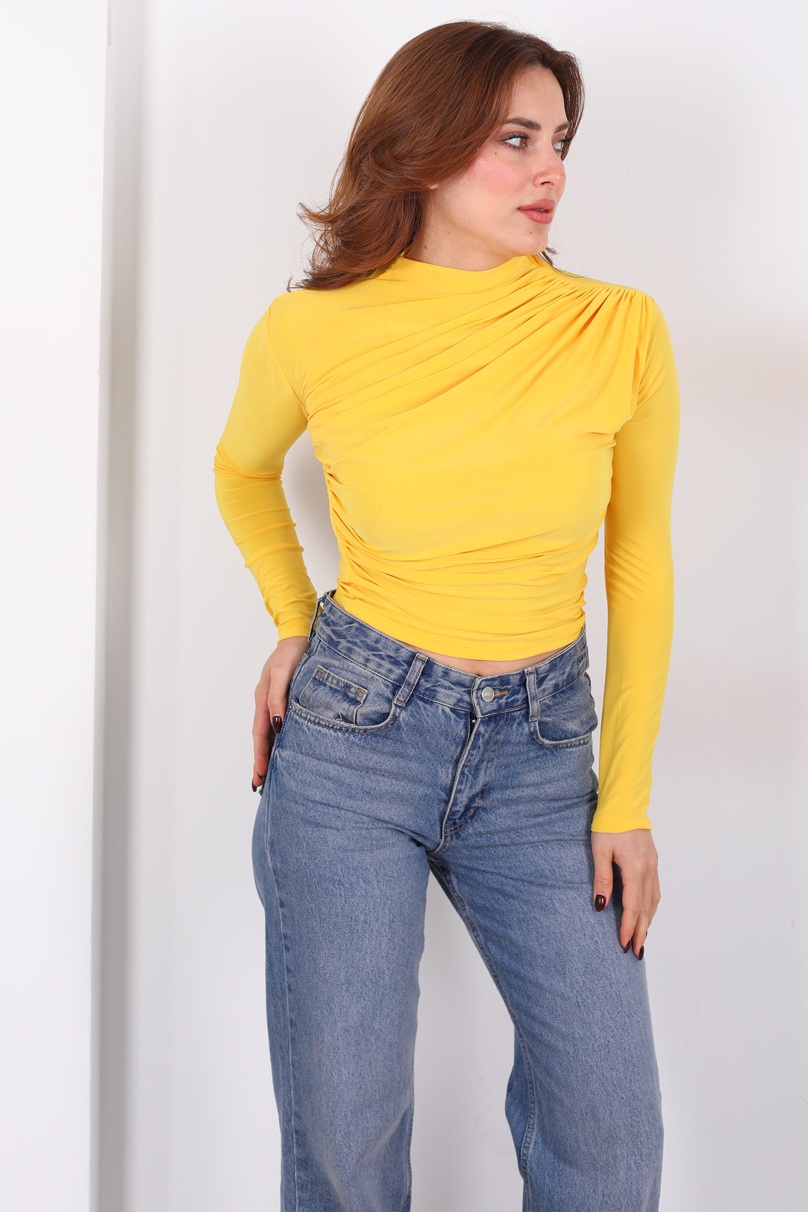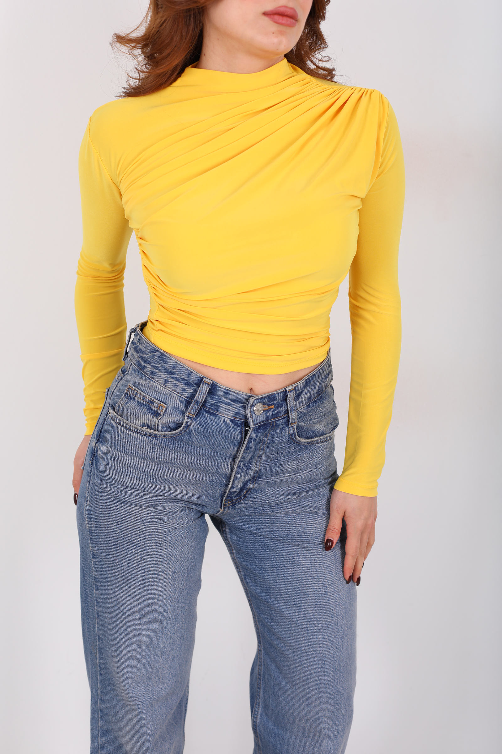 Güneşin ilk ışıklarını andıran sarı tonuyla sahneye çıkan bu sandy bluz, sadece bir üst parça olmaktan öte, stiline pozitif enerji ve hareket katar. Dik yaka tasarımı, boyun hattını belirginleştirirken bluzun duruşunu güçlendirir; bu da sıradan bir kombini bile anında etkileyici bir hale dönüştürür. Kumaş üzerindeki büzgü detayları, yüzeye ritmik bir hareket kazandırır adeta kumaşın kendi melodisiyle dans etmesini sağlar.