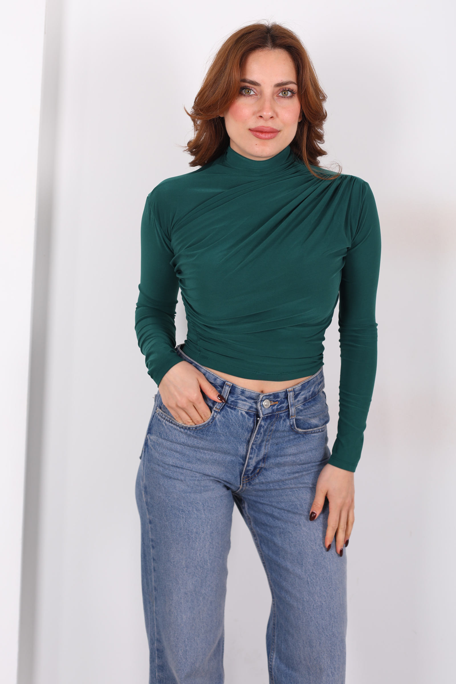 Bu bluz sadece renk ve doku ile öne çıkmaz; zümrüt yeşili, gardırobunu klasik siyah ve nötrlerden ayırır ve her kombine ferahlık, karakter ve canlılık katar. Günlük jean’ler veya kumaş pantolonlar ile minimal bir şehir stili oluşturabilir, smart casual görünümler için etek veya şık aksesuarlarla tamamlayabilirsin. Sandy kumaşın yumuşak dokusu, gün boyu konfor sağlar, ritmik büzgüler ise bluzu sıradan üstlerden ayıran stil ayrıntısı olur.