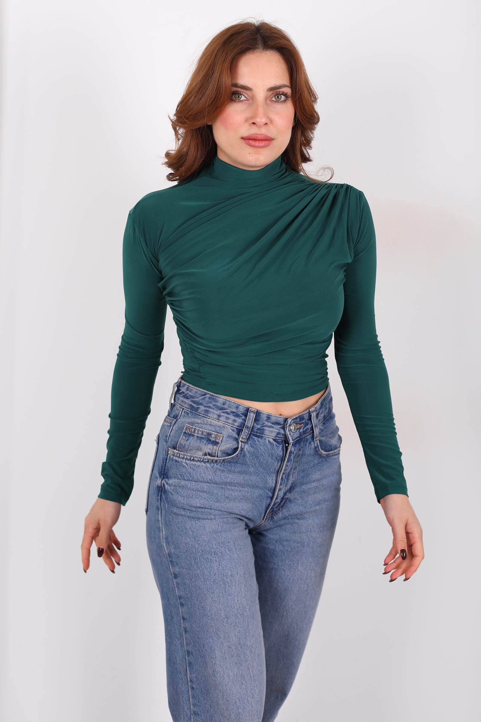 Zümrüt yeşilinin derin, canlı ve nutku tutulmuş bir doğa hissi veren tonu, bu sandy bluzu stilinizin merkezine taşır. Dik yaka, üst bedeni zarif bir çerçeveye alırken bluzun yüzeyindeki büzgüler, kumaşa dikkat çekici bir ritim ve akışkanlık kazandırır. Her hareketinizde, bu büzgü detayları küçük bir stil melodisine dönüşür sade bir görünümü bile anında dinamik bir ifadeye dönüştürür.