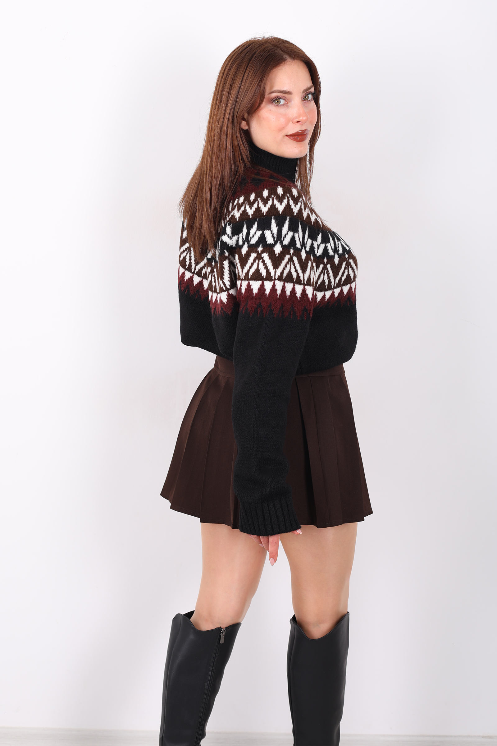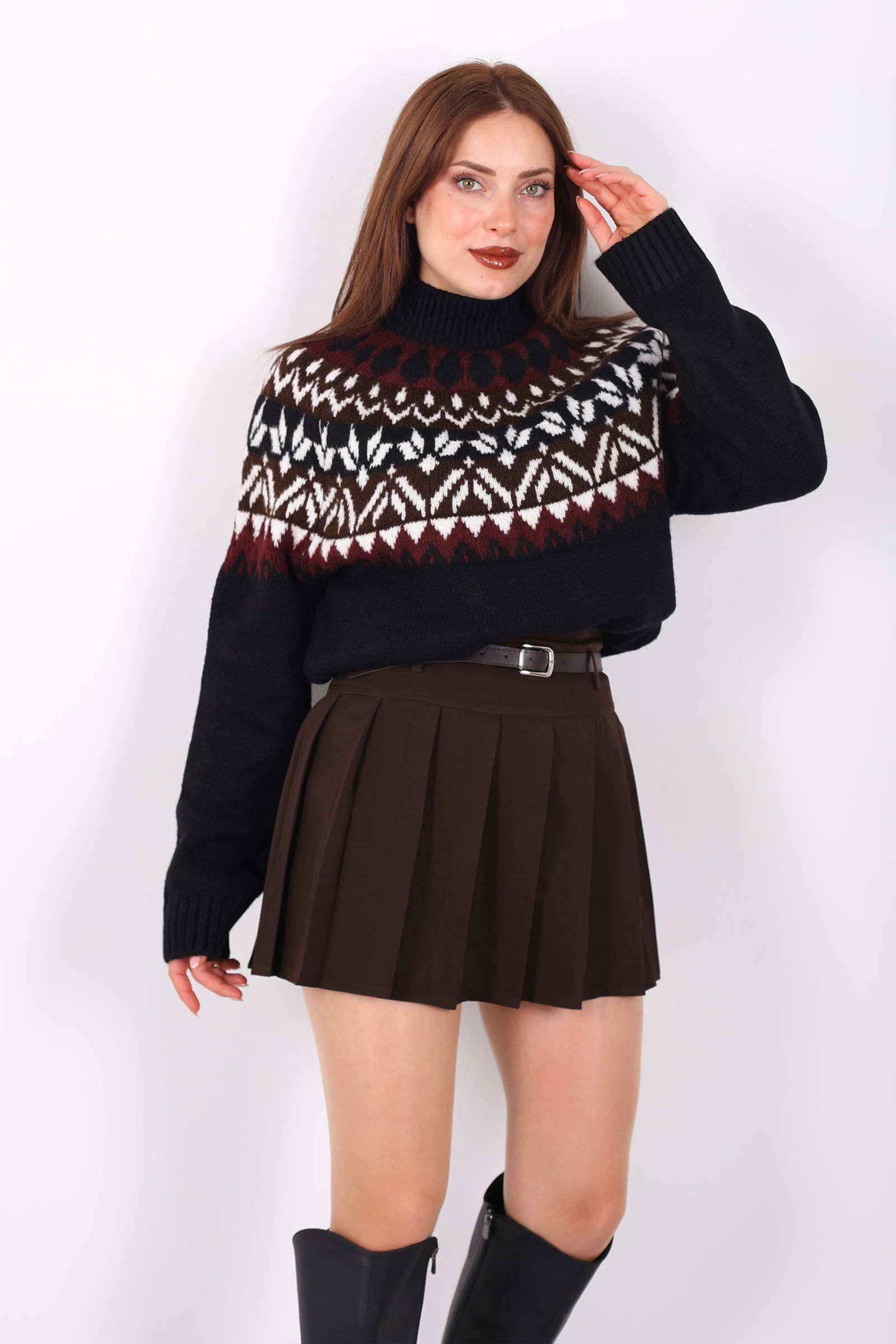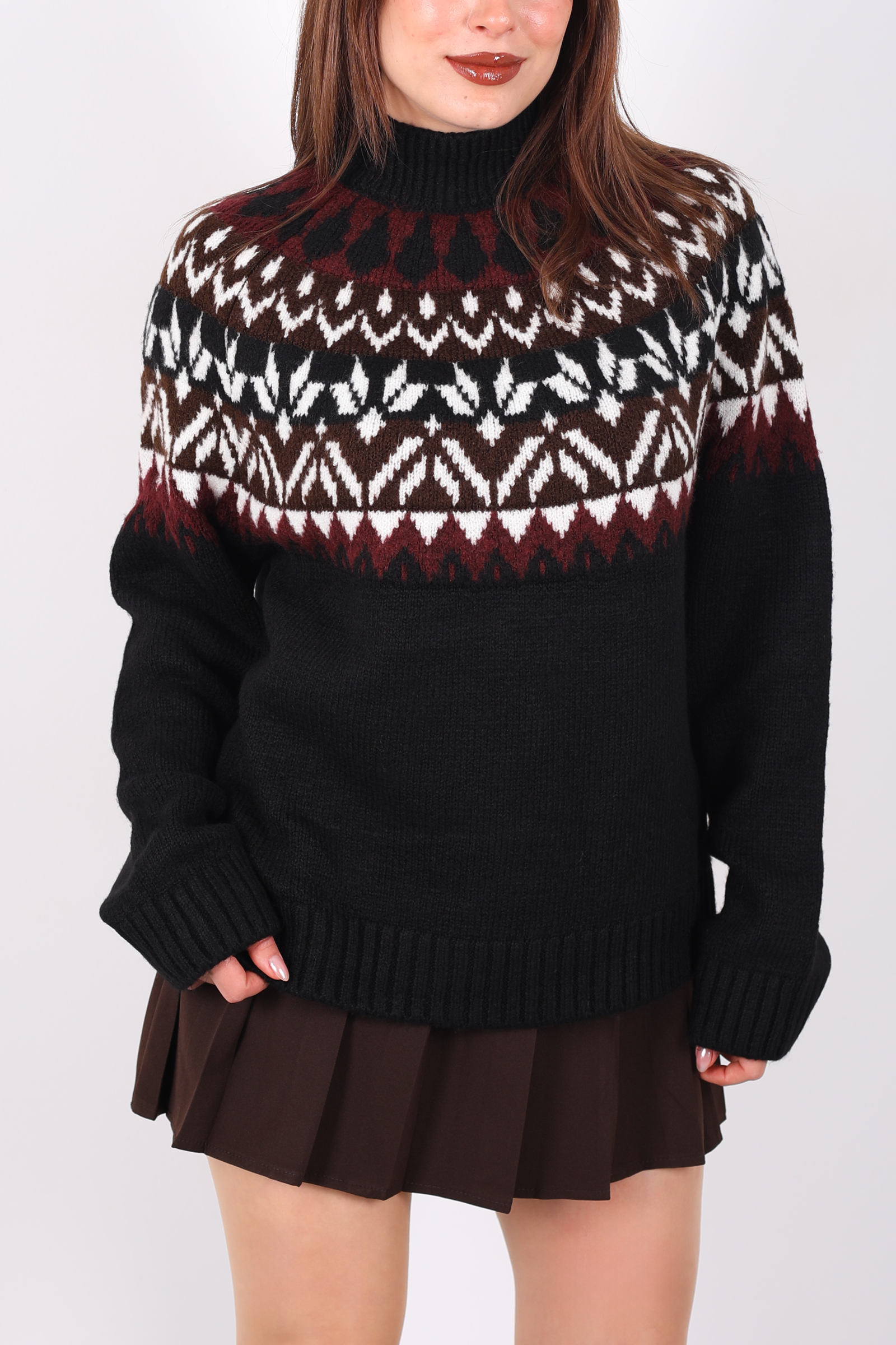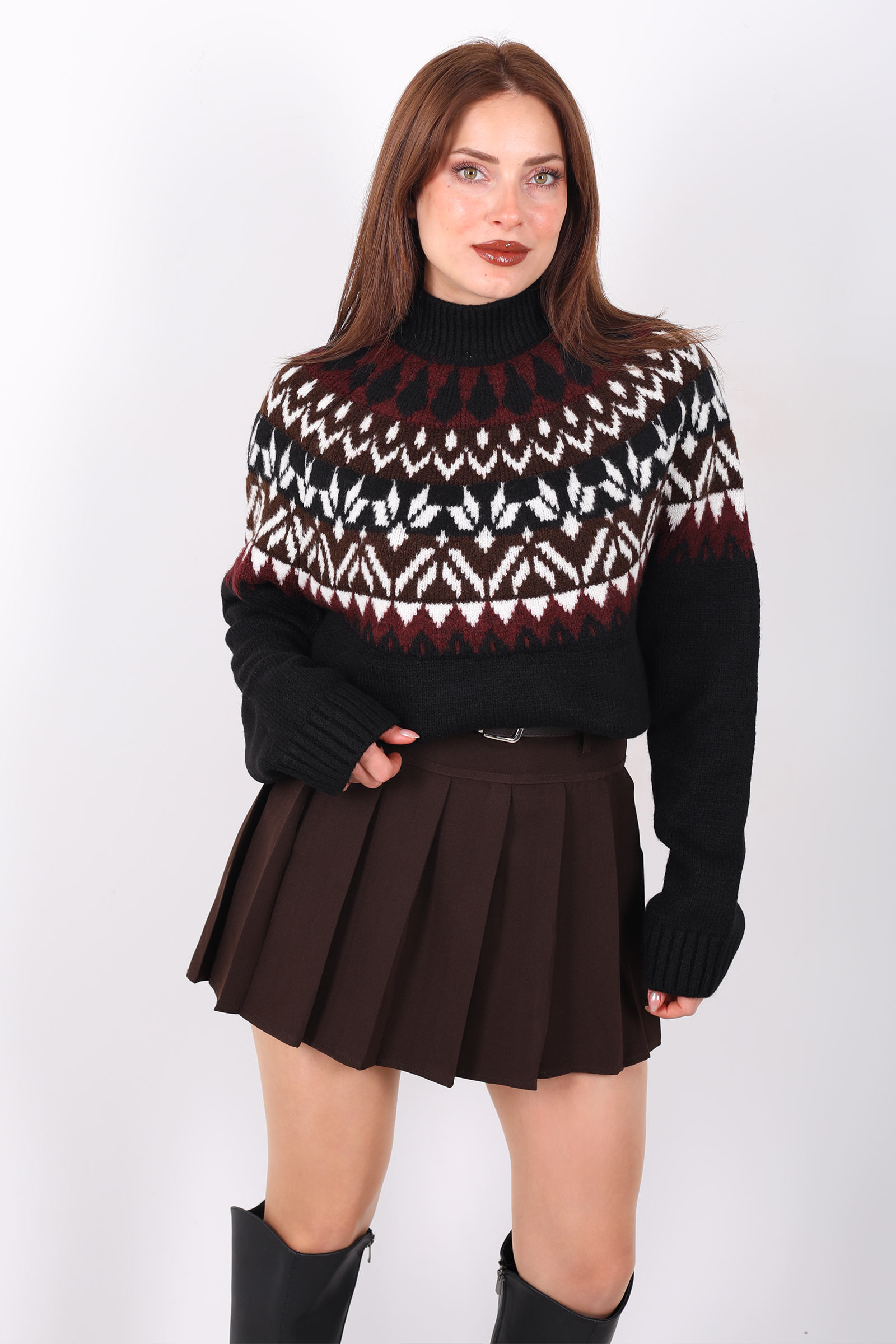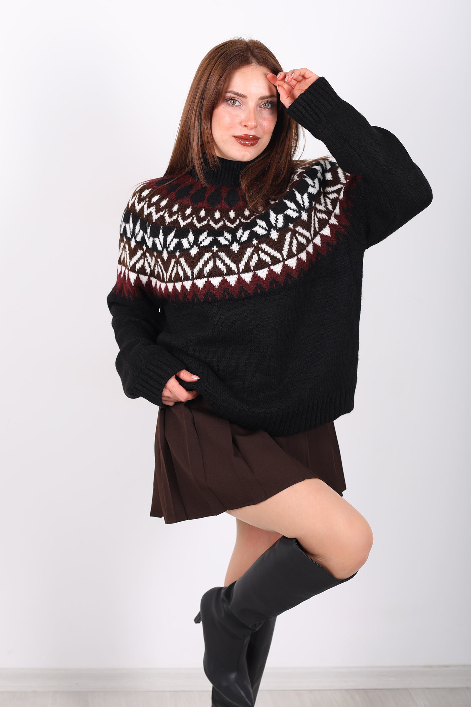 Siyahın zarifliği ve etnik desenlerin enerjisiyle tasarlanmış bu triko kazak, şıklığınızı ve rahatlığınızı bir arada sunuyor. Dik yaka tasarımı, soğuk havalarda sizi sıcak tutarken, etnik desenler kazaka özgün bir hava katar. Yumuşak kumaşı ve rahat kesimiyle hem günlük hem de özel günlerde rahatça kombinlenebilir. Siyah rengi, her türlü alt ve aksesuarla uyum sağlayarak stilinizi tamamlar. Hem şık hem de rahat olmak isteyenler için ideal bir seçim.