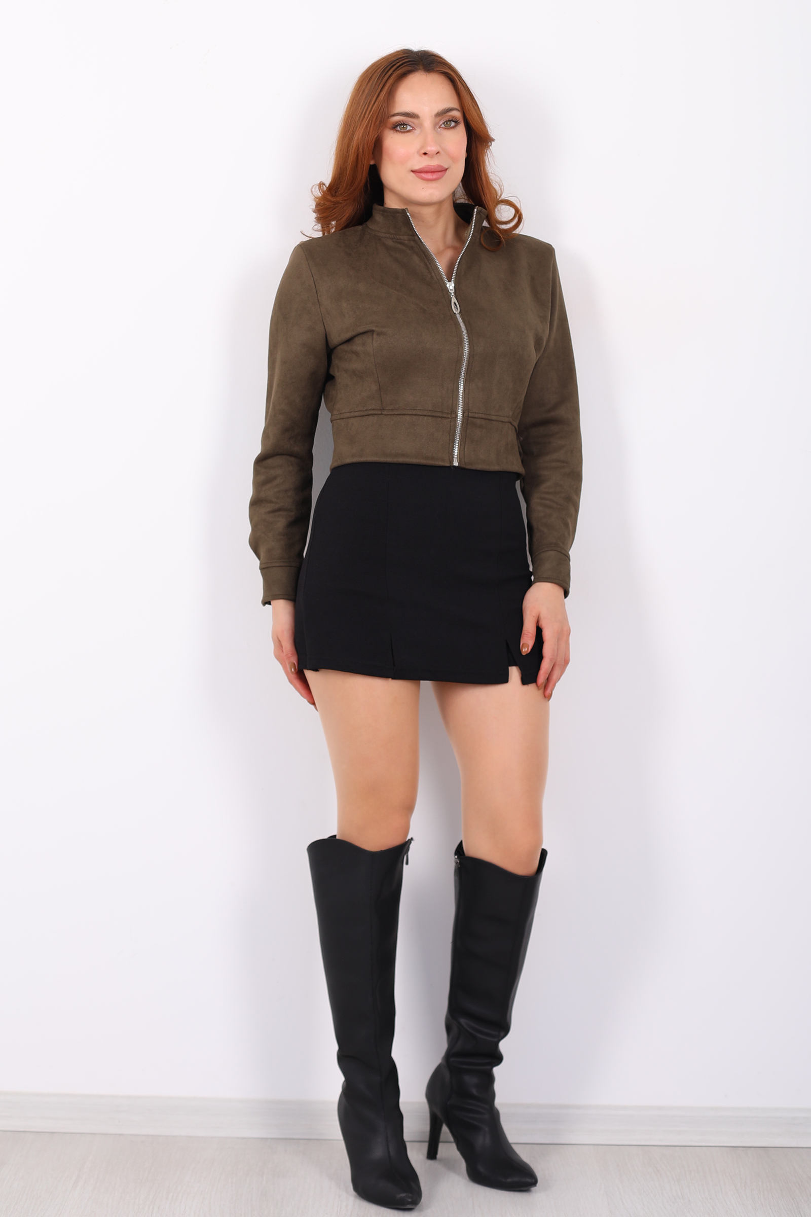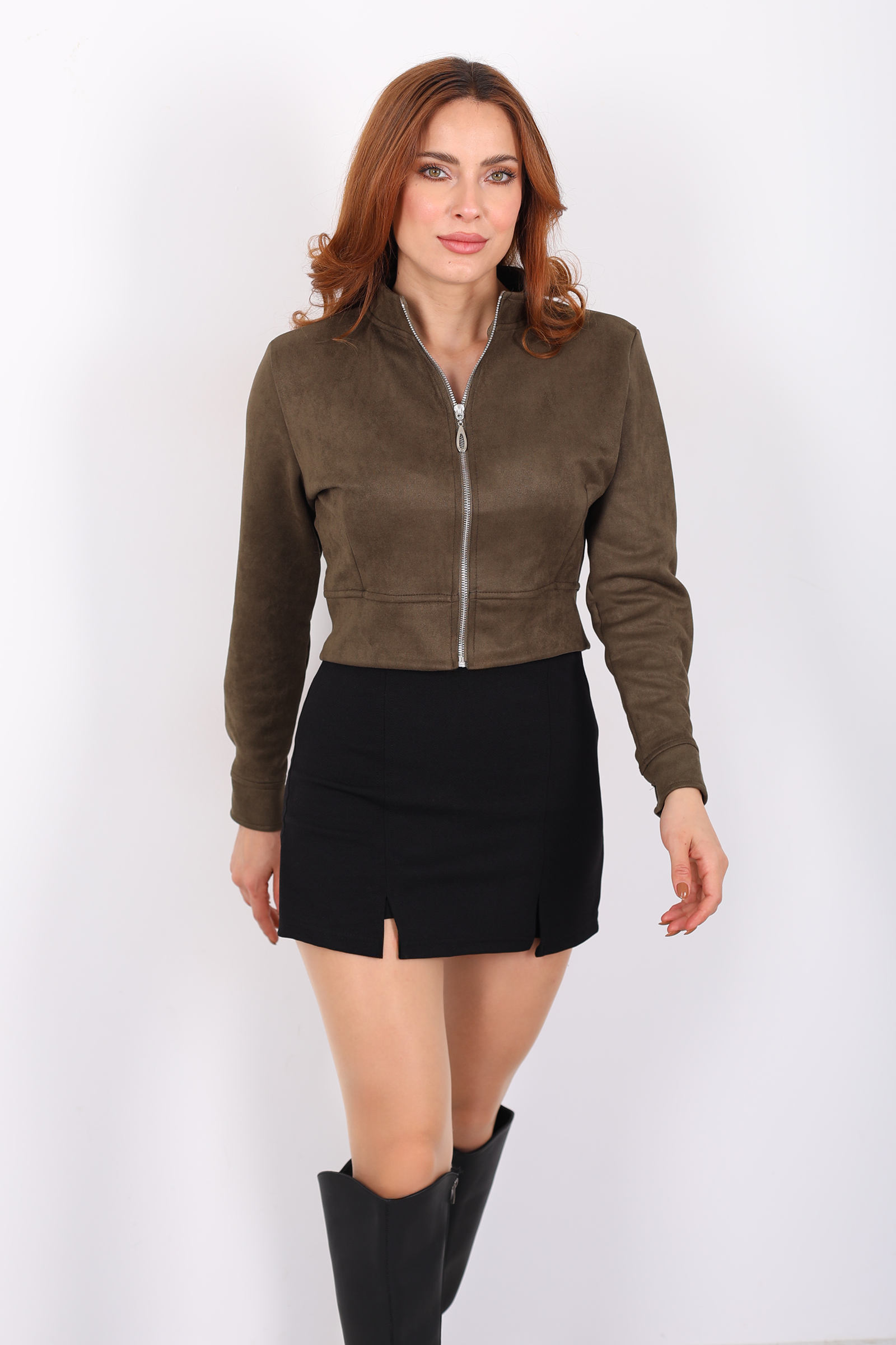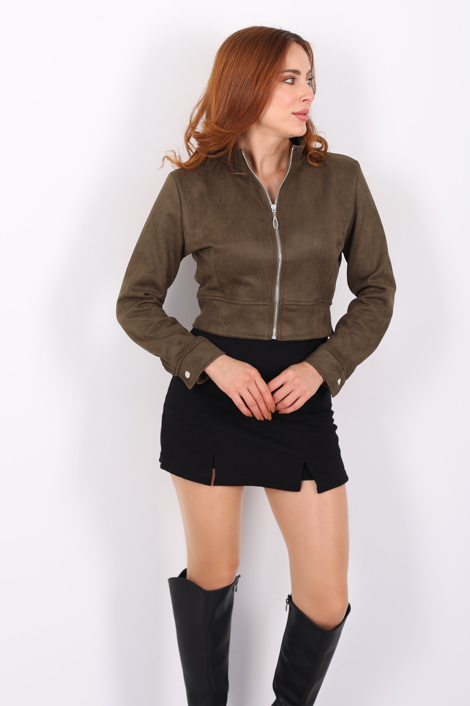 Dik Yaka Haki Kadın Süet Ceket