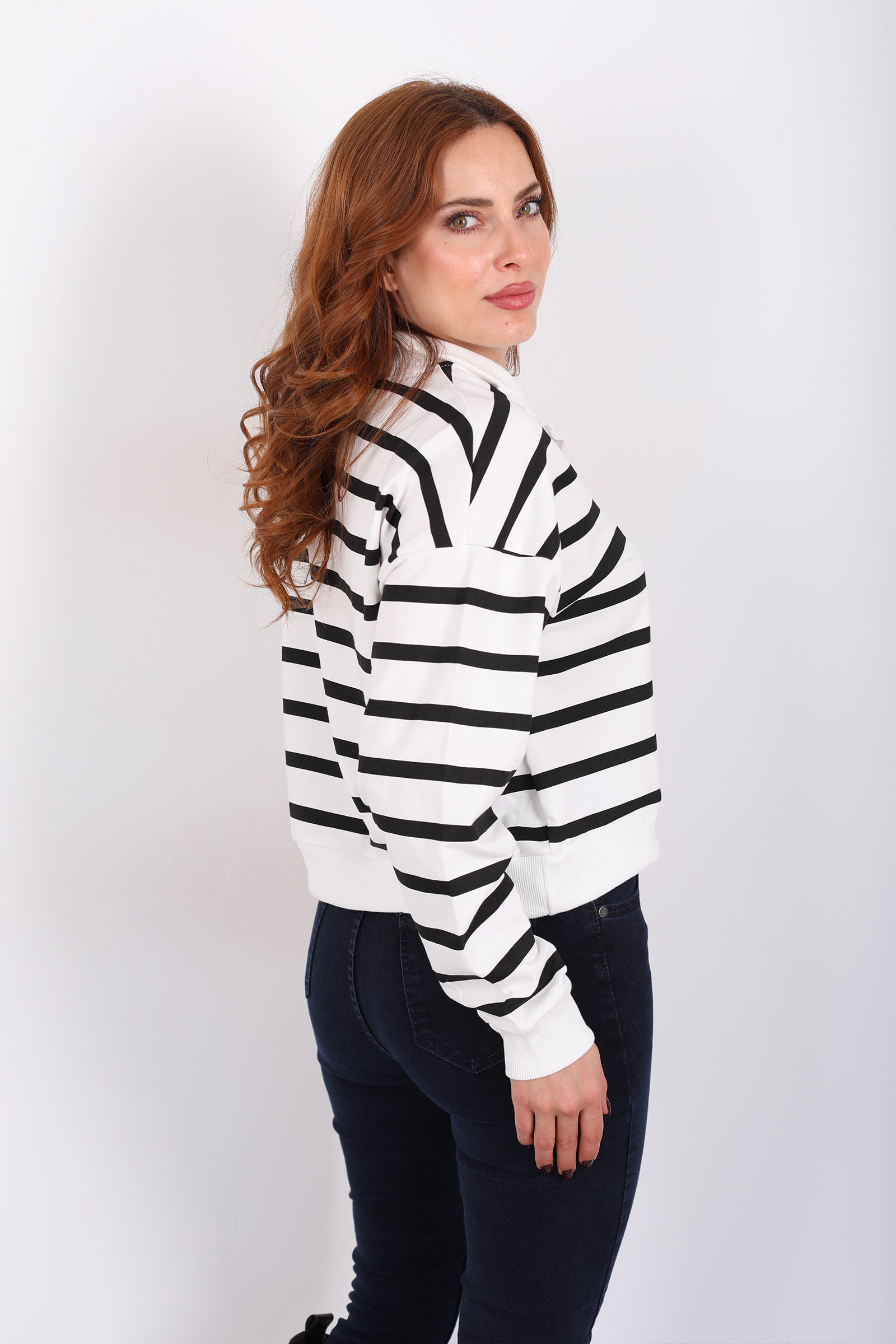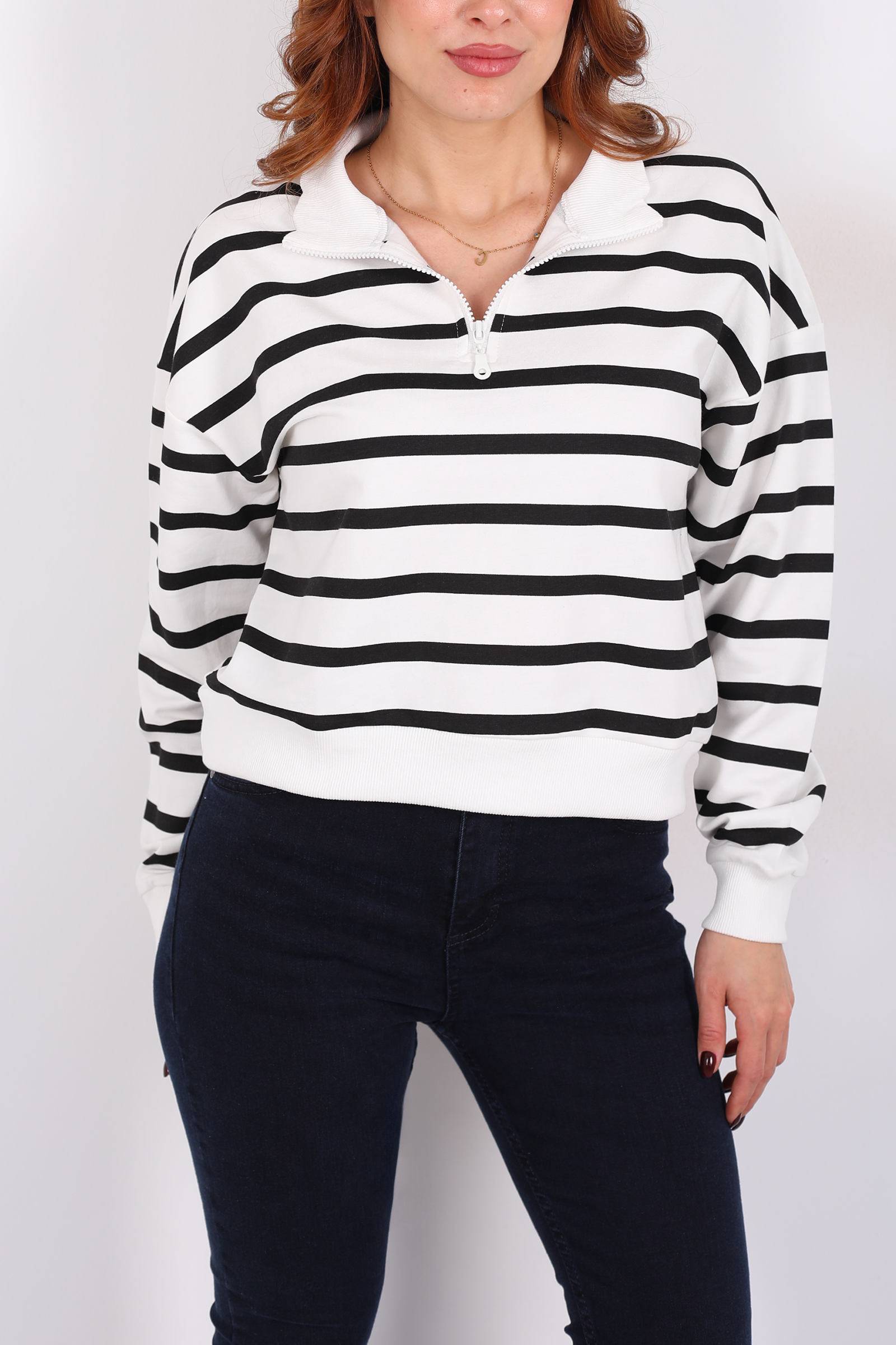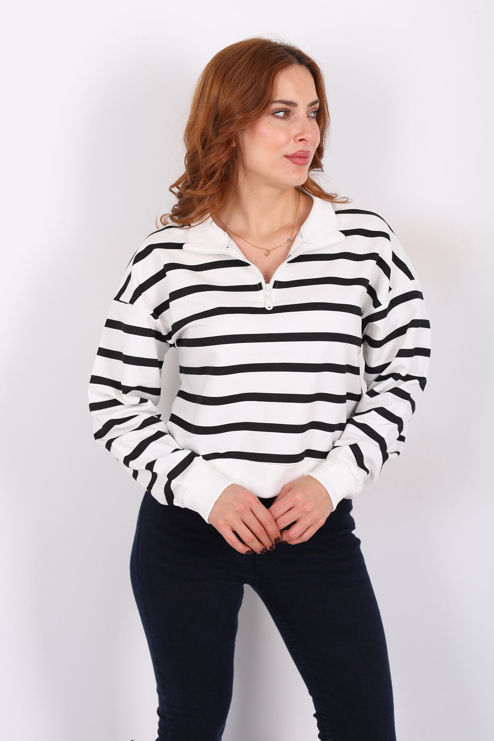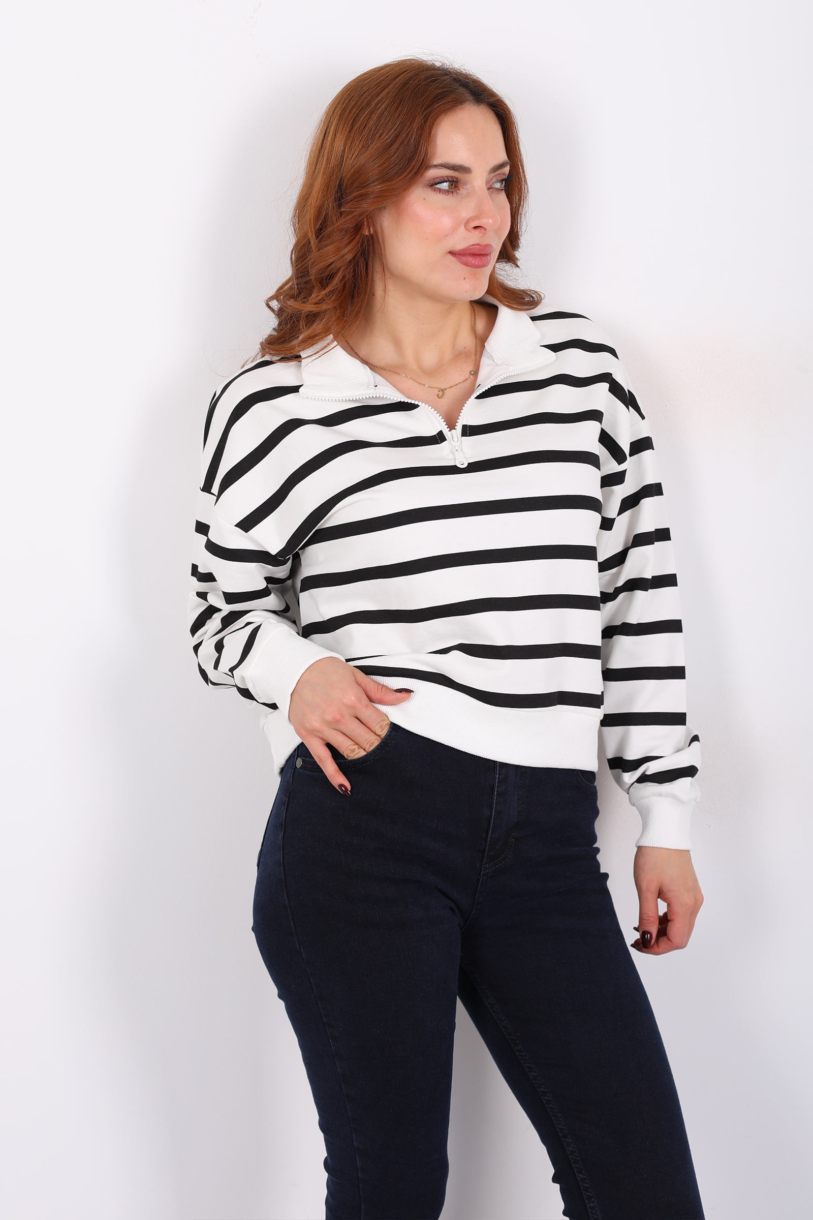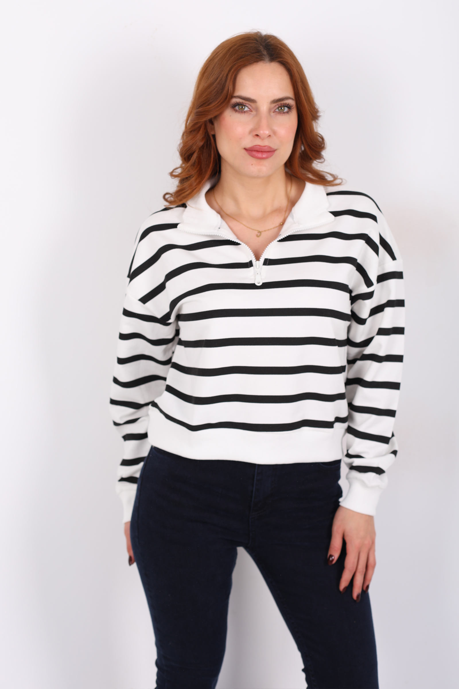 Dik Yaka İnce Çizgili Fermuarlı Siyah Kadın Sweat