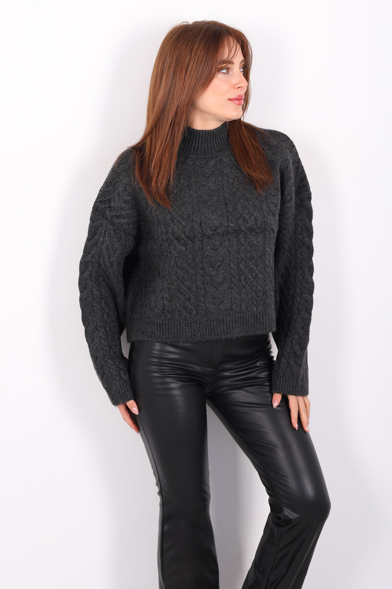 Bu antrasit triko kazak, dik yaka tasarımı ve belirgin saç örgüsü deseni ile sade ama etkileyici bir stil yaratır. Koyu gri ton, gardırobunuzdaki birçok parçayla kolayca uyum sağlar ve mevsim geçişlerinde tercih edilecek çok yönlü bir seçenek sunar. Yumuşak triko kumaş, konforlu bir his verirken örgü detayı kazağa karakter katar. Rahat kesimi sayesinde jean, kumaş pantolon veya midi eteklerle özgün kombinler oluşturabilirsiniz. Günlük kullanımda rahat bir şıklık sağlarken, aksesuarlarla zenginleştirdiğinizde daha özenli görünüm elde etmenizi sağlar.