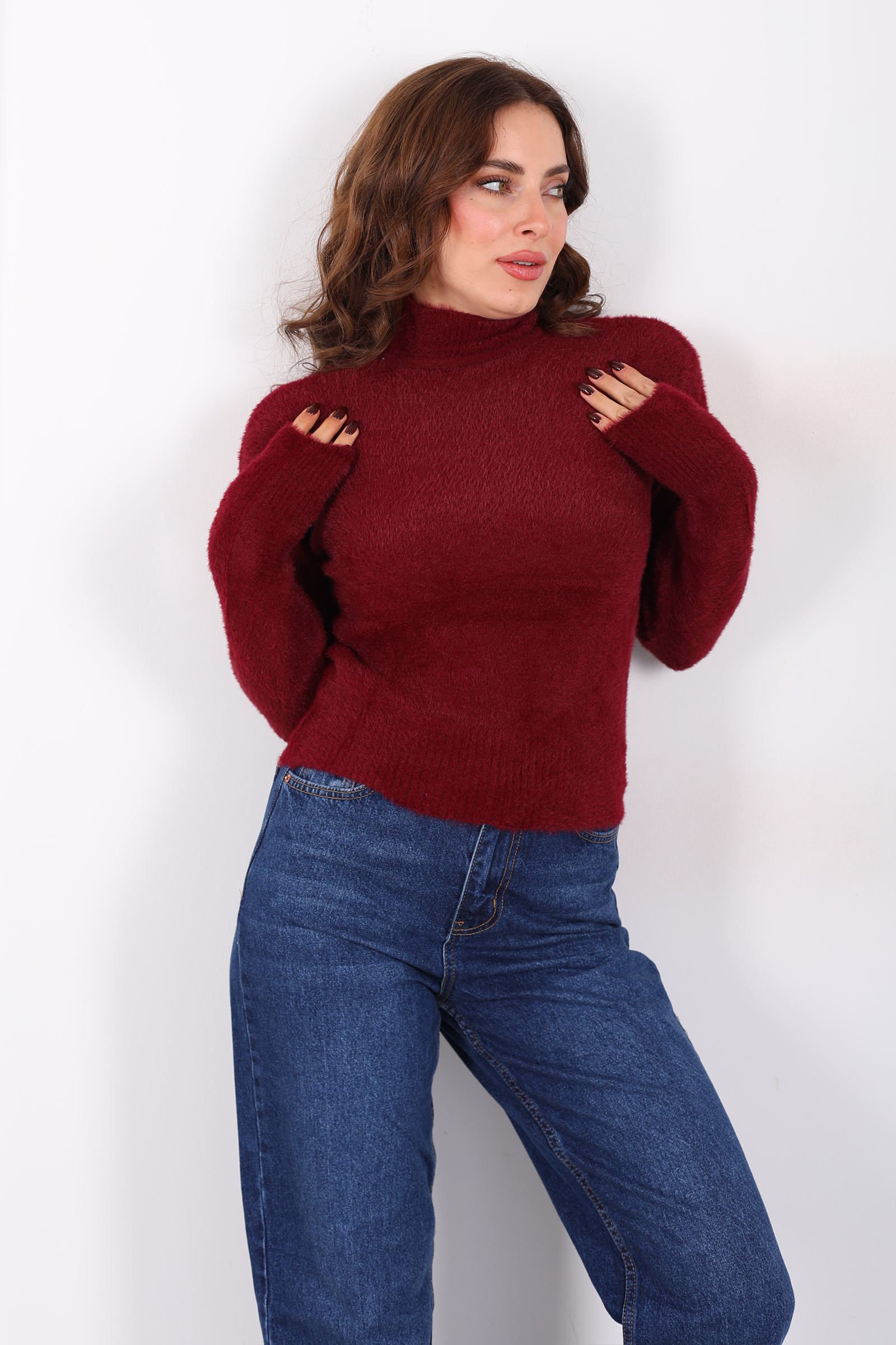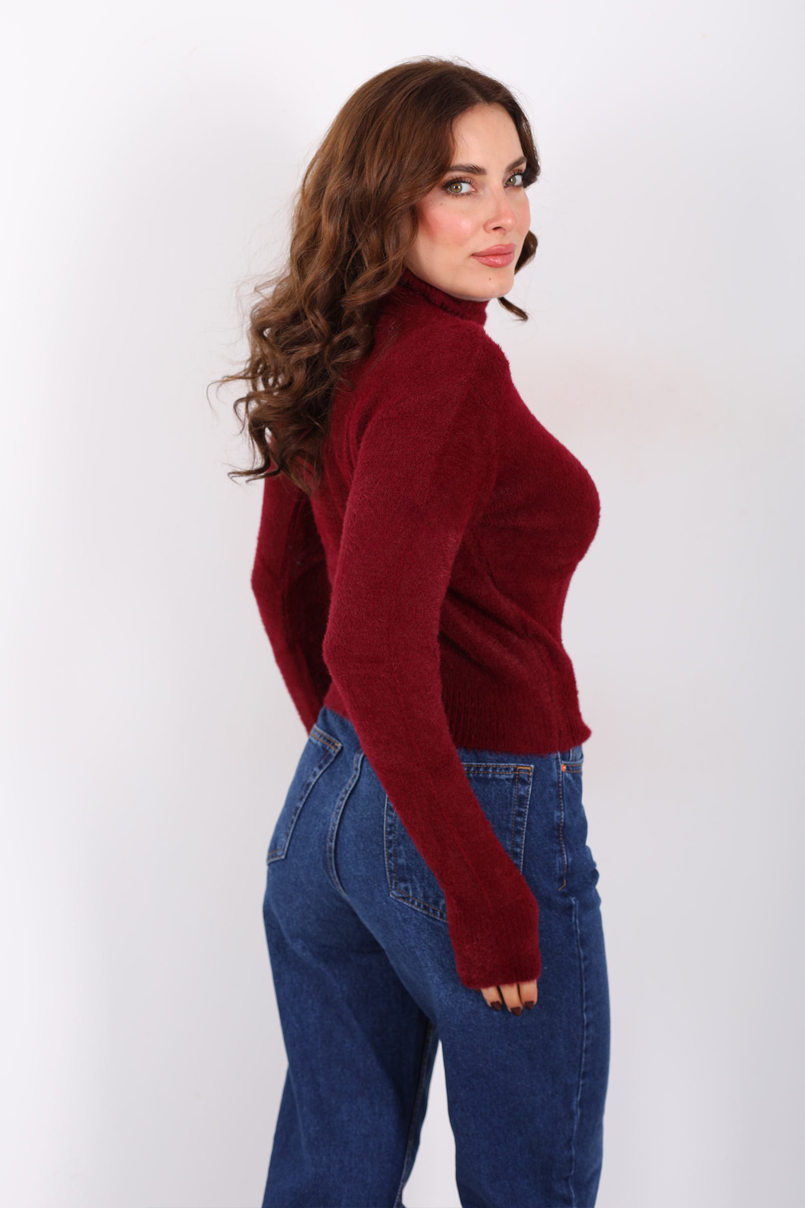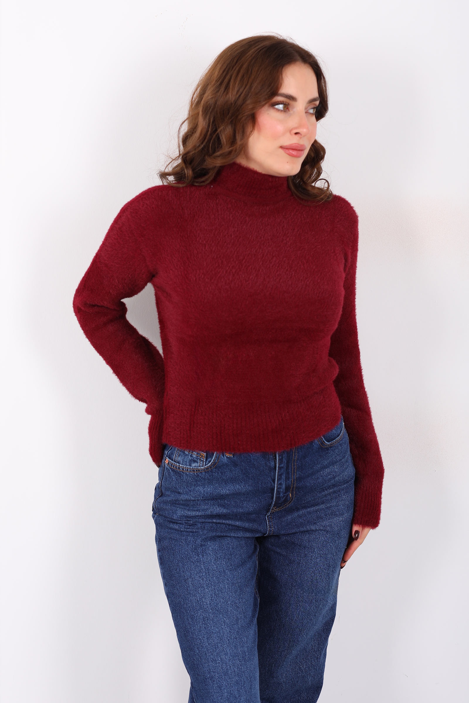 Dik Yaka Sakallı Yumoş Bordo Kadın Triko Kazak