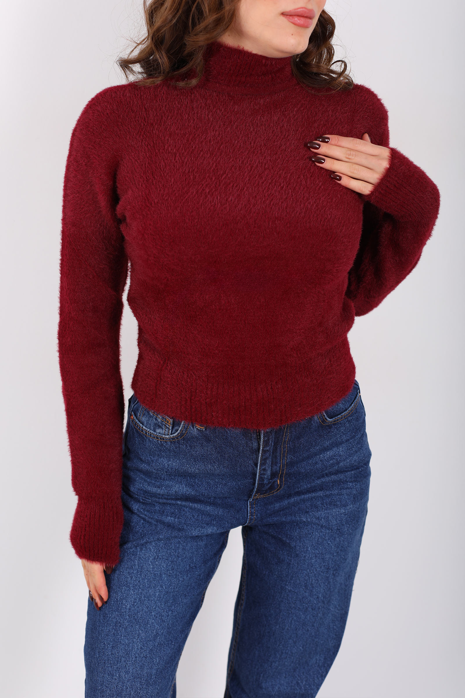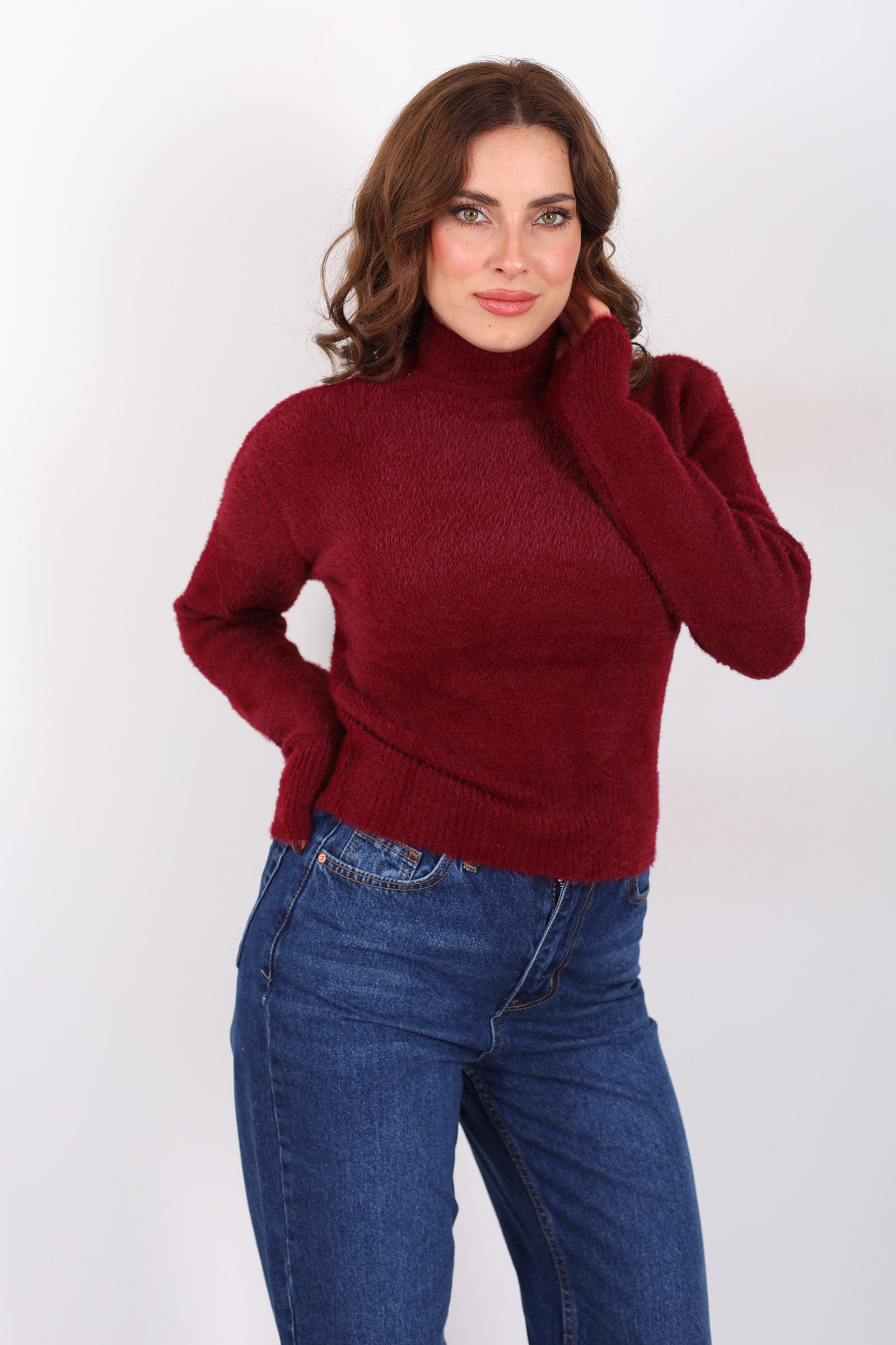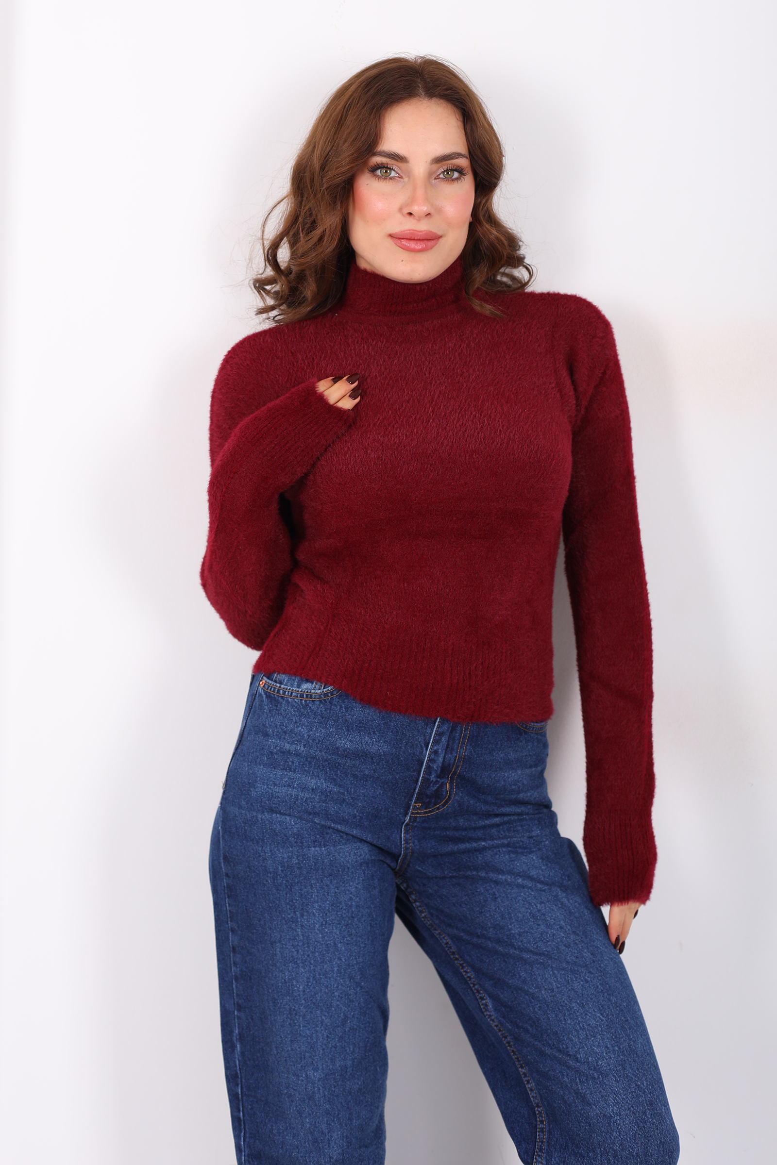 Dik Yaka Sakallı Yumoş Bordo Kadın Triko Kazak