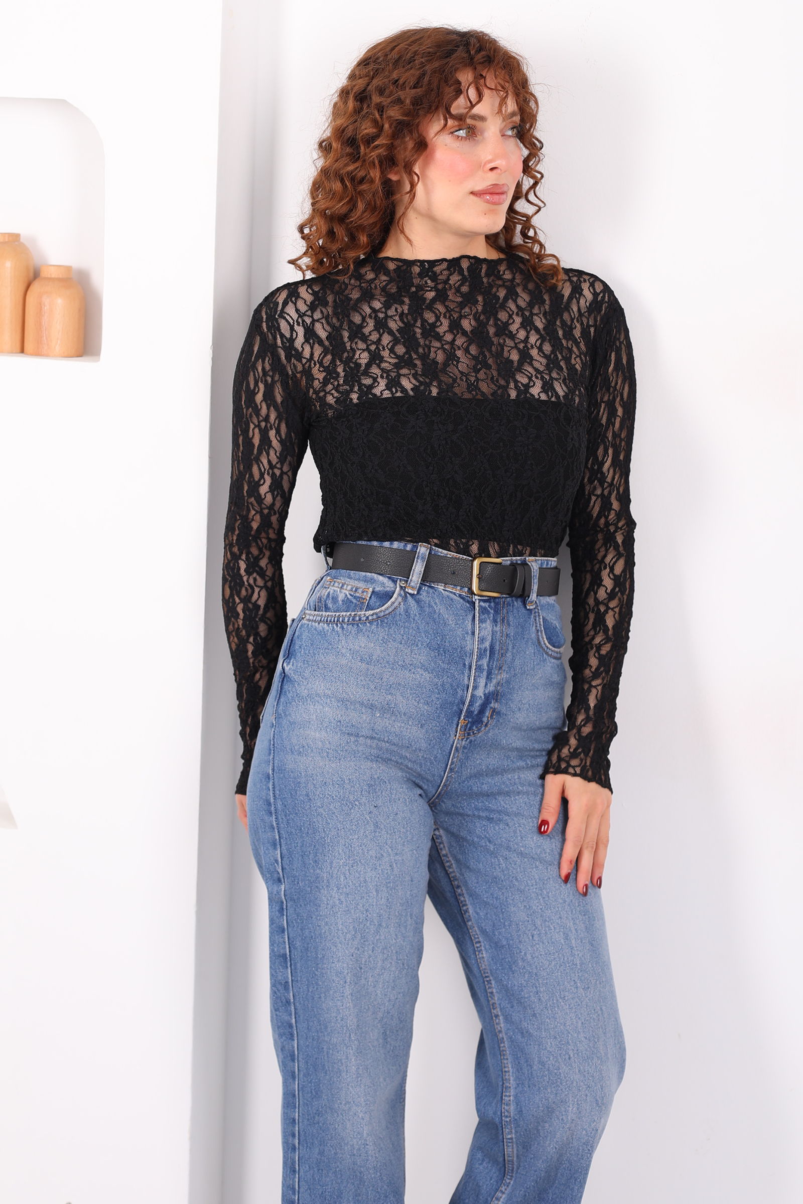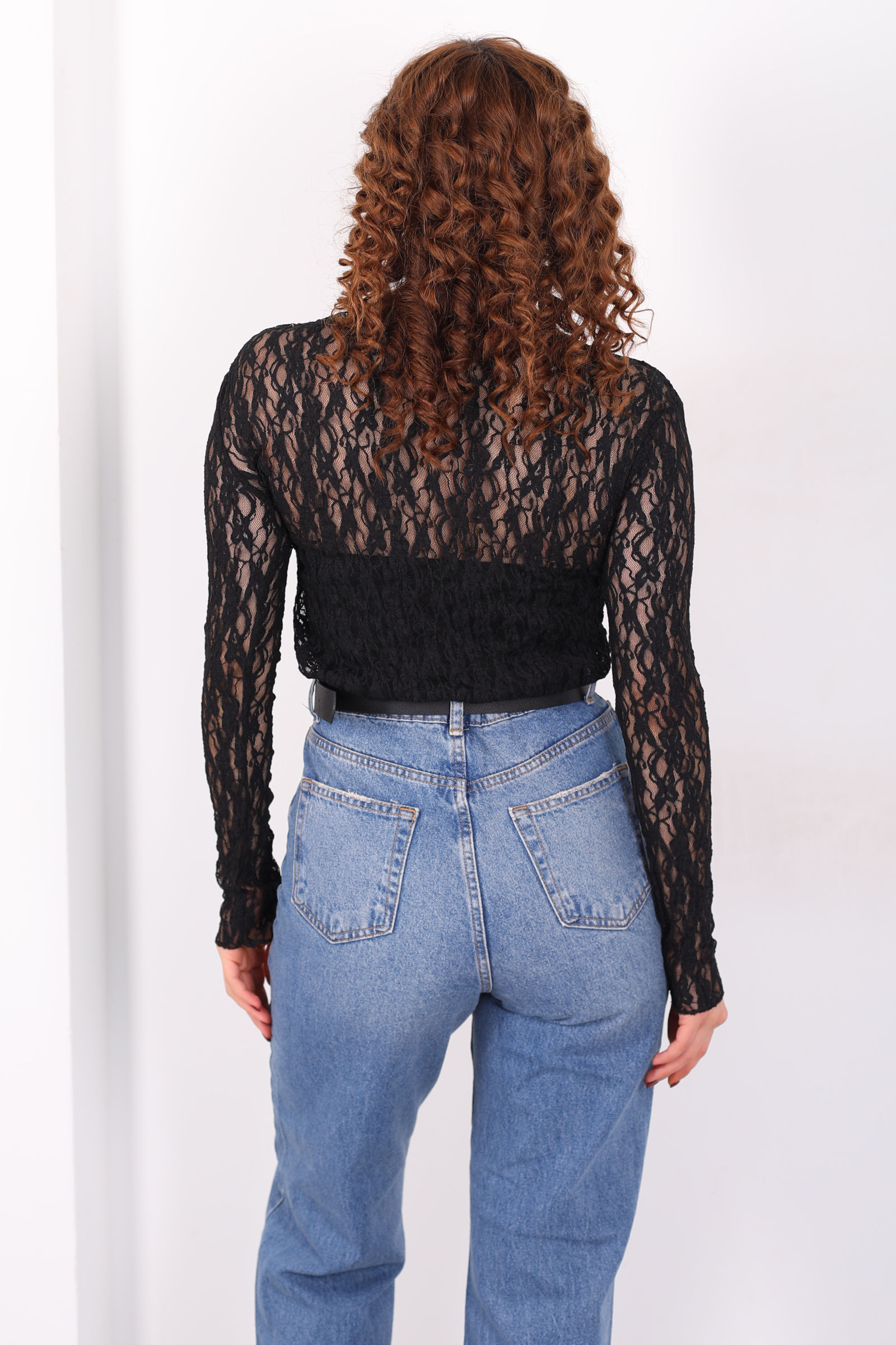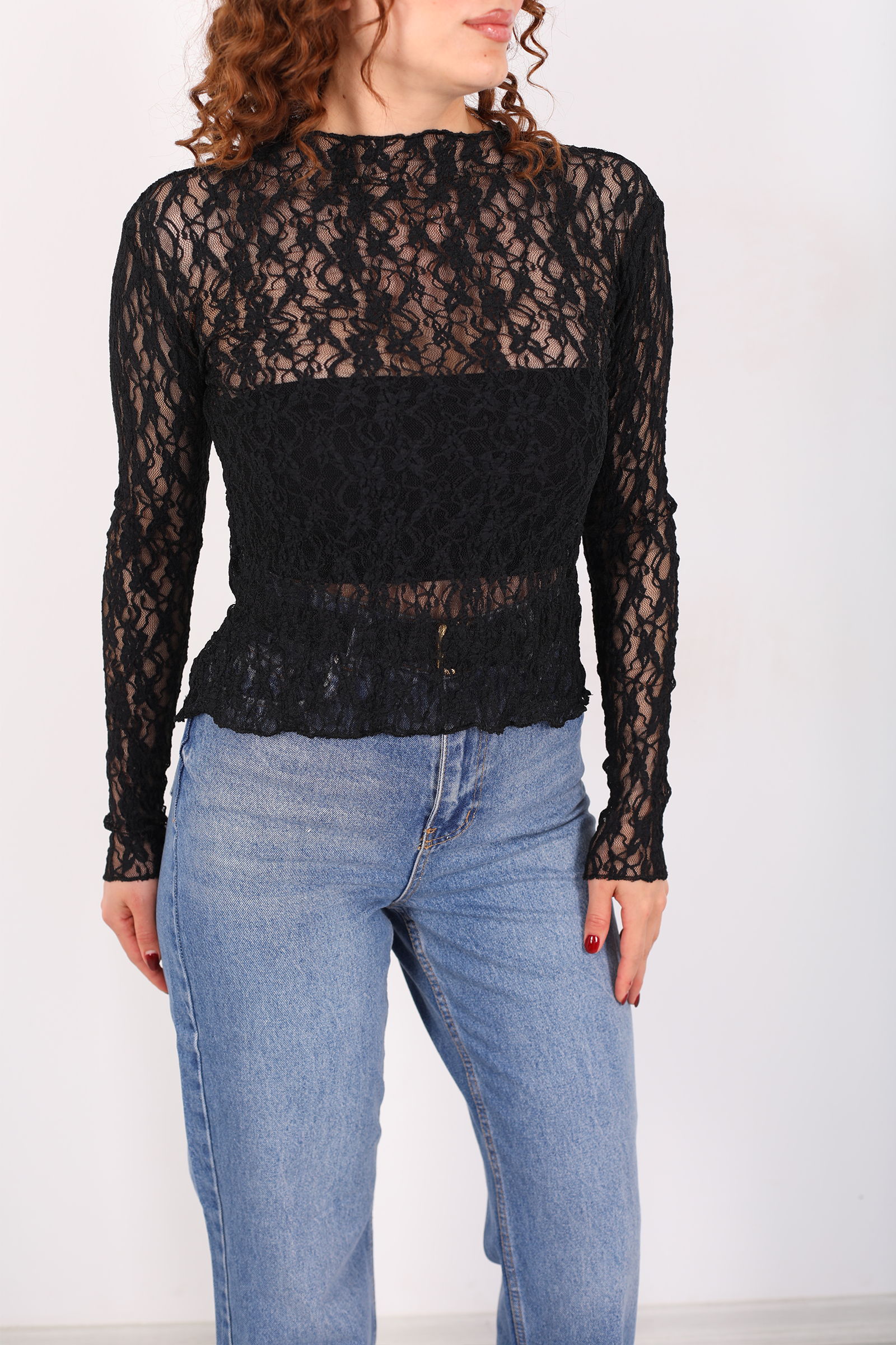 Dik Yaka Siyah Kadın Dantel Bluz