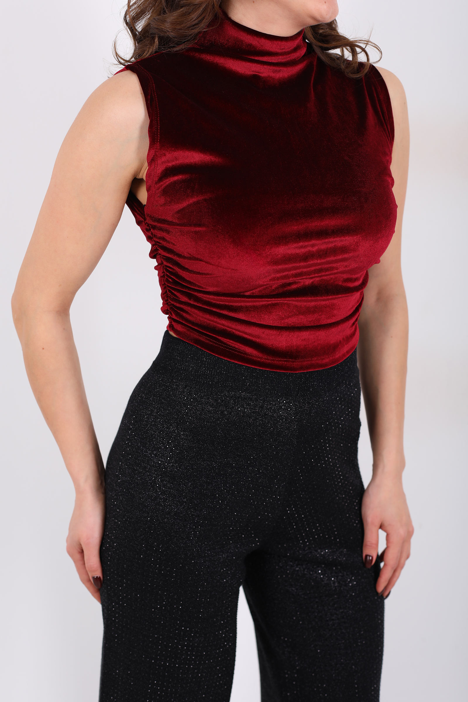 Dik Yaka Yanları Büzgülü Bordo Kadın Kadife Kolsuz Bluz