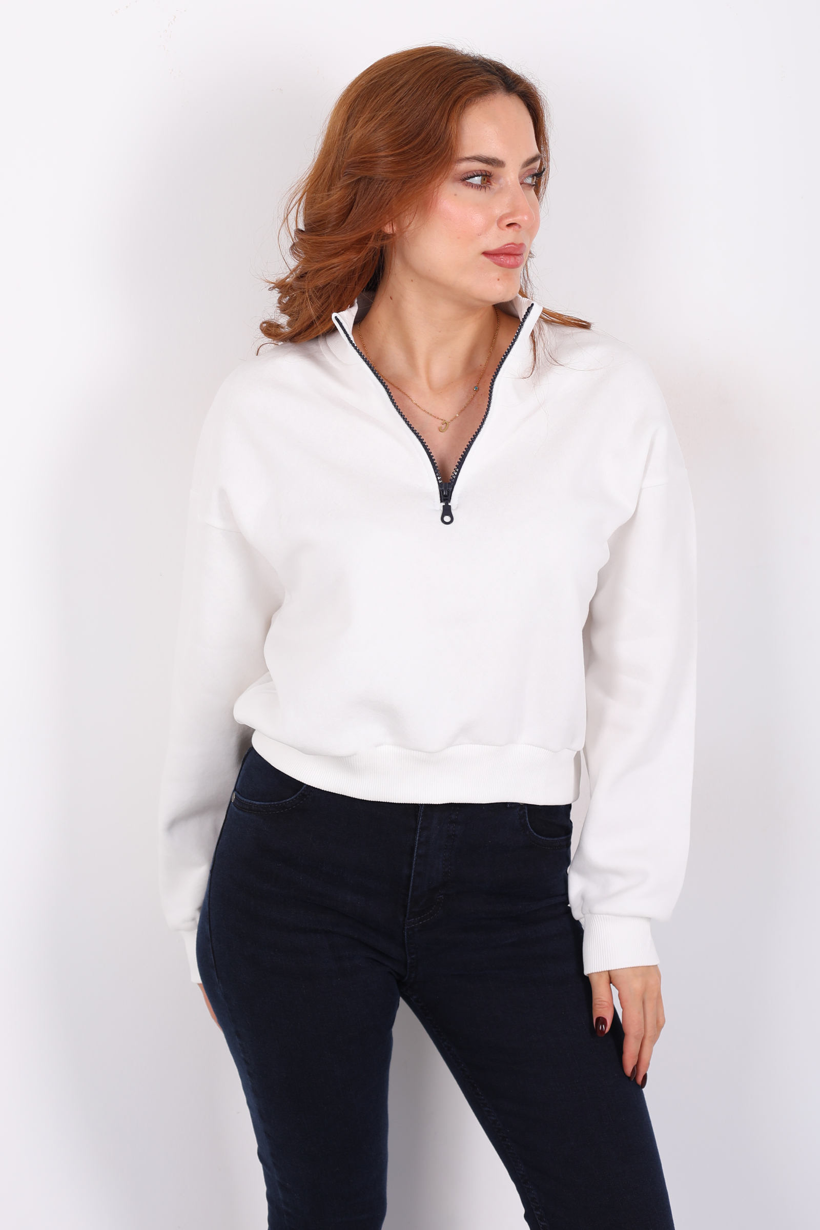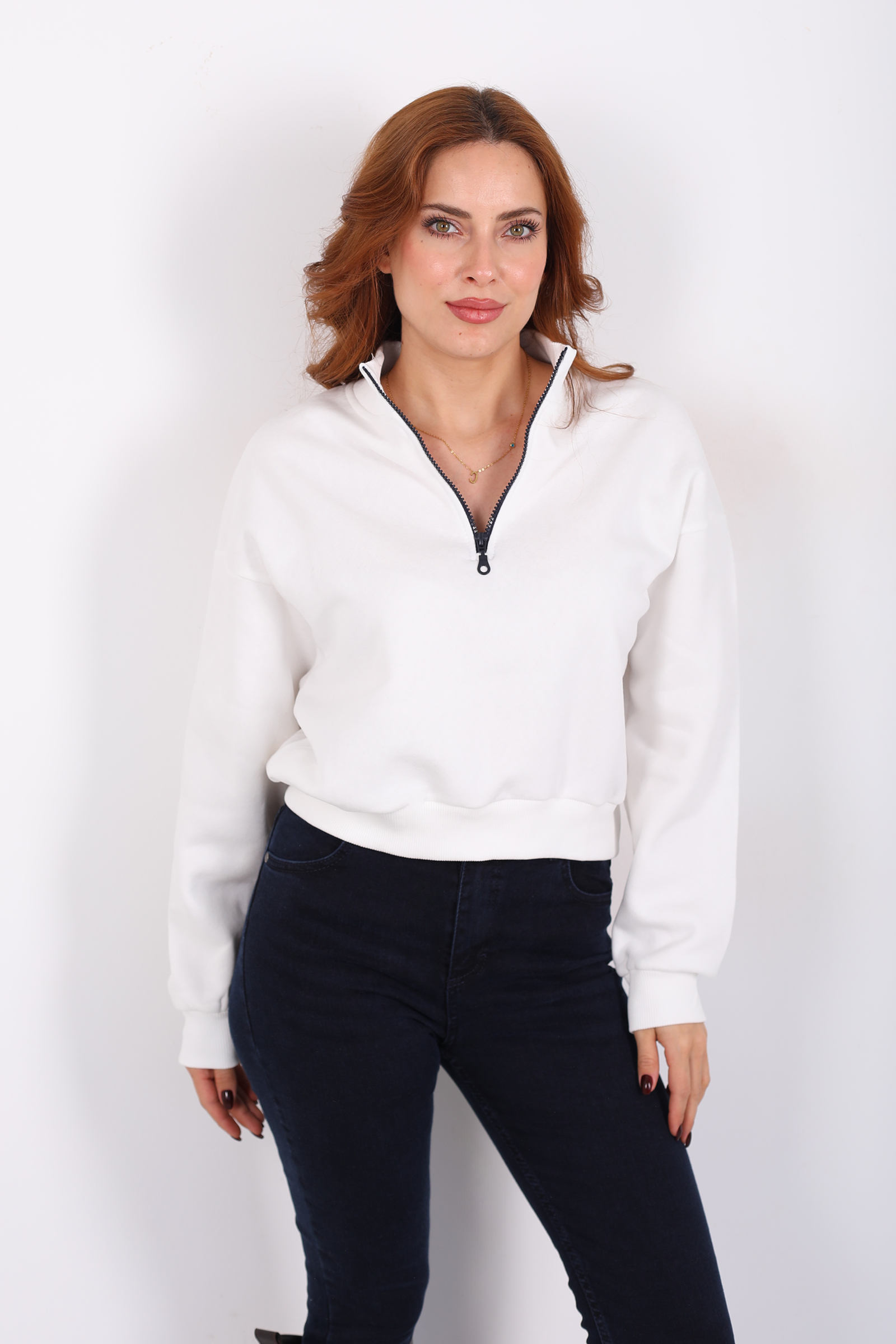 Dik Yaka Yarım Fermuarlı Beyaz Kadın Üç İp Sweat