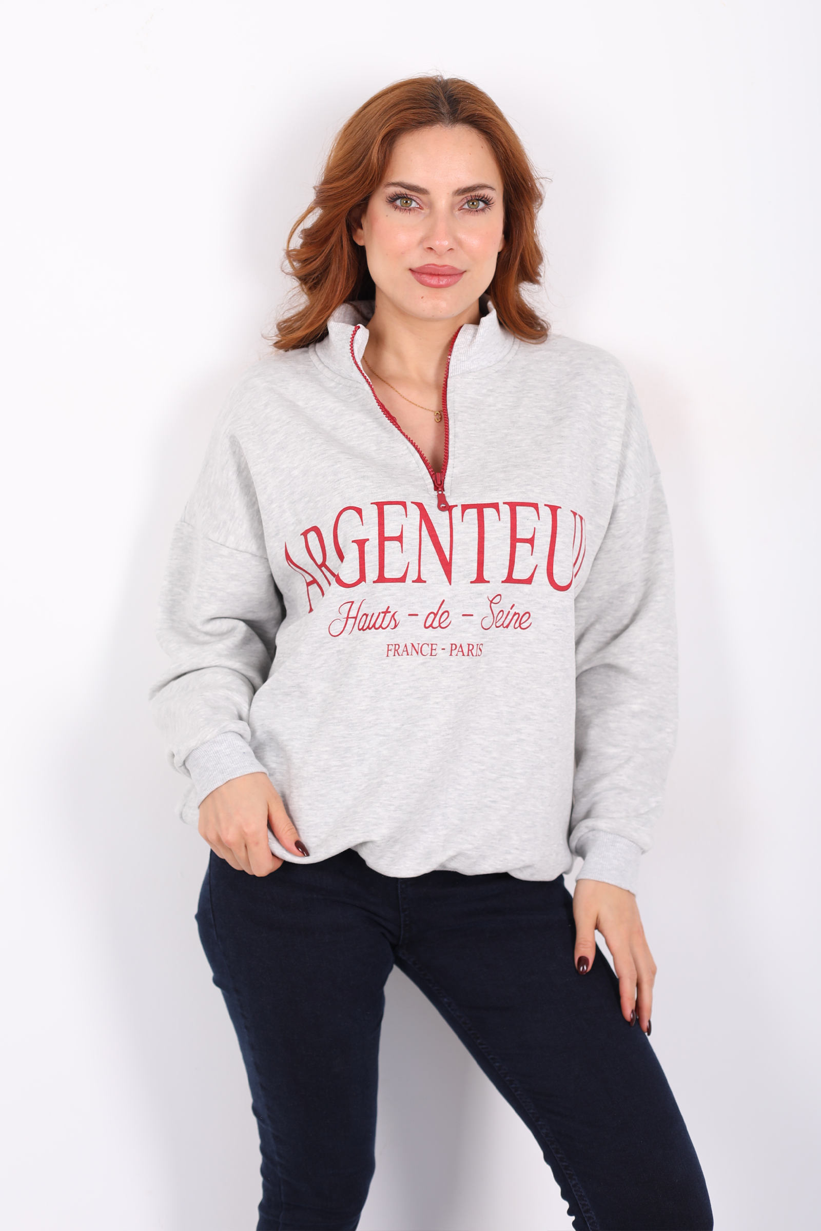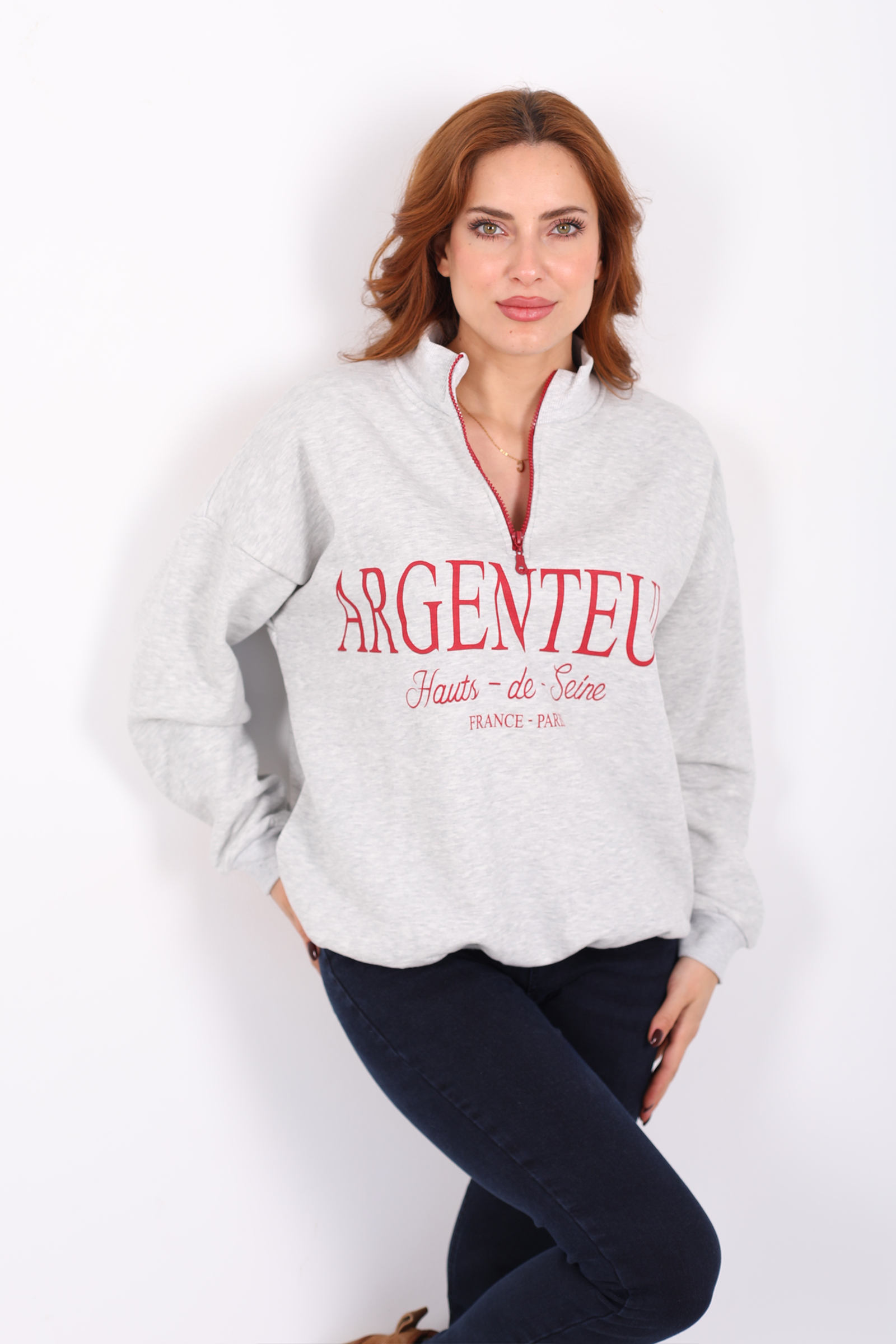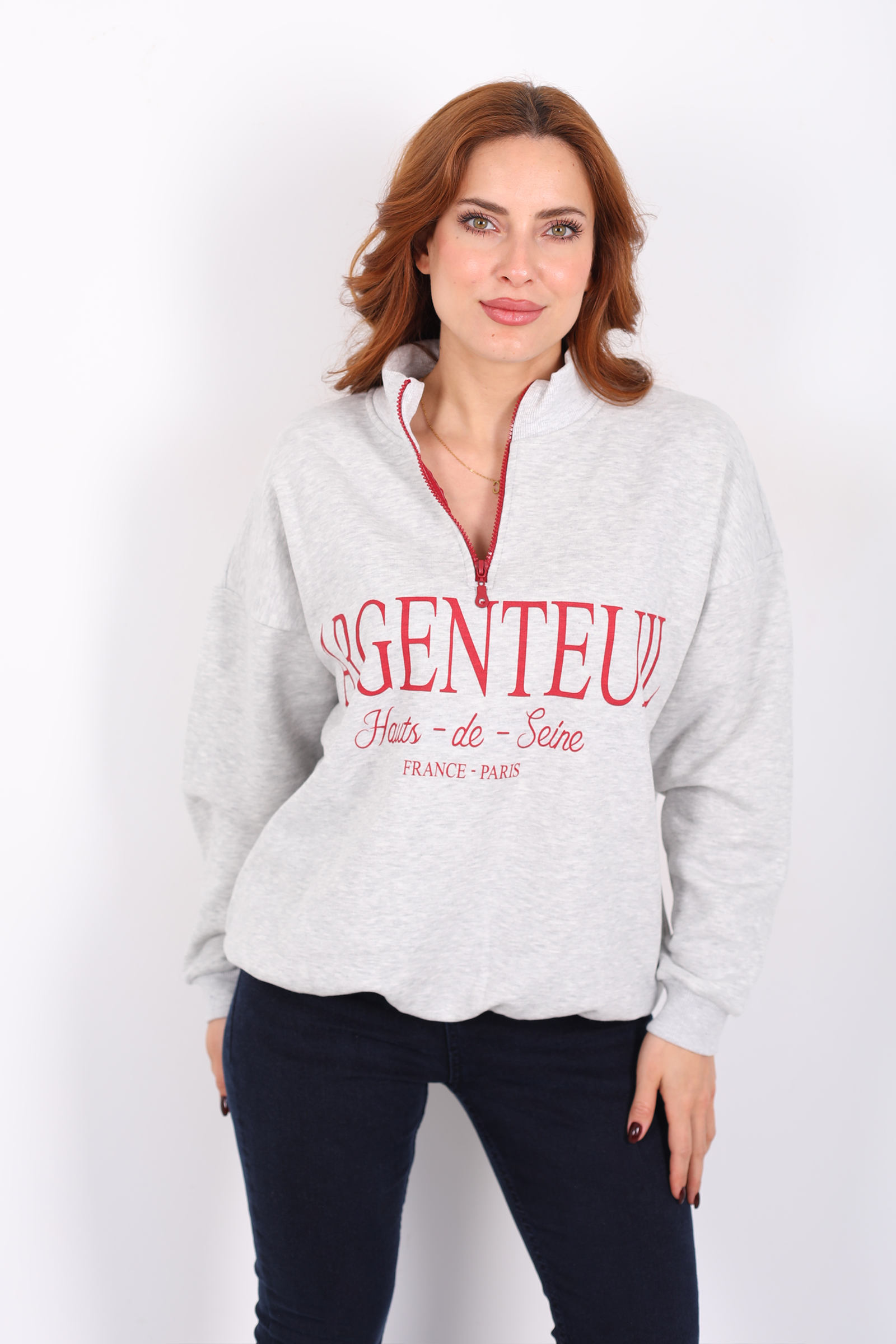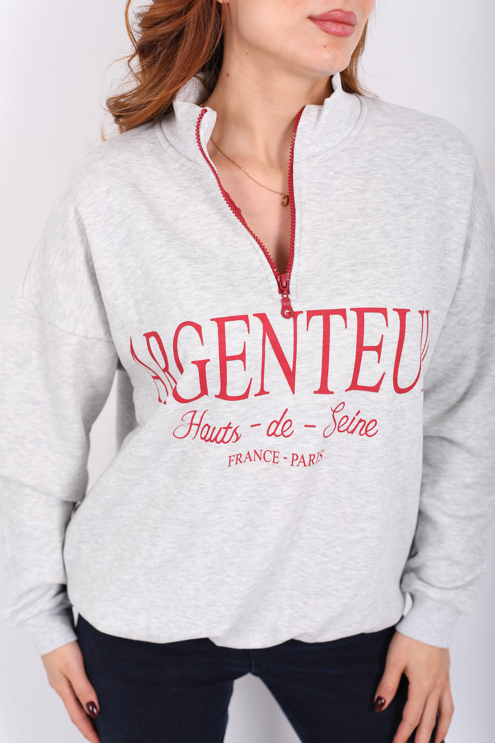Dik Yaka Yarım Fermuarlı Gri Kadın Baskılı Sweat
